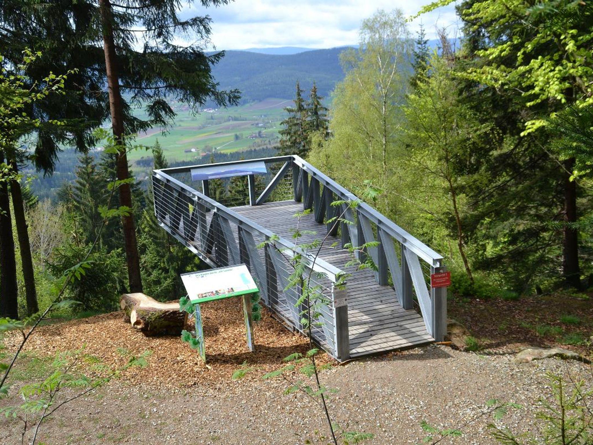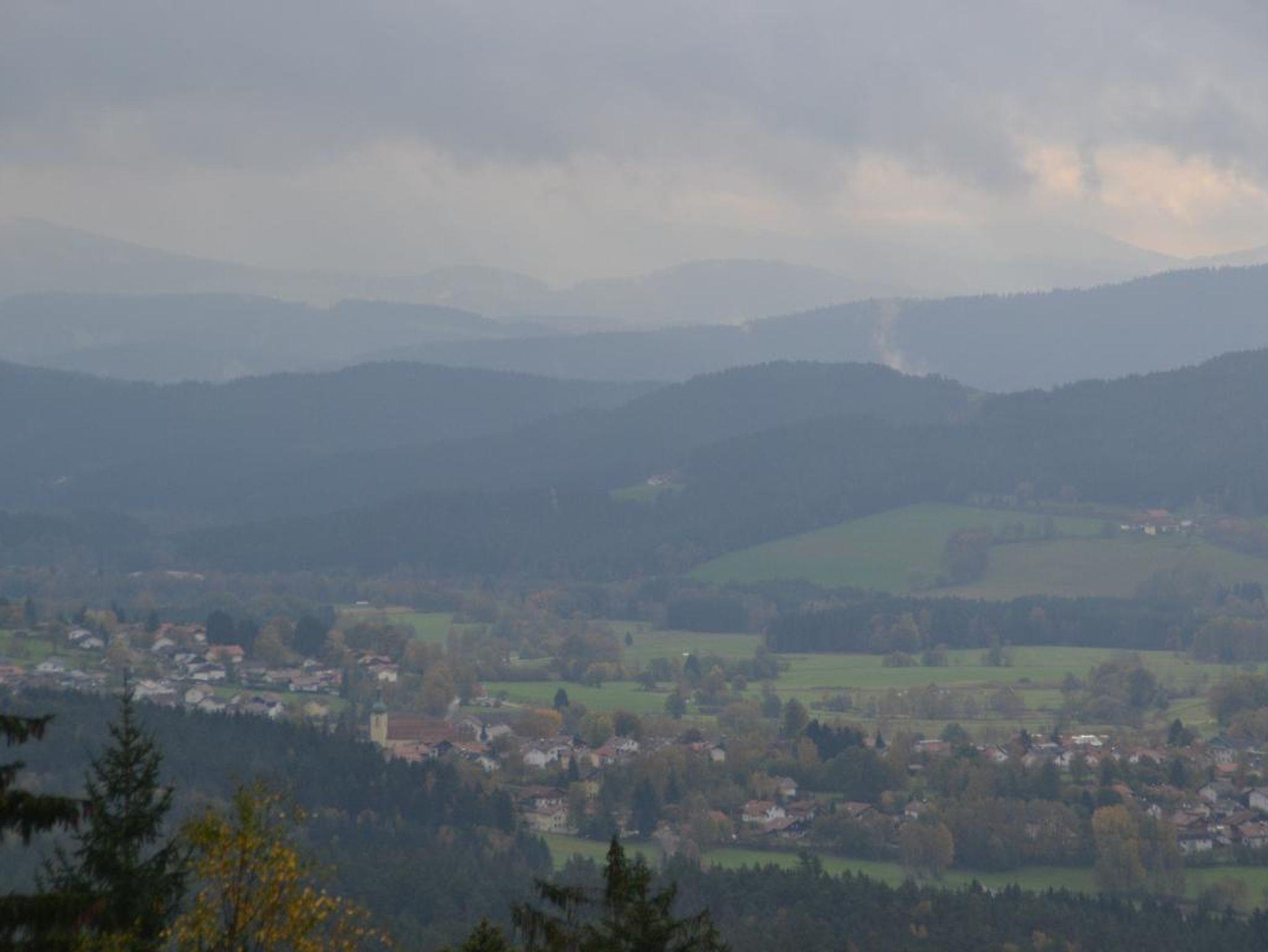 Aussicht auf Wiesen, Wälder, den Kaitersberg mit dem Mühlriegel.