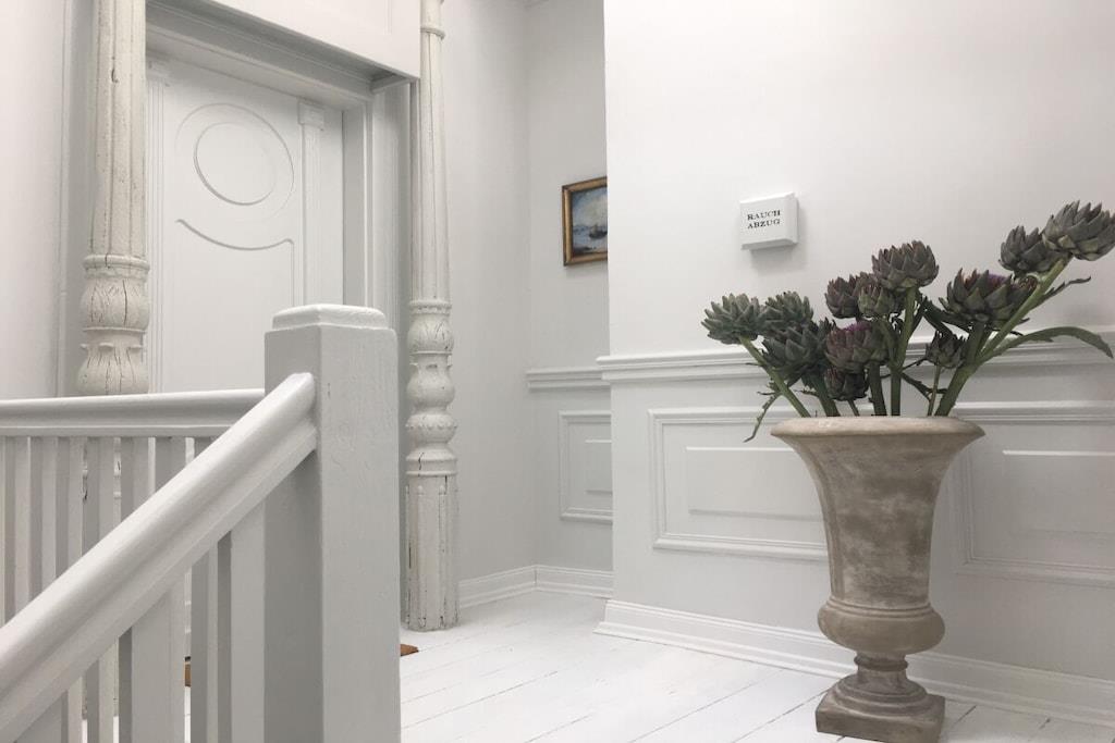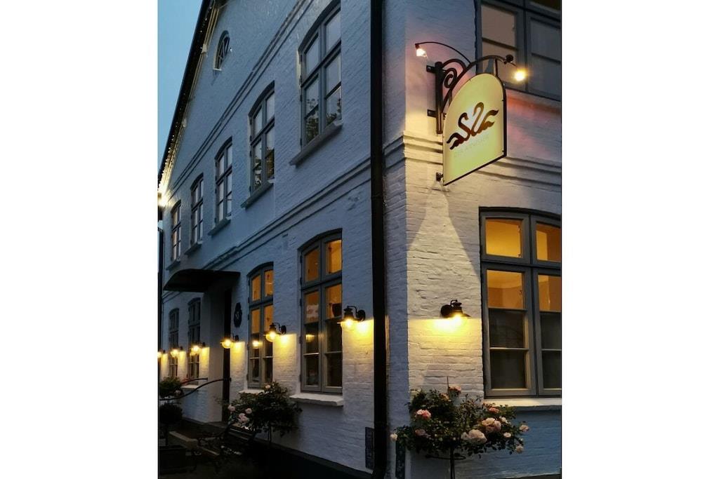 Romantisch wohnen auf besondere Art. Entzückende, lichtdurchflutete Ferienwohnung im 1. OG für max. 4 Personen ganz im Stil des Shabby Chic. Nordische Antiquitäten in hellen Tönen, wunderschöne Stoffe und gemütliche Sitzmöglichkeiten machen diese Ferienwohnung zu etwas ganz besonderem. Historische Elemente geben der Wohnung einen unverwechselbaren Flair. 2019/20 wurde das denkmalgeschützte Stadthaus " Der Arnisser", in dem sich die Wohnung befindet, aufwändig saniert, ohne seinen historischen Charme eingebüßt zu haben. Von der Eingangstür der Wohnung gelangen Sie in die große & helle Küche mit integrierter Kücheninsel. Im angrenzenden Wohnzimmer können Sie es sich vor dem Kaminofen auf einem grossen Schlafsofa für 2 Personen oder dem kompfortablen Sessel gemütlich machen. Des Weiteren gibt es einen ausklappbaren Esstisch mit 4 Sitzmöglichkeiten. Durch 3 grosse Fenster ist es sehr hell und sonnig - der weisse alte Dieleboden trägt ebenfalls dazu bei. Vom Schlafzimmer aus - mit dem traumhaften Himmelbett und extra hohen & bequemen Matratzen - haben Sie einen Blick auf die Marina von Arnis. Das Bad en suite verfügt über eine Badewanne von der Sie auf die Marina blicken können sowie einer separaten grosszügigen Dusche. Handtuchwärmer sowie Handtücher & Föhn sind vorhanden.
