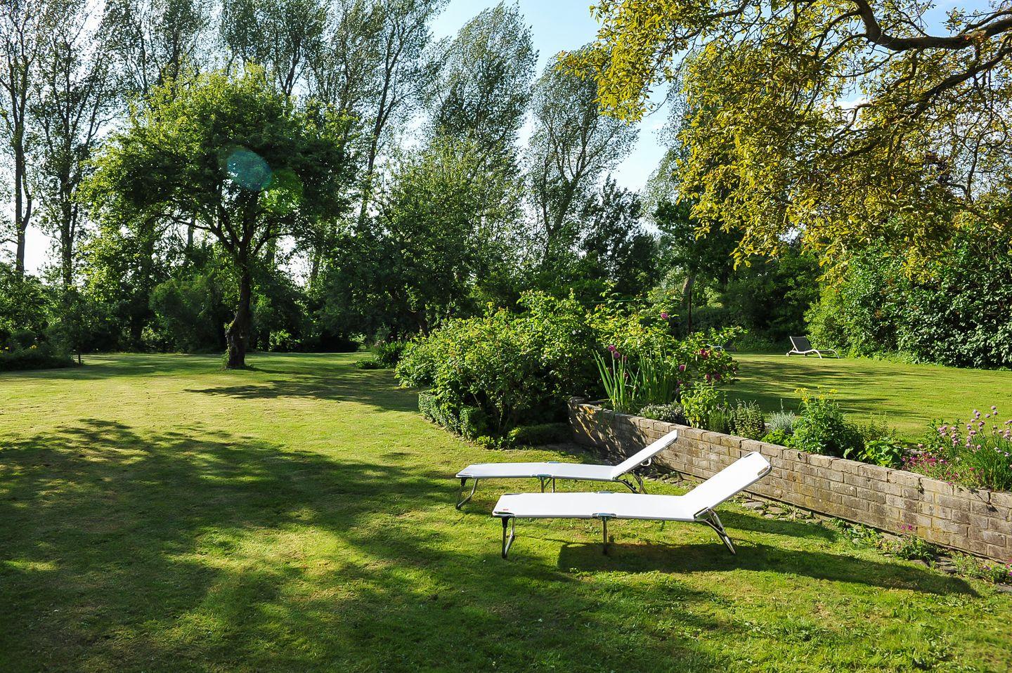Im Außenbereich erwartet Sie eine eigene Terrasse mit Gartenmöbeln und Sonnenschirm – perfekt für entspannte Stunden im Freien. Der Gemeinschaftsgarten mit Teich lädt zum Verweilen ein und bietet eine Liegewiese mit Sonnenliegen für sonnige Tage am Schlei-Strand, der nur 250 Meter entfernt liegt.