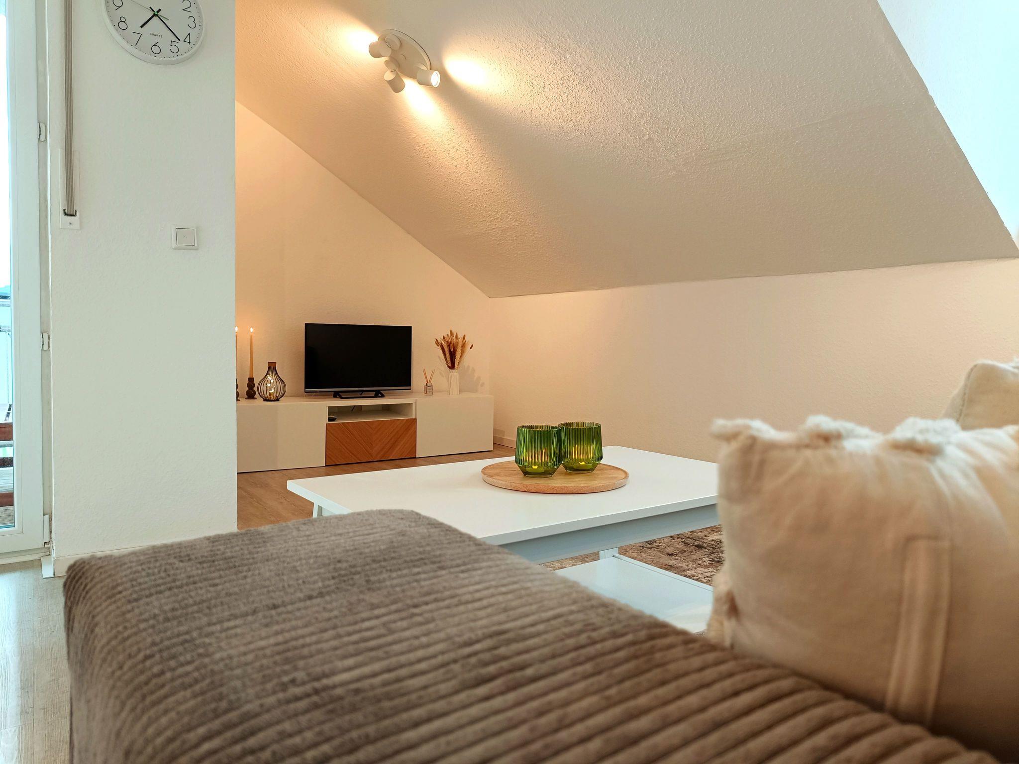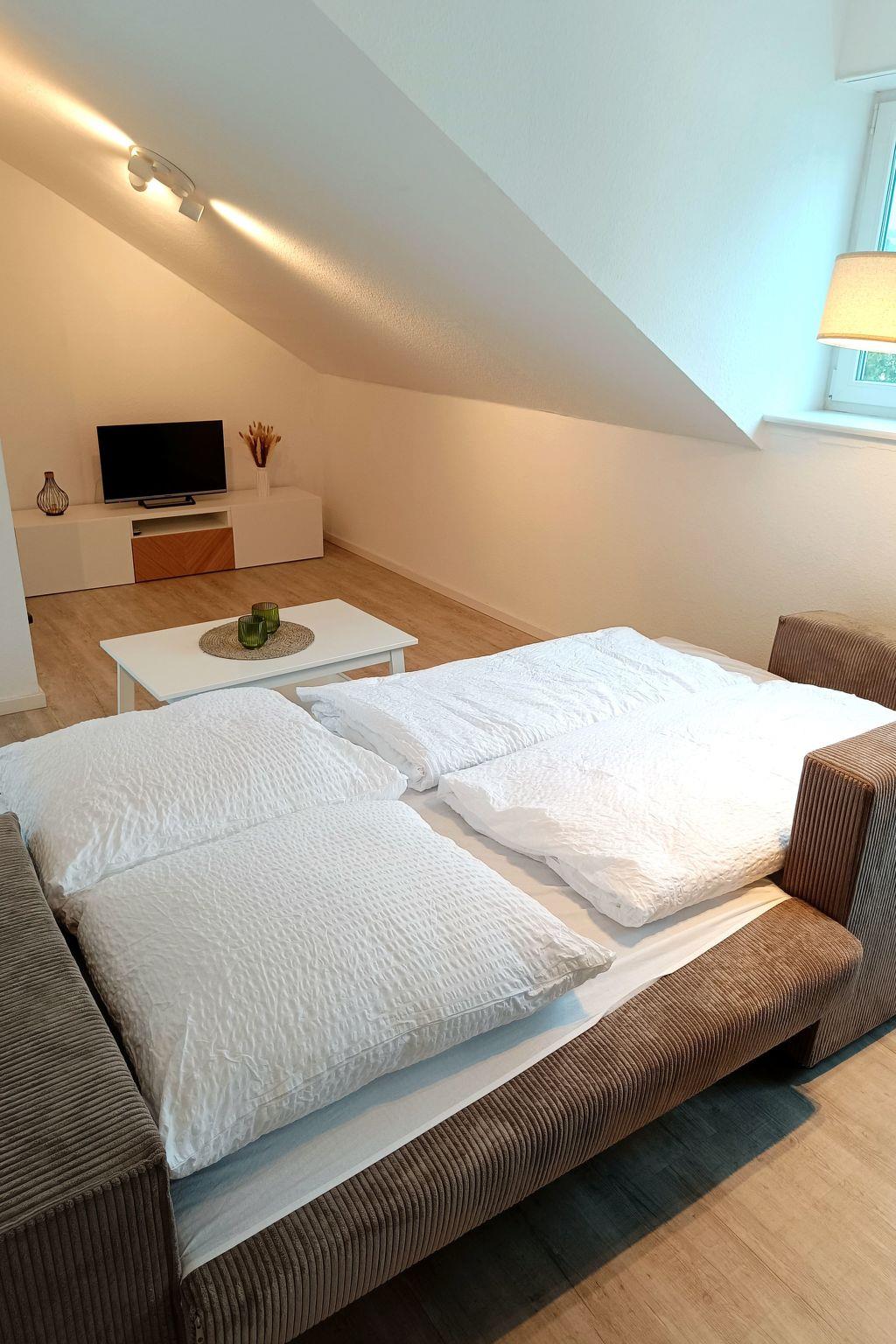Innen wartet die Wohnung mit einer durchdachten Ausstattung auf Sie, die Ihren Aufenthalt so angenehm wie möglich gestalten soll. Neben einem gemütlichen Boxspringbett, ideal für erholsame Nächte, und einer praktischen Schlafcouch für zusätzliche Schlafmöglichkeiten, finden Sie hier auch einen Arbeitsplatz, sollte während Ihres Urlaubs Arbeit anstehen. Die Wohnung verfügt über eine Waschmaschine zur alleinigen Nutzung, was besonders bei längeren Aufenthalten vorteilhaft ist. Für kulinarische Erlebnisse sorgt die voll ausgestattete Küche inklusive Cerankochfeld, Filter-Kaffeemaschine, Spülmaschine und Wasserkocher – ideal, um den Tag mit einem selbst zubereiteten Frühstück zu beginnen.