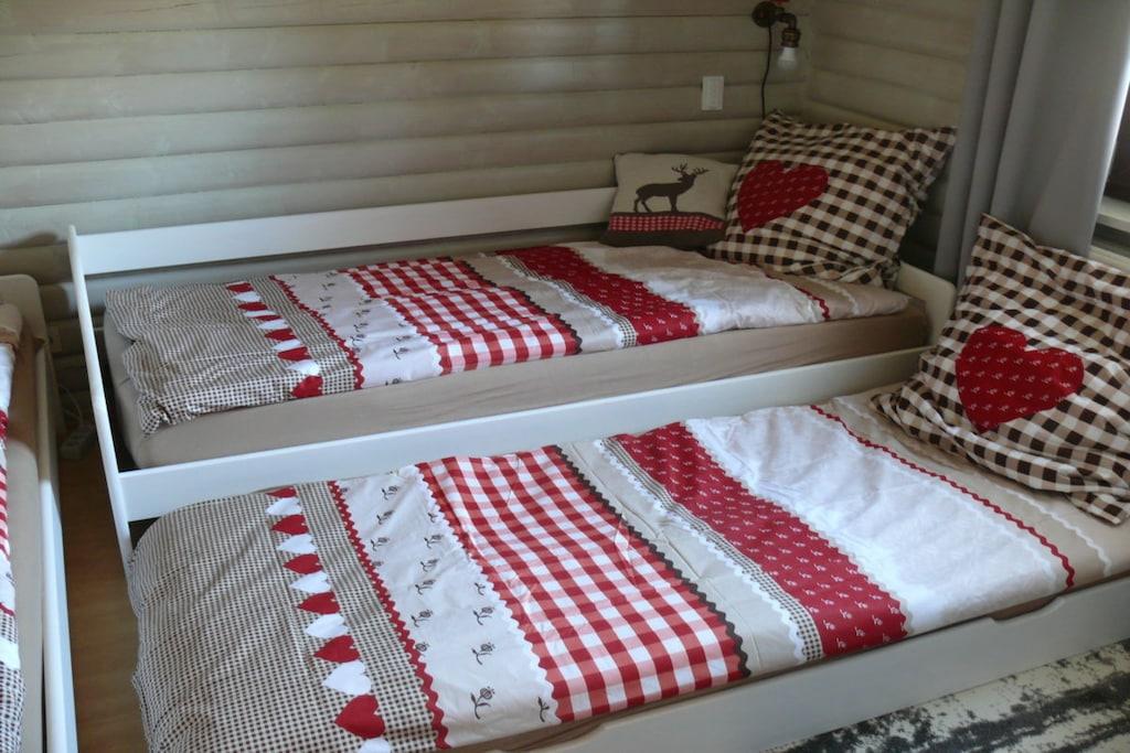 In der 1. Etage: (Wohnzimmer(TV, DVD-Spieler, Radio, CD-Spieler), Küche(TV, Esstisch, Wasserkocher, Toaster, Kaffeemaschine, Backofen, Mikrowelle, Spülmaschine, Kühlschrank, Tiefkühlschrank), Schlafzimmer(Doppelbett, TV, DVD-Spieler, Kinderbett), Kinderzimmer(Einzelbett, Einzelbett, TV, DVD-Spieler, Radio, Kinderbett, Hochstuhl), Badezimmer(Dusche, Waschbecken, Toilette, Waschmaschine, Föhn)) In der 2. Etage: (Schlafzimmer(Doppelbett, TV), Badezimmer(Badewanne, Waschbecken, Toilette, Föhn)) Grill, Gartenmöbel, Sonnenschirm, Markise
