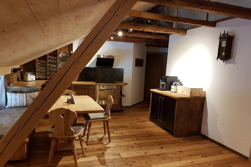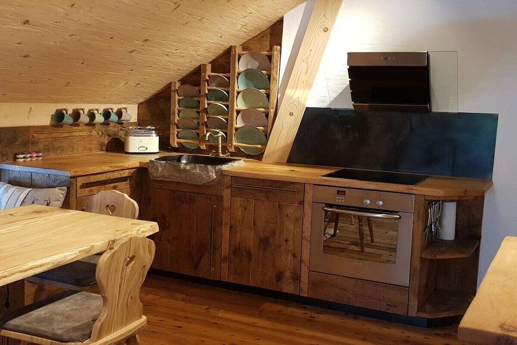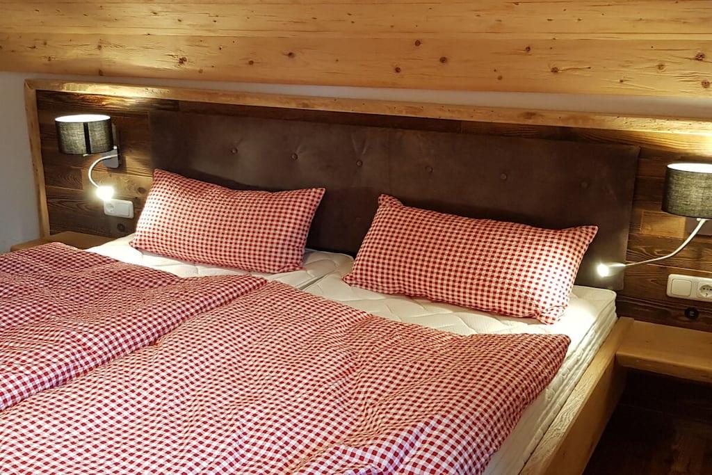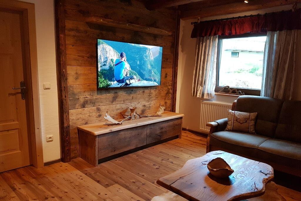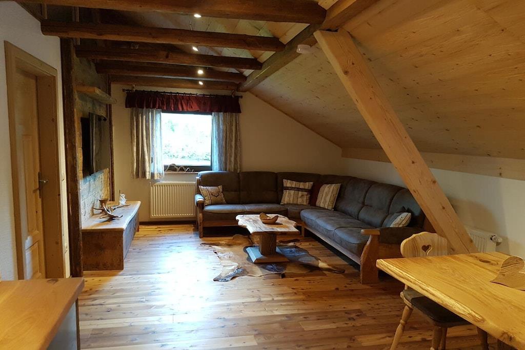 Unsere Ferienwohnung Waidlersuite im Chalet-Stil bietet Platz für 4 Personen. Das verarbeitete Massivholz macht diese Wohnung warm und gemütlich. Es erwartet Sie ein modernes Badezimmer mit Dusche und WC, ein Zirben-Schlafzimmer, ein Eichen-Schlafzimmer, eine vollausgestattete Küche aus Altholz mit Essbereich und eine großzügige Couch mit Smart-TV. Alle Räume sind beheizbar und mit WLAN ausgestattet. Handtücher und Bettwäsche sind vorhanden. Die Anwendungen im Wellnessstodl müssen frühzeitig gebucht werden und werden separat abgerechnet. Die Sauna und der Whirlpool haben eine Vorlaufzeit von 24 Stunden, da Sauna, Pool und Räume geheizt werden müssen. Der Whirlpool ist von ca. Oktober bis Anfang April in Betrieb.