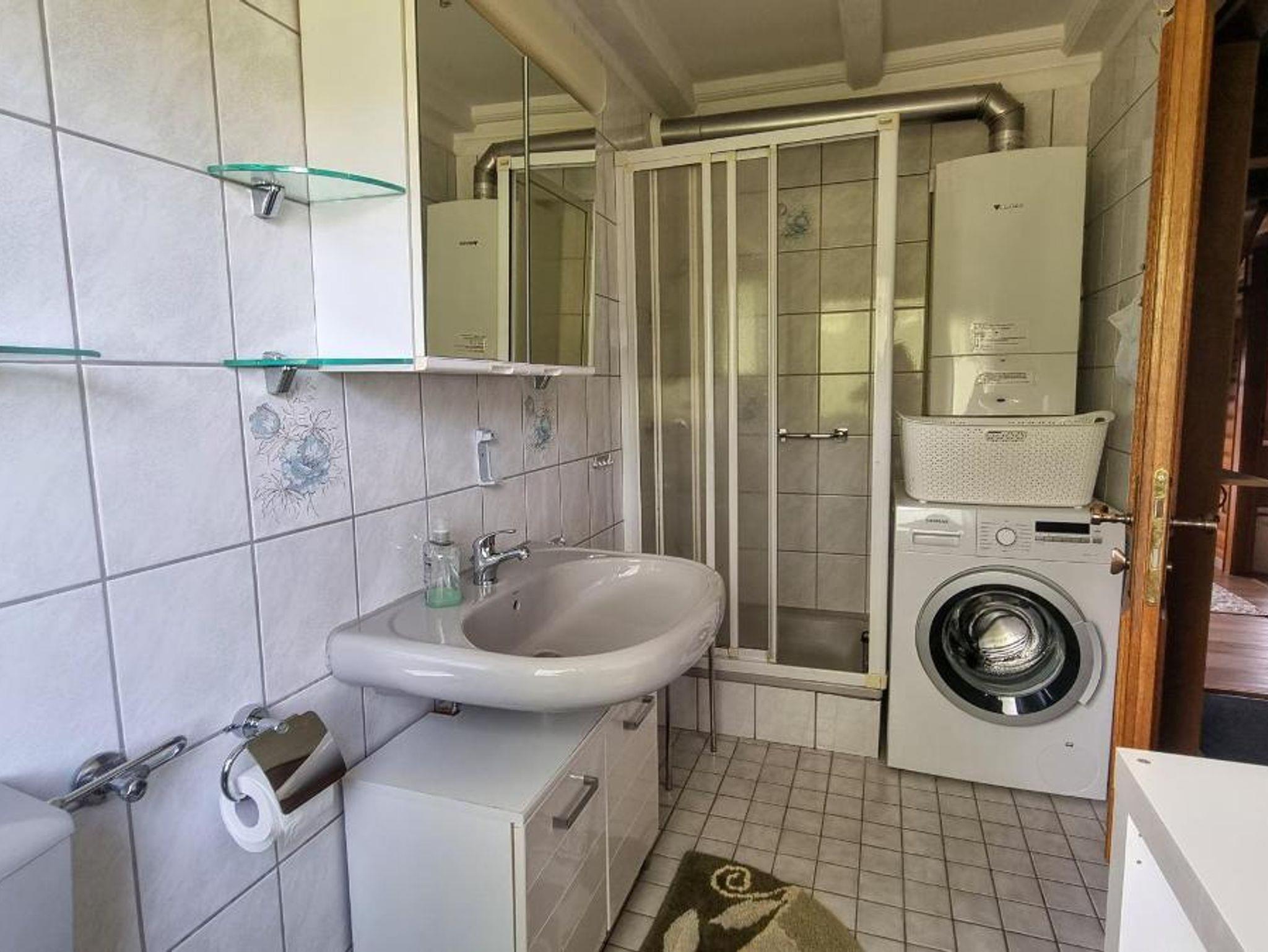 Verfügung. Das Badezimmer mit Dusche, Föhn, Handtüchern, Kosmetikspiegel und Waschmaschine rundet das Gesamtbild ab.