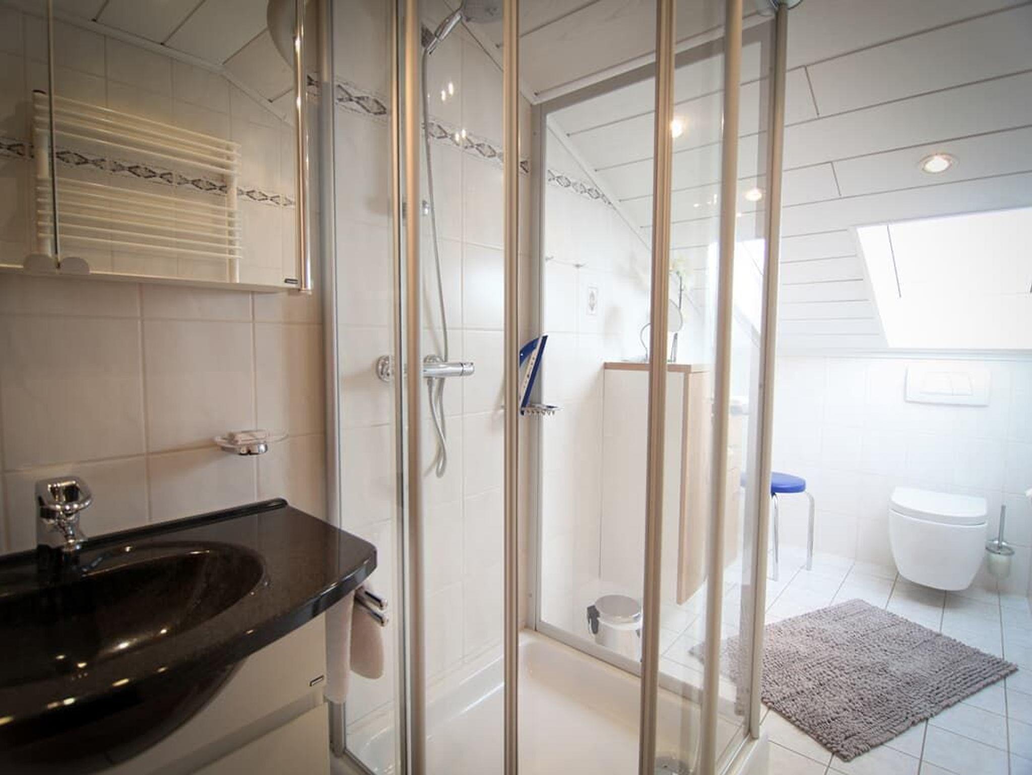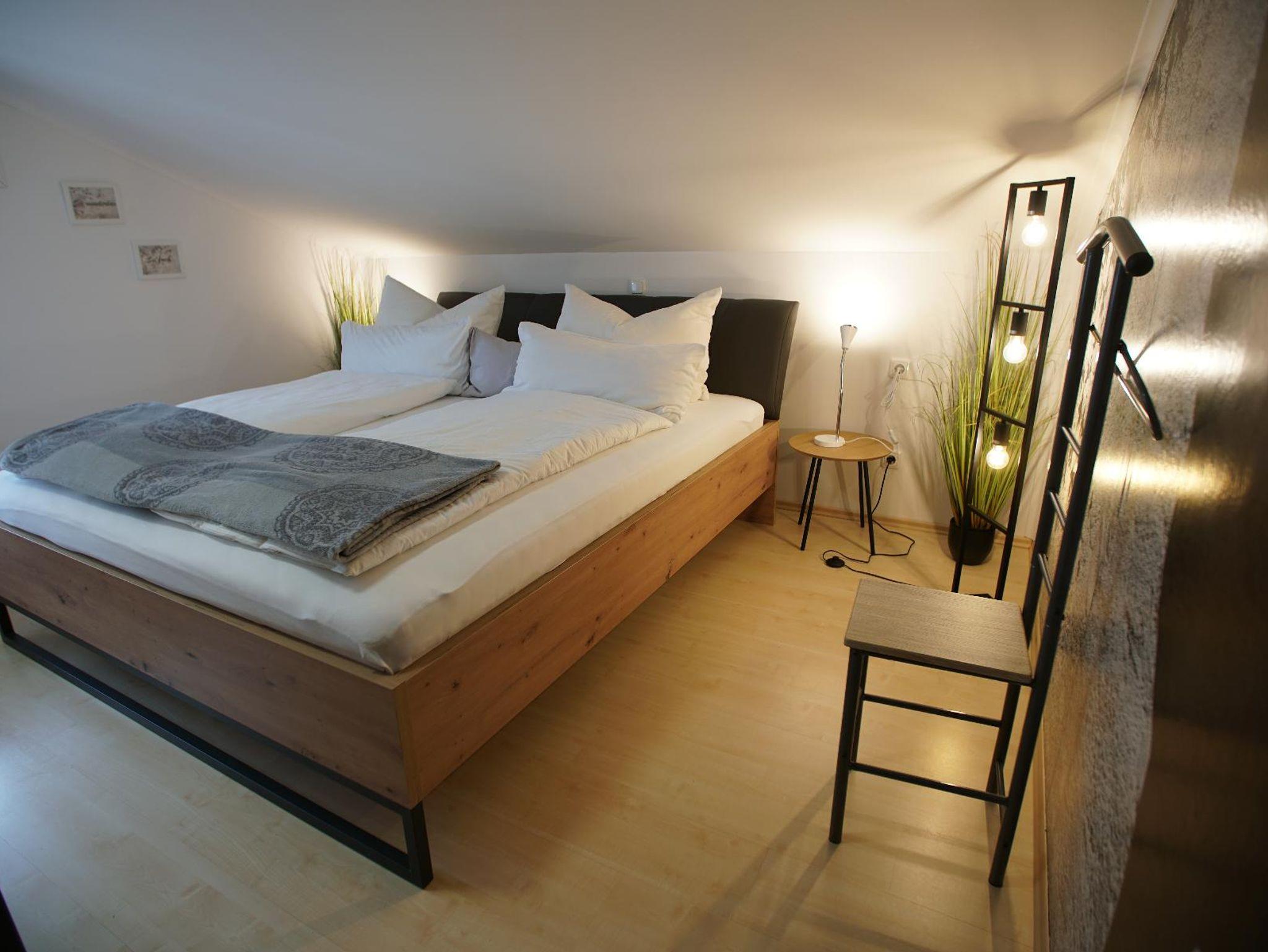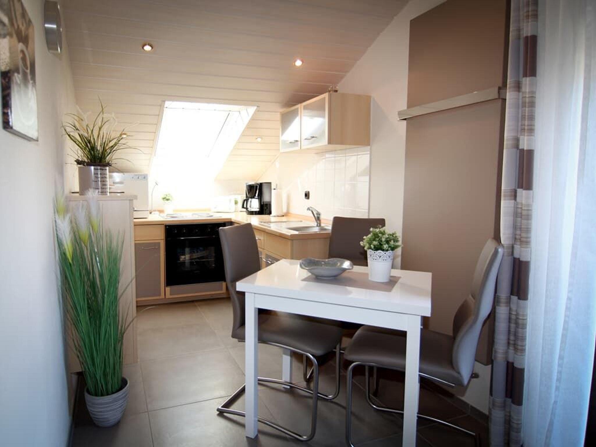 Ein romantisches Appartement unter dem Dach bieten wir unseren Gästen in der oberen Etage des Hauses an. Die Wohnung verfügt über eine schöne, gemütliche Wohnküche mit Zugang zum Balkon, zwei Doppelschlafzimmer sowie ein schnuckeliges Badezimmer in der Mansarde mit Dusche und WC. Bade- und Handtücher mit Fön und Kosmetikspiegel gehören ebenso dazu.