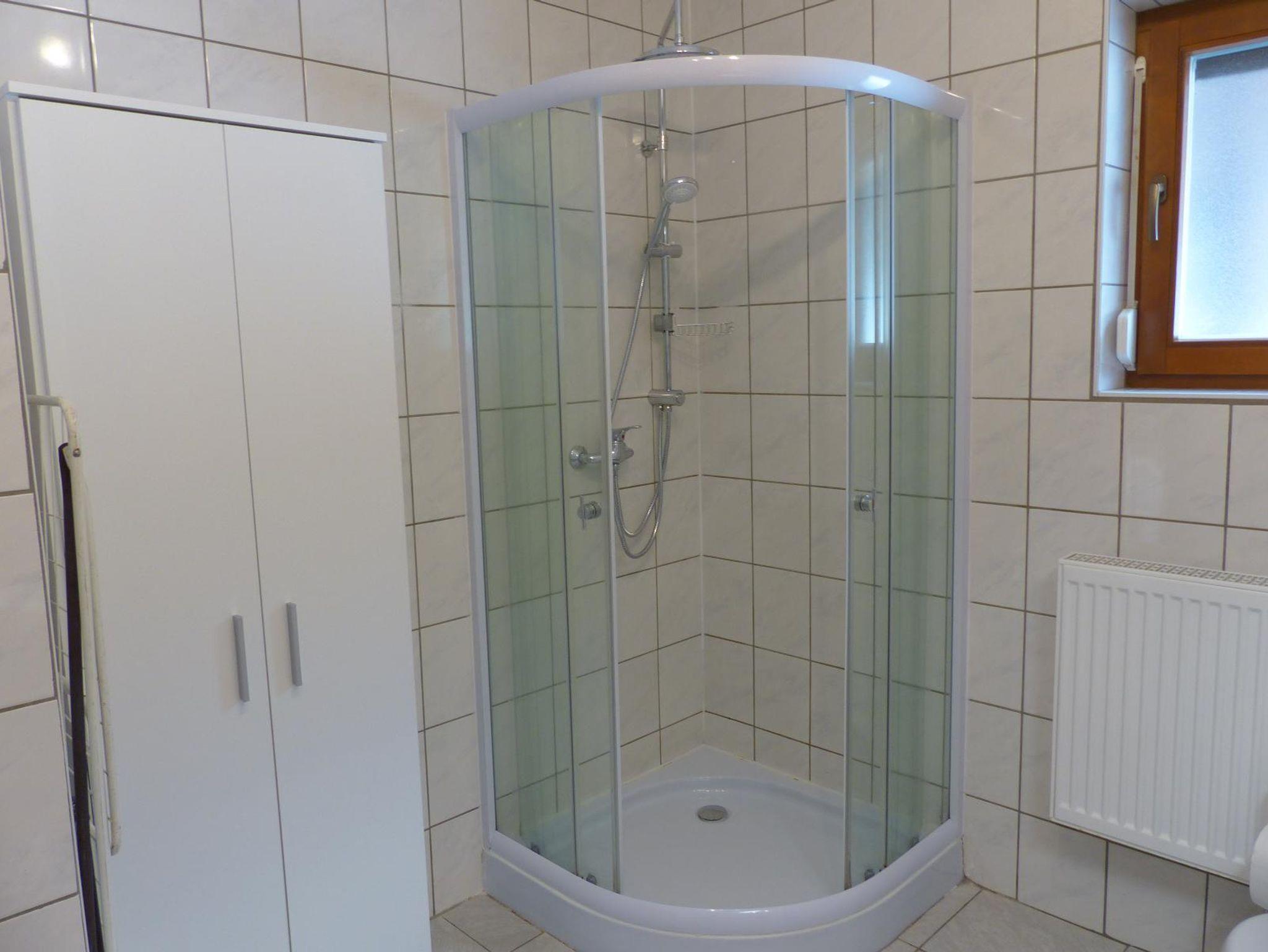 Ein sehr geräumiges Badezimmer mit WC und Dusche.