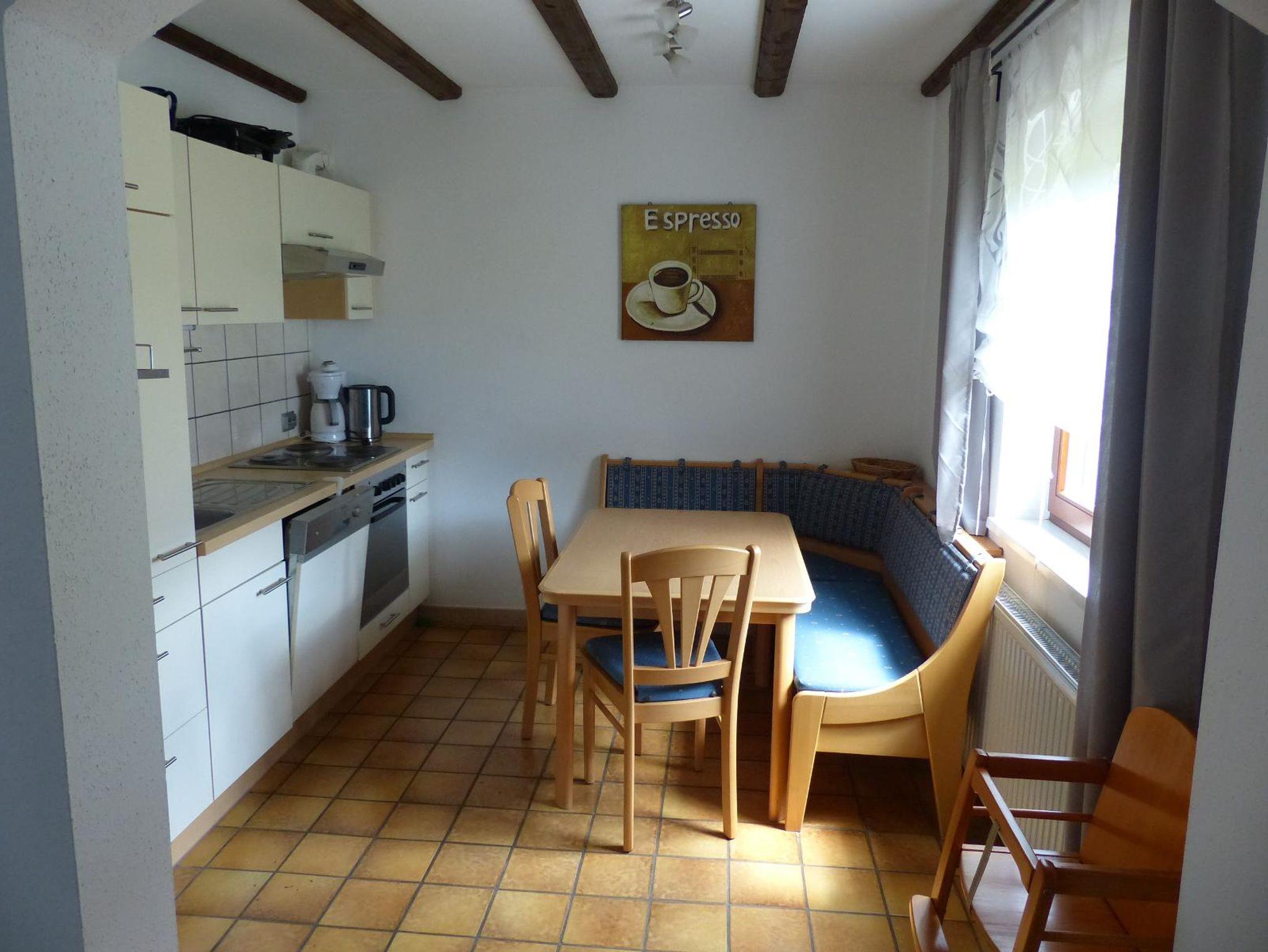 Eine offene Küche mit Eckbank und komplettem Essbereich, Kühlschrank mit Gefrierfach, Spülmaschine, Backofen & 4 Platten-Herd, Toaster,