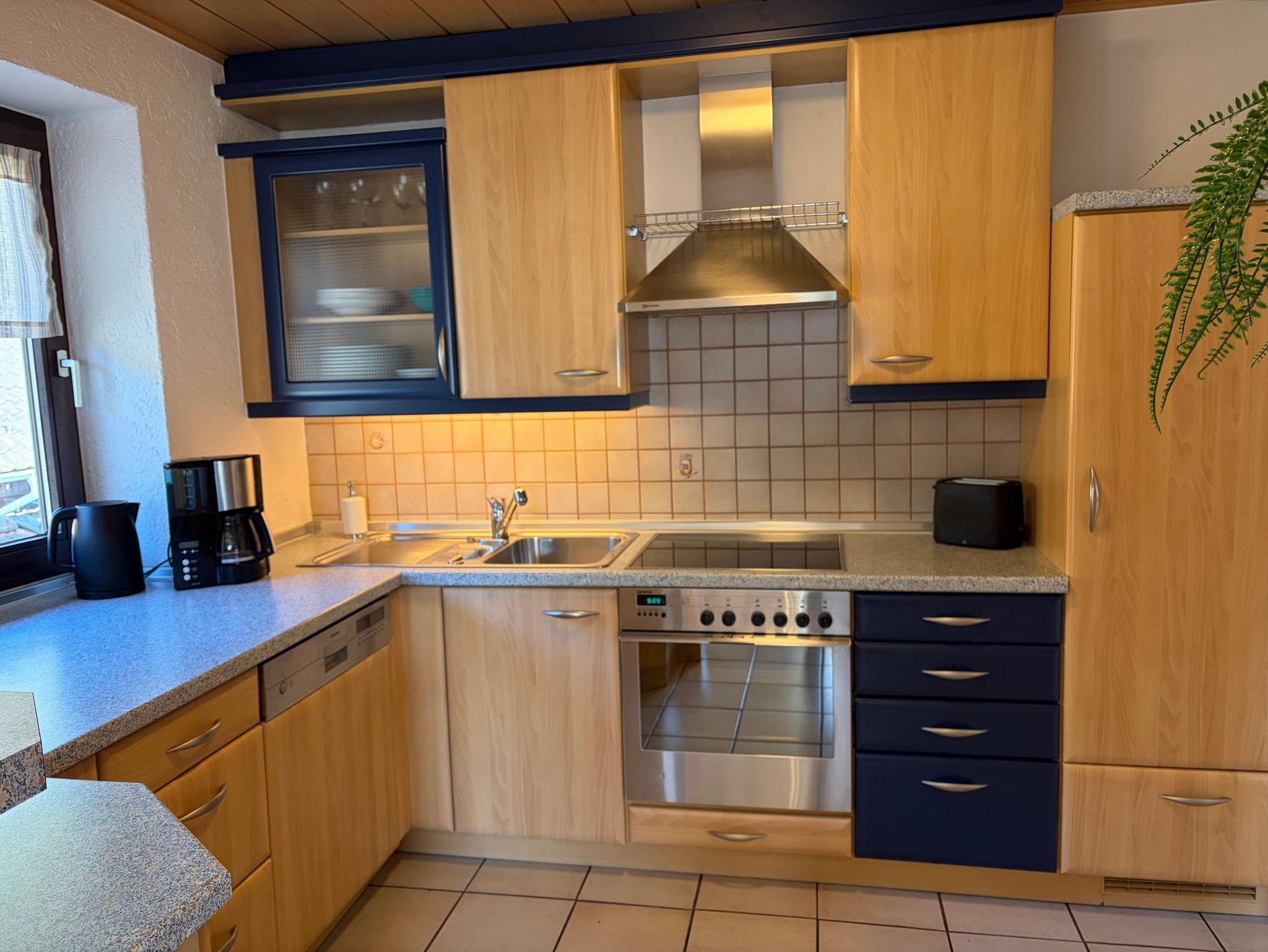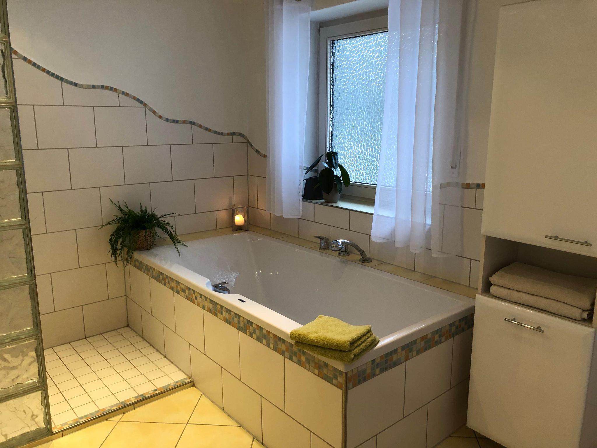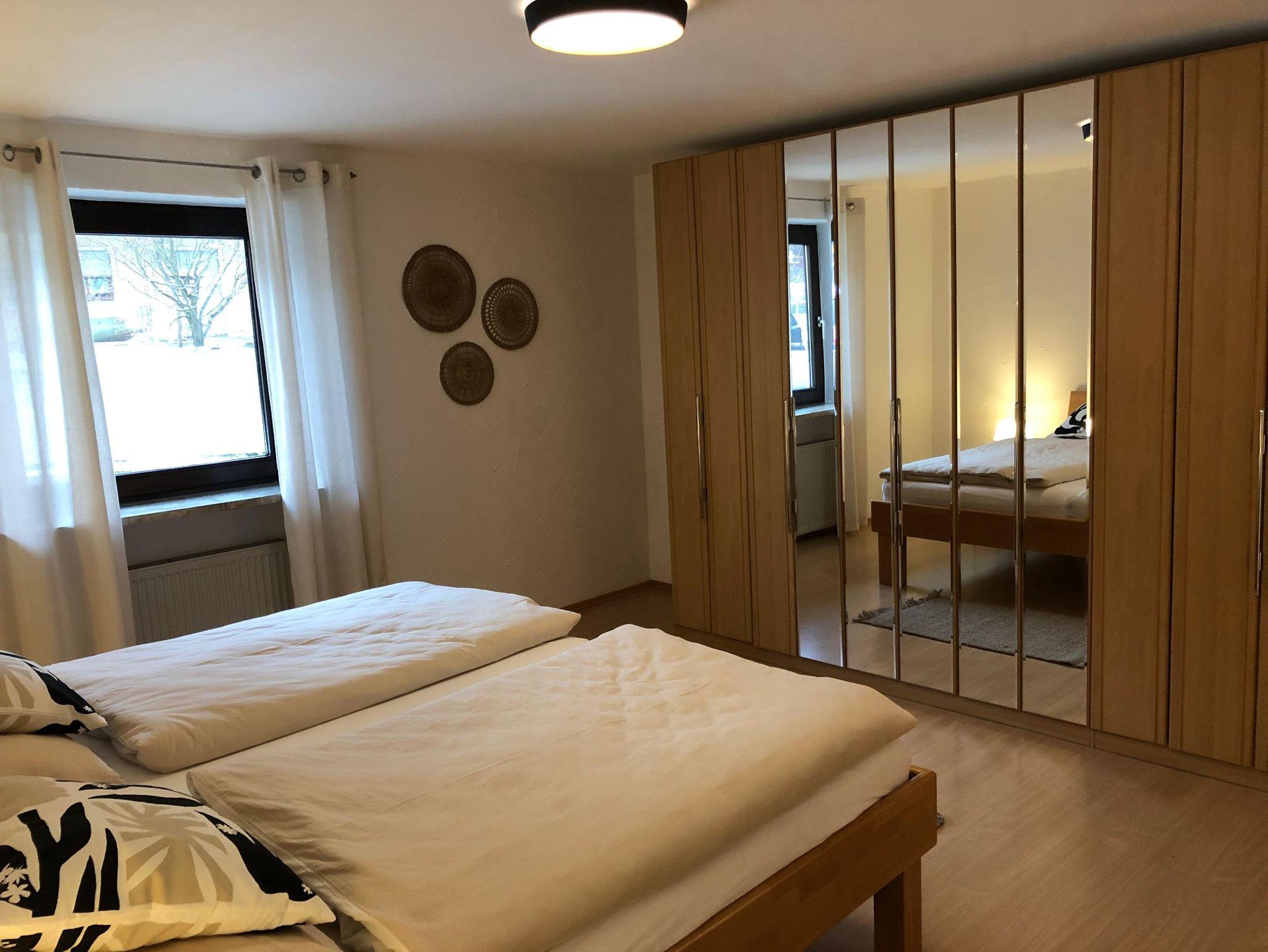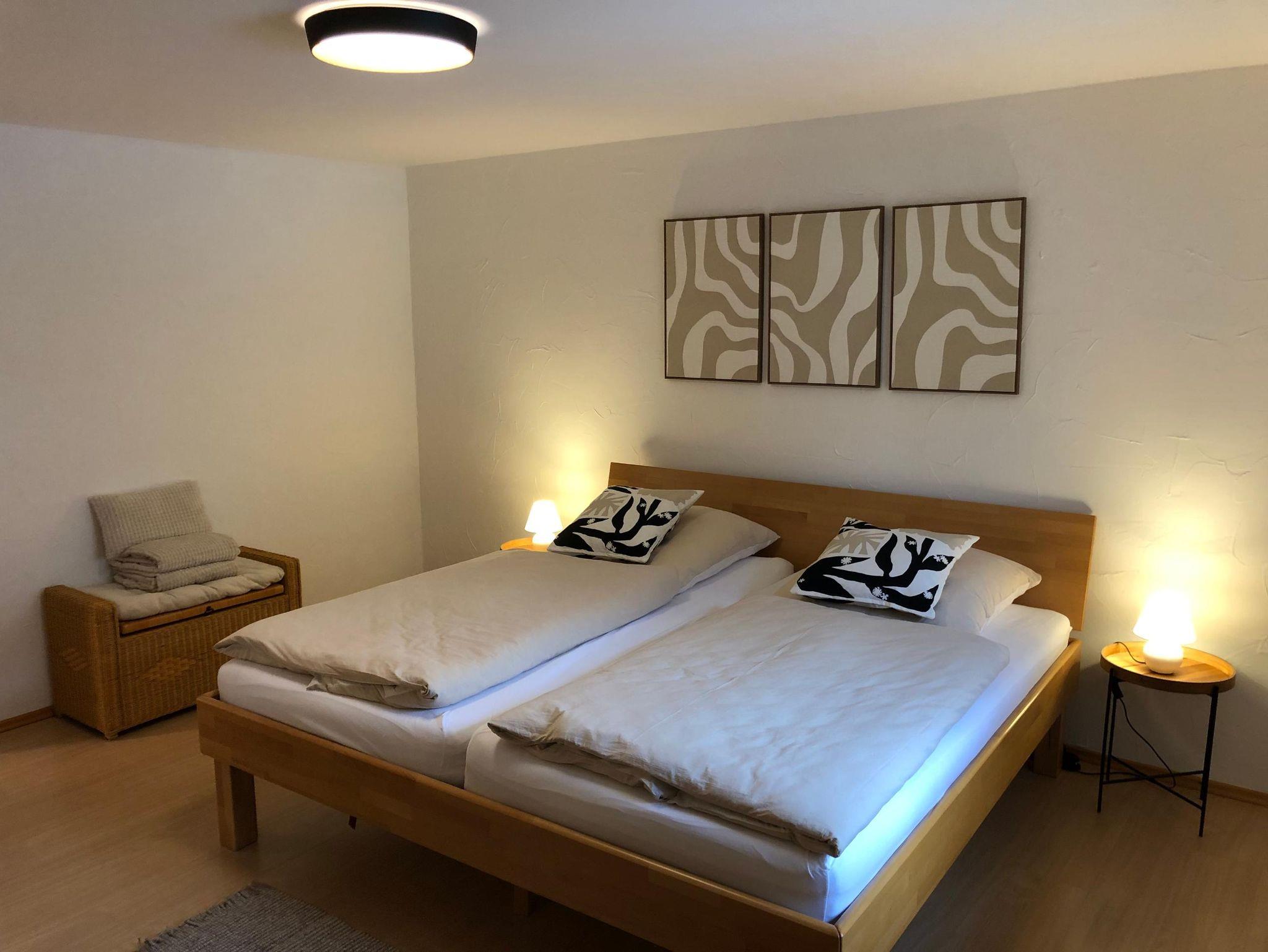 Unsere helle, stilvoll eingerichtete Wohnung bietet auf ca. 100 m² ausreichend Platz für bis zu 4 Personen. Sie befindet sich im Erdgeschoss unseres Ferienhauses – ganz für Sie allein, damit Sie ungestört entspannen können. Zu den Highlights der Wohnung gehören der offene Wohn- und Essbereich mit direktem Zugang zur Terrasse sowie zwei separate Schlafzimmer (eins mit einem Doppelbett, das andere mit zwei Einzelbetten). Die moderne Küche ist mit Geschirrspüler, Kühlschrank, Herd, Backofen, Mikrowelle, Wasserkocher, Toaster und Kaffeemaschine voll ausgestattet. Das Badezimmer verfügt über eine ebenerdige Dusche, Badewanne, WC, einen großen Waschtisch sowie einen Föhn. Das helle Wohnzimmer mit großem Sofa und Flachbild-TV lädt zum Entspannen ein. Im Winter sorgt der Kachelofen für wohlige Wärme, im Sommer genießen Sie entspannte Abende auf der Terrasse mit Grill. Ein kostenfreier Parkplatz, WLAN sowie eine abschließbare Garage für Fahrräder, Kinderwagen oder Skiausrüstung stehen Ihnen zur Verfügung. Bettwäsche, Hand- und Badetücher sowie Geschirrtücher sind inklusive. Für Kinder sind Hochstuhl und Tritthocker vorhanden. Waschmaschine & Trockner könenn nach Absprache gegen geringe Gebühr genutzt werden.
