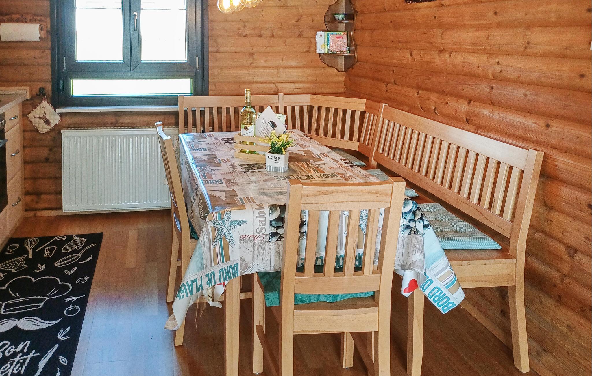 Die komfortable Küche ist mit einer Eckbank versehen, hier können sie gesellige Abende mit der ganzen Familie verbringen. Durch die Panoramafenster können Sie einen herrlichen Blick auf die umliegende Natur genießen.