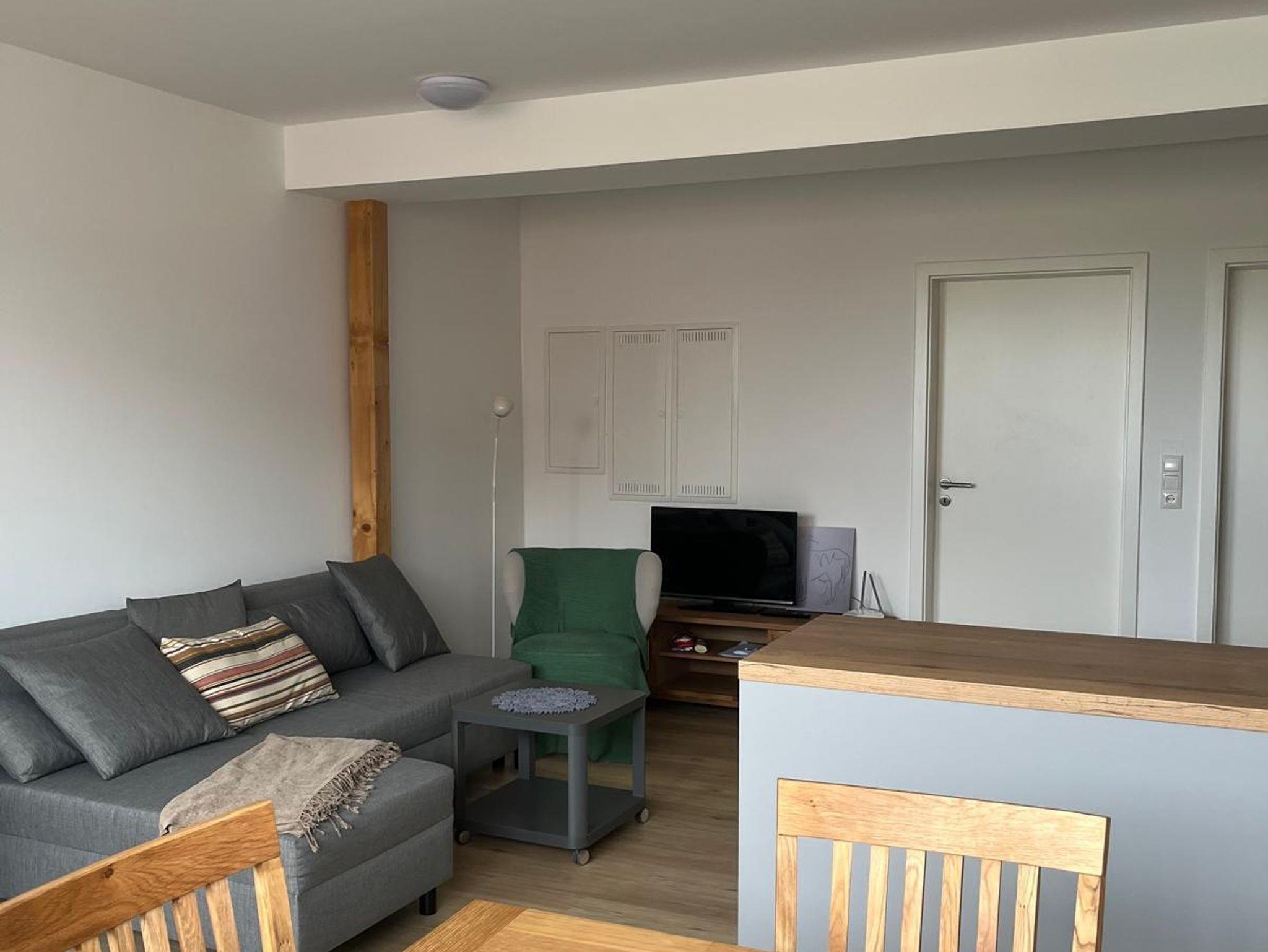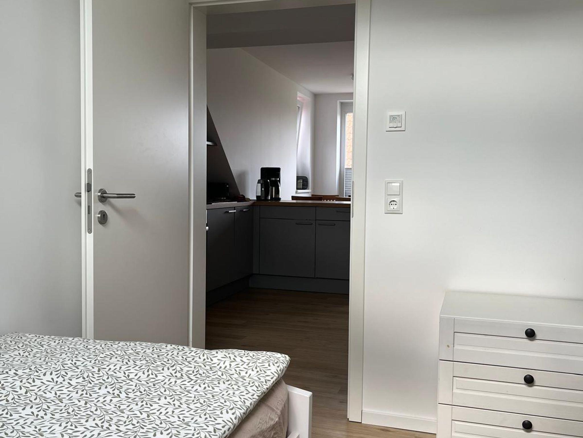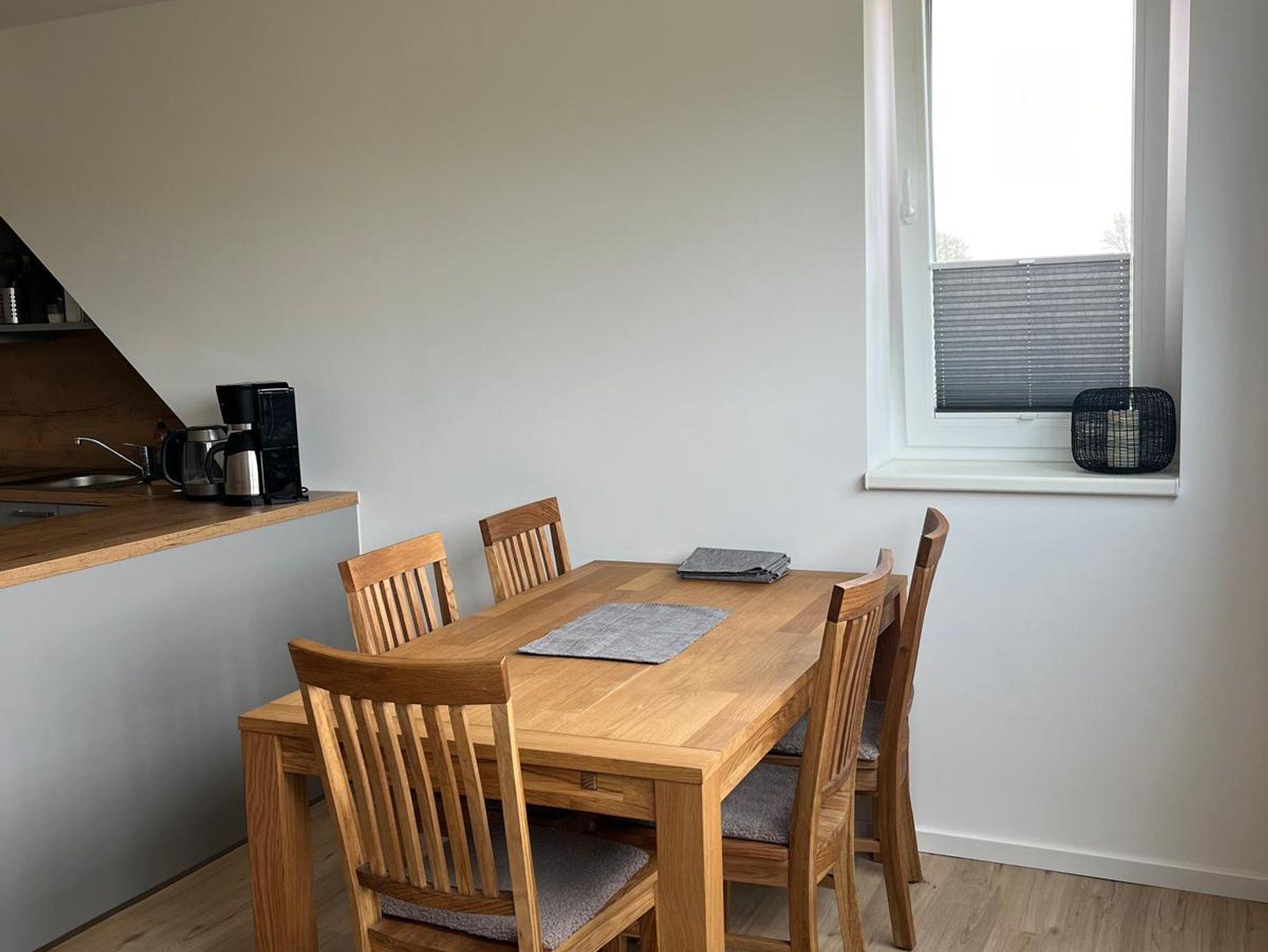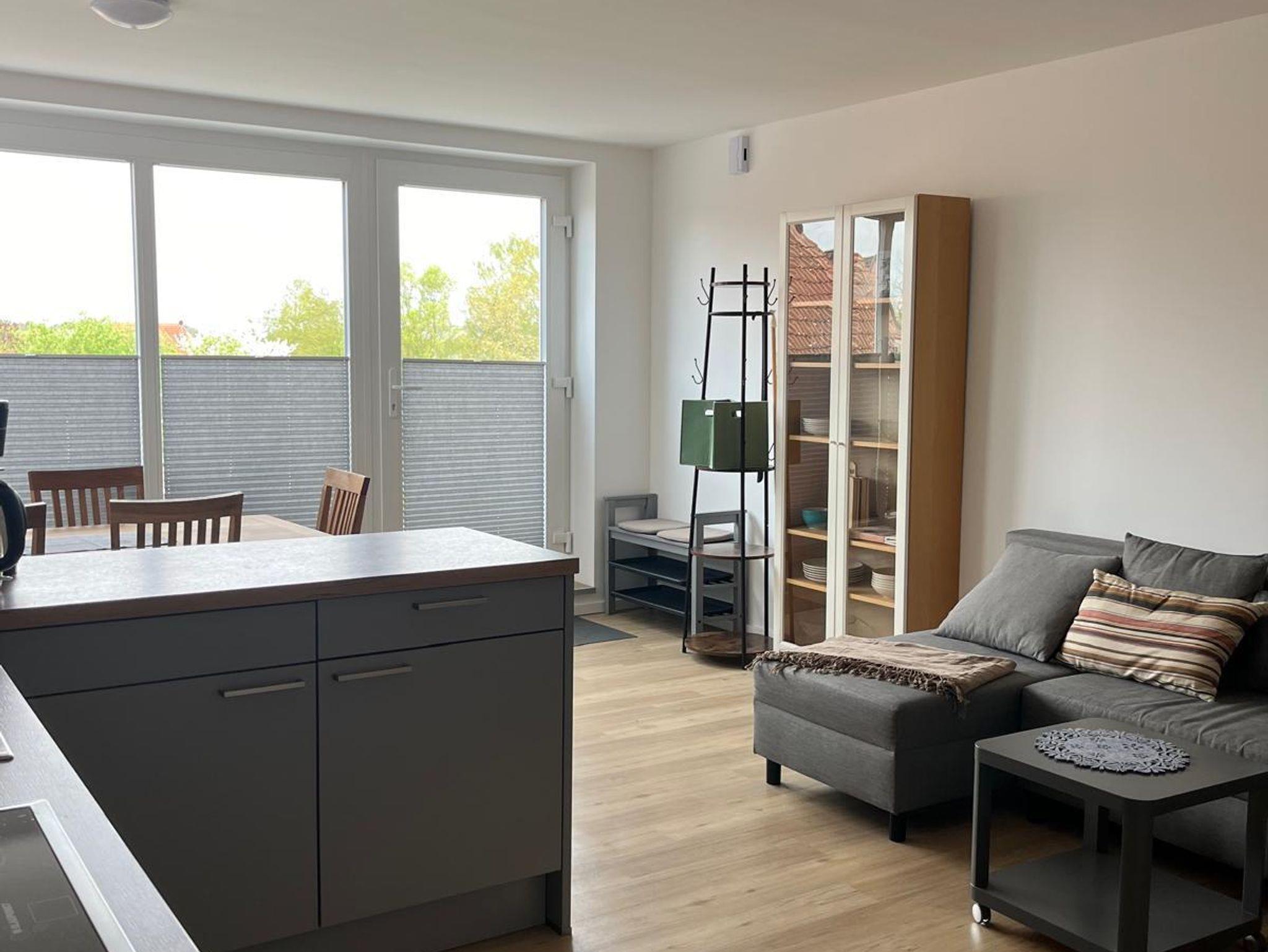 Die helle 60 m² Wohnung verfügt über 2 Schlafzimmer, eine Wohnküche und ein modernes Bad mit Dusche. In einem Schlafzimmer befindet sich ein Doppelbett und in dem 2. Schlafzimmer gibt es 2 Einzelbetten. Im Wohnbereich findet man eine Sitzgruppe mit Schlafcouch sowie TV. Die Küche beinhaltet einen Herd mit Backofen, eine Spülmaschine sowie Kühlschrank mit Gefrierfach. Auf einer kleinen Dachterasse kann man verweilen und den Ausblick genießen. Ein Pkw-Stellplatz ist vorhanden.