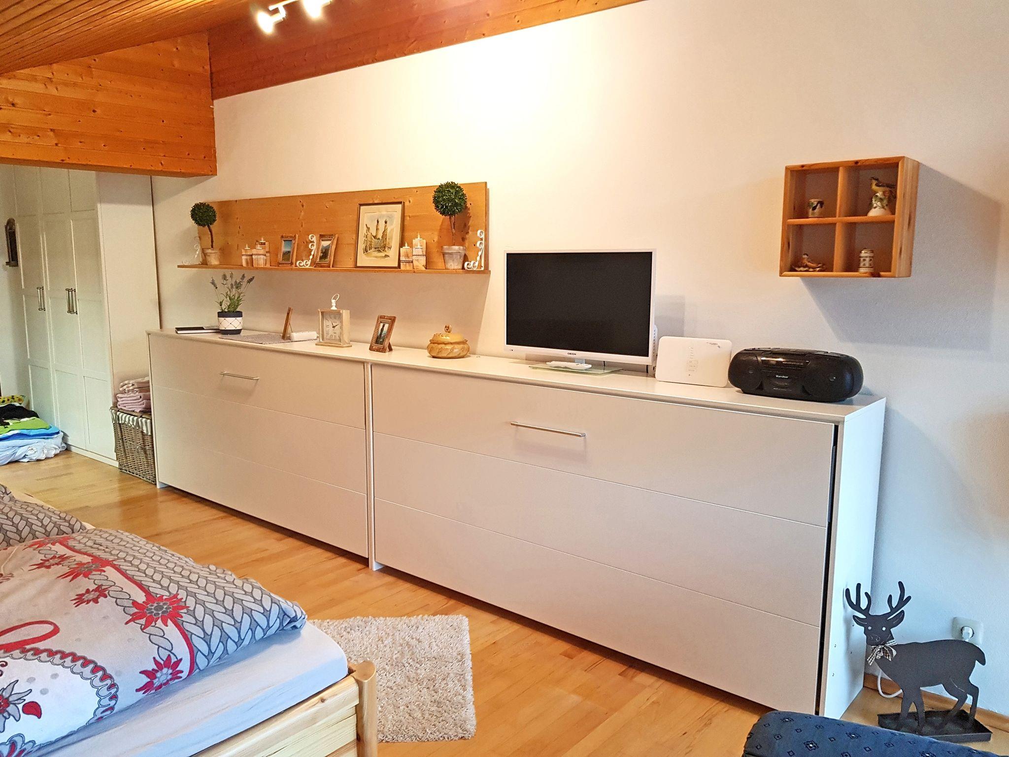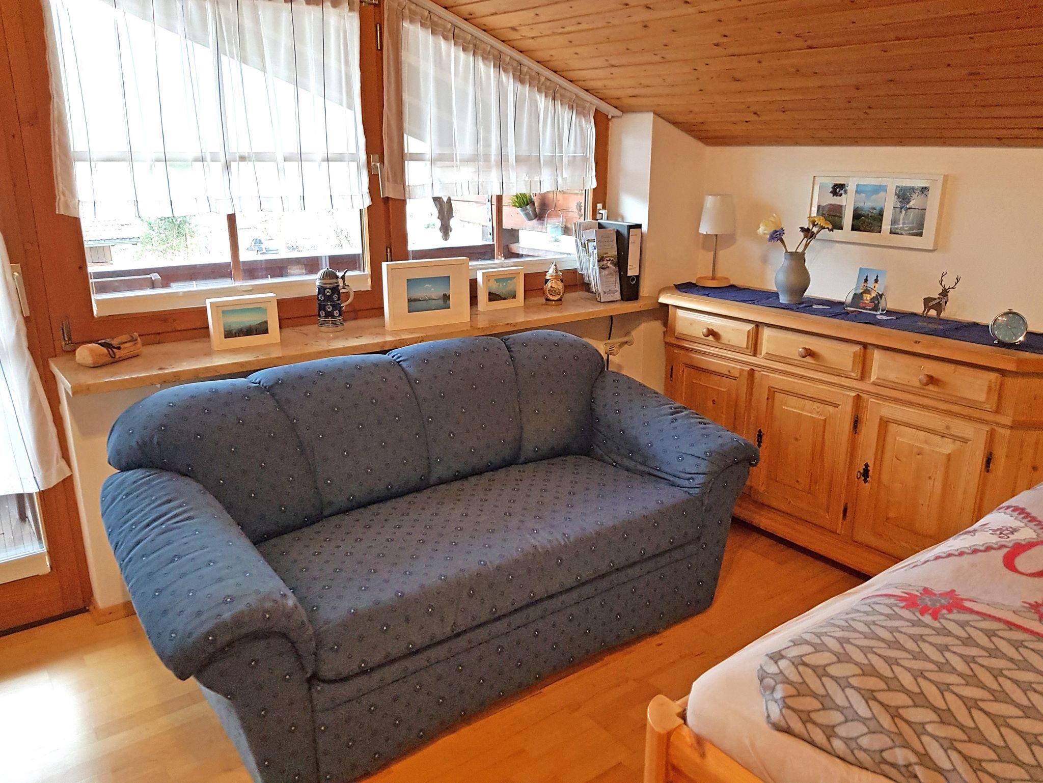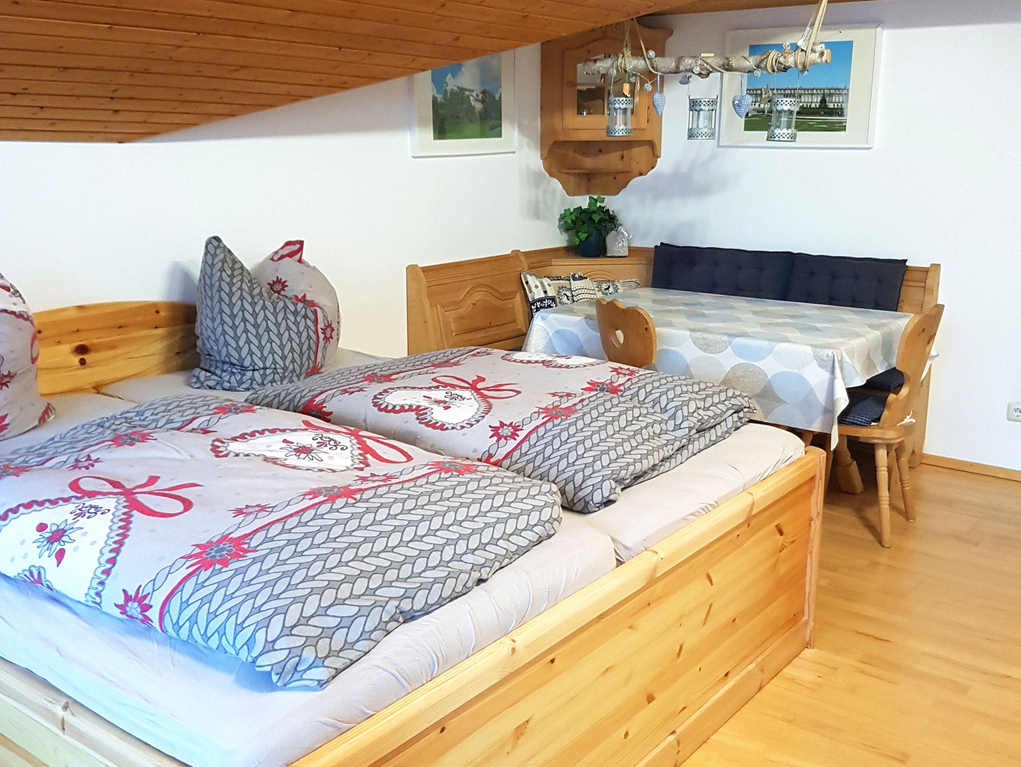 Gemütliche Einraum-Ferienwohnung 28 qm Bergblickl mit Dachschräge im modernen alpenländischen Stil. Das Wohn-/Schlafzimmer verfügt über ein Doppelbett. Der Wohnraum wurde optisch mit einer Kommode abgetrennt und bietet Platz für eine Eckbank mit Tisch zum Essen und einer Couch zum Fernsehen. Gut ausgestattete kleine Küchenzeile. Schönes Badezimmer mit Fön, Dusche und WC. Haustiere und Hunde dürfen nicht mitgenommen werden.
