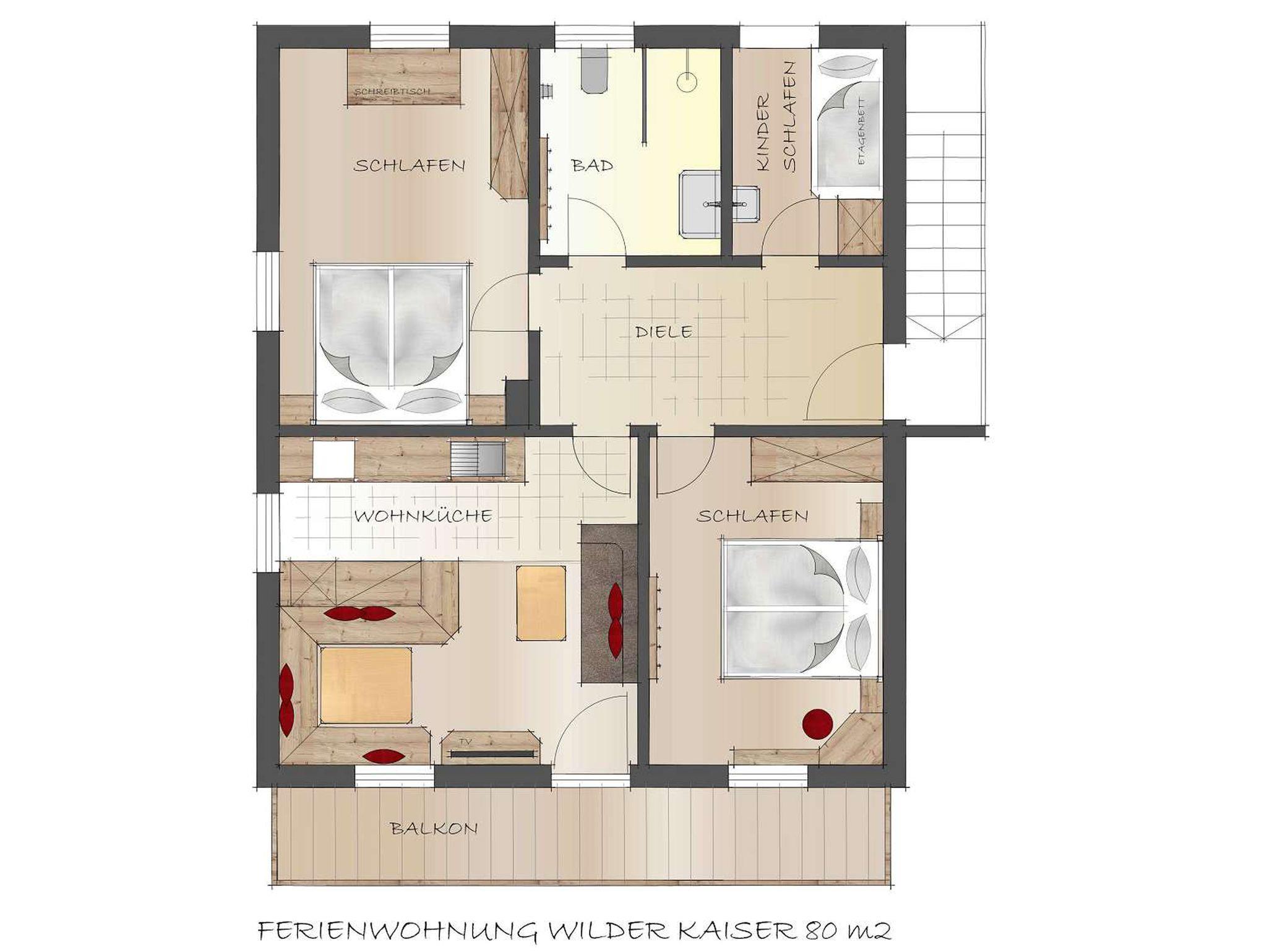 Geräumige Ferienwohnung Wilder Kaiser zum Wohlfühlen im Zuhäusl neben dem Simmerl-Bergbauernhof. Die neue Wohnküche bietet Komfort und Behaglichkeit. Ankommen und sich zu Hause fühlen. Ein großer Balkon - die Berge vor Augen - Urlaub für die Seele. Die geschreinerte Wohnküche mit behaglicher Sitzecke, Sofa und Flat-Sat-TV ist mit Cerankochfeld und Backofen, Kühlschrank, Geschirrspülmaschine und Kaffeemaschine ausgestattet. Von den drei Schlafzimmern bieten zwei Doppelbetten und das Kinderschlafzimmer ein Stockbett. Tief und erholsam schlaften Sie im Zirbenschlafzimmer dieser Wohnung. Auf dem Balkon finden Sie Balkonmöbel vor. Das Badezimmer verfügt über eine Dusche und WC. Nichtraucher. Hund willkommen.