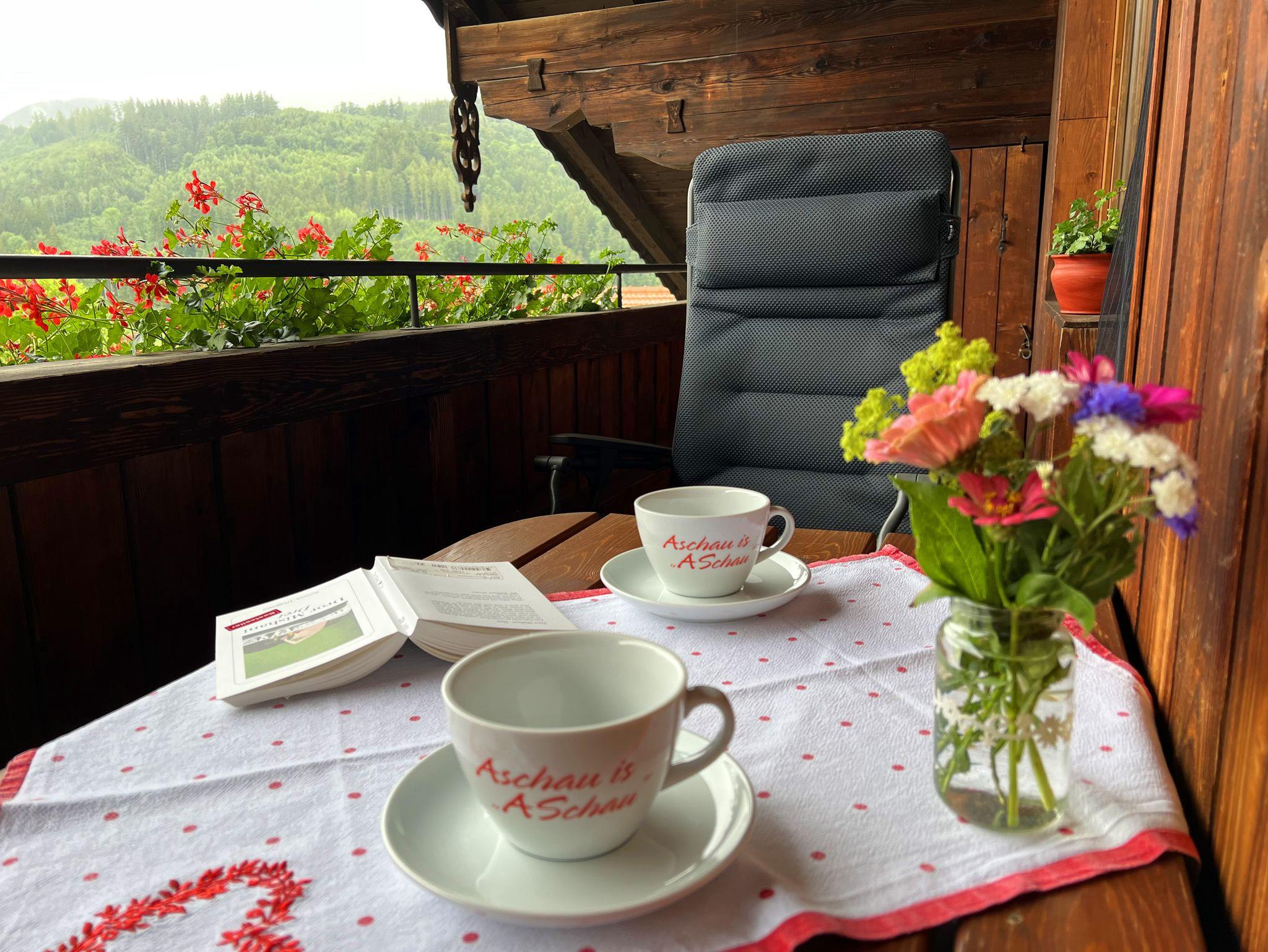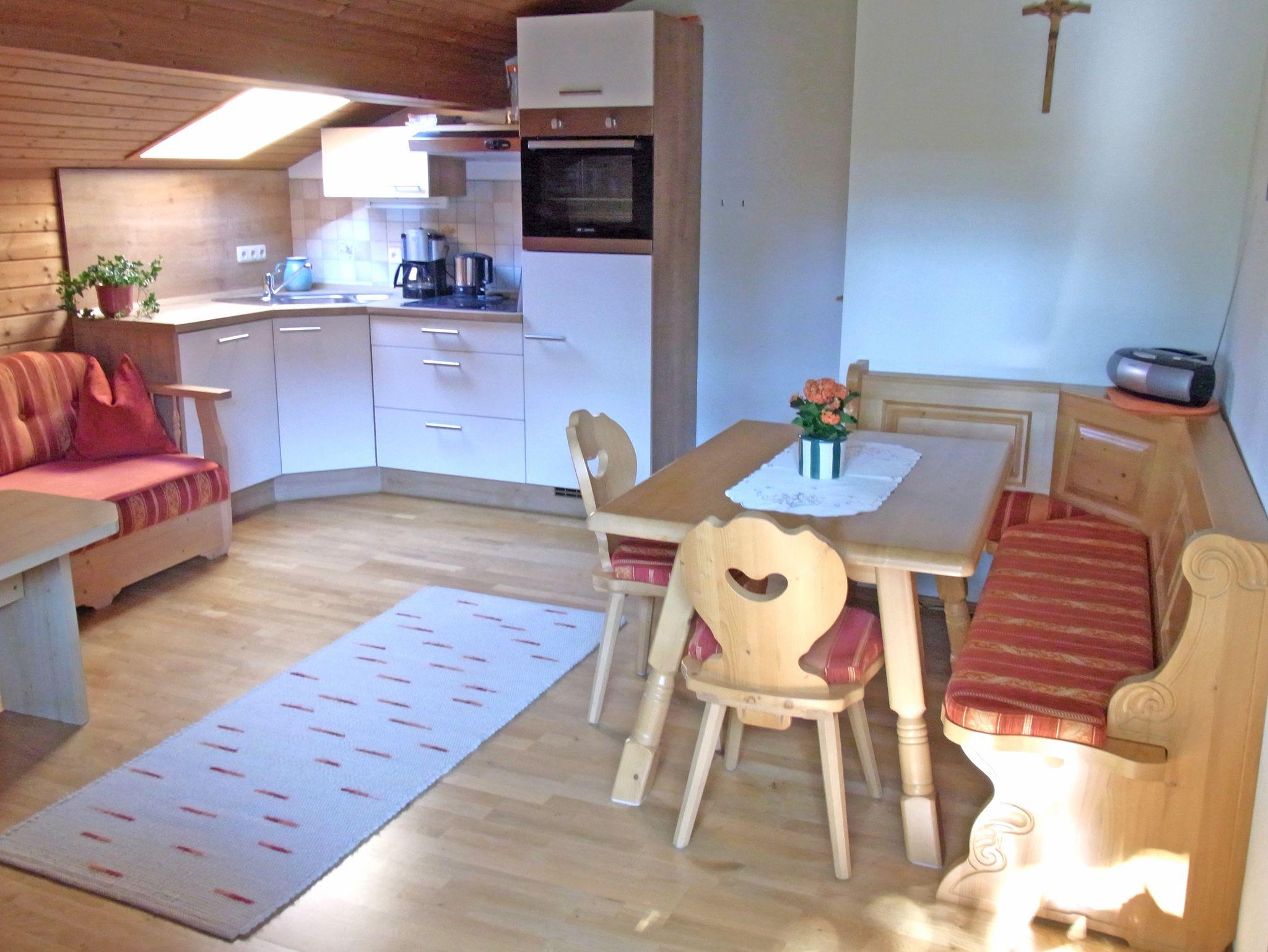 Komfortable, gemütliche Ferienwohnung mit Parkettboden im 2. Obergeschoss und großem überdachtem Ostbalkon mit herrlichem Ausblick auf die Berge. Zwei extra Schlafzimmer, ein Schlafzimmer mit Doppelbett und ein Schlafzimmer mit zwei Einzelbetten, die auch zusammengeschoben werden können. Auf Anfrage kann ein Kinderbett aufgestellt werden. Gemütlicher Wohnraum mit Küchenzeile, Spülmaschine, Backofen, einer Eckbank, Stühle und Tisch zum Essen (Kinderhochstuhl möglich) und eine Couch-Sitzgruppe, SAT-TV, kostenloses WLAN und Radio. Badezimmer mit Dusche/WC und Fön. Für Kinder: Spielwiese und Kinderfuhrpark am Haus. Haustiere dürfen nicht mitgebracht werden.