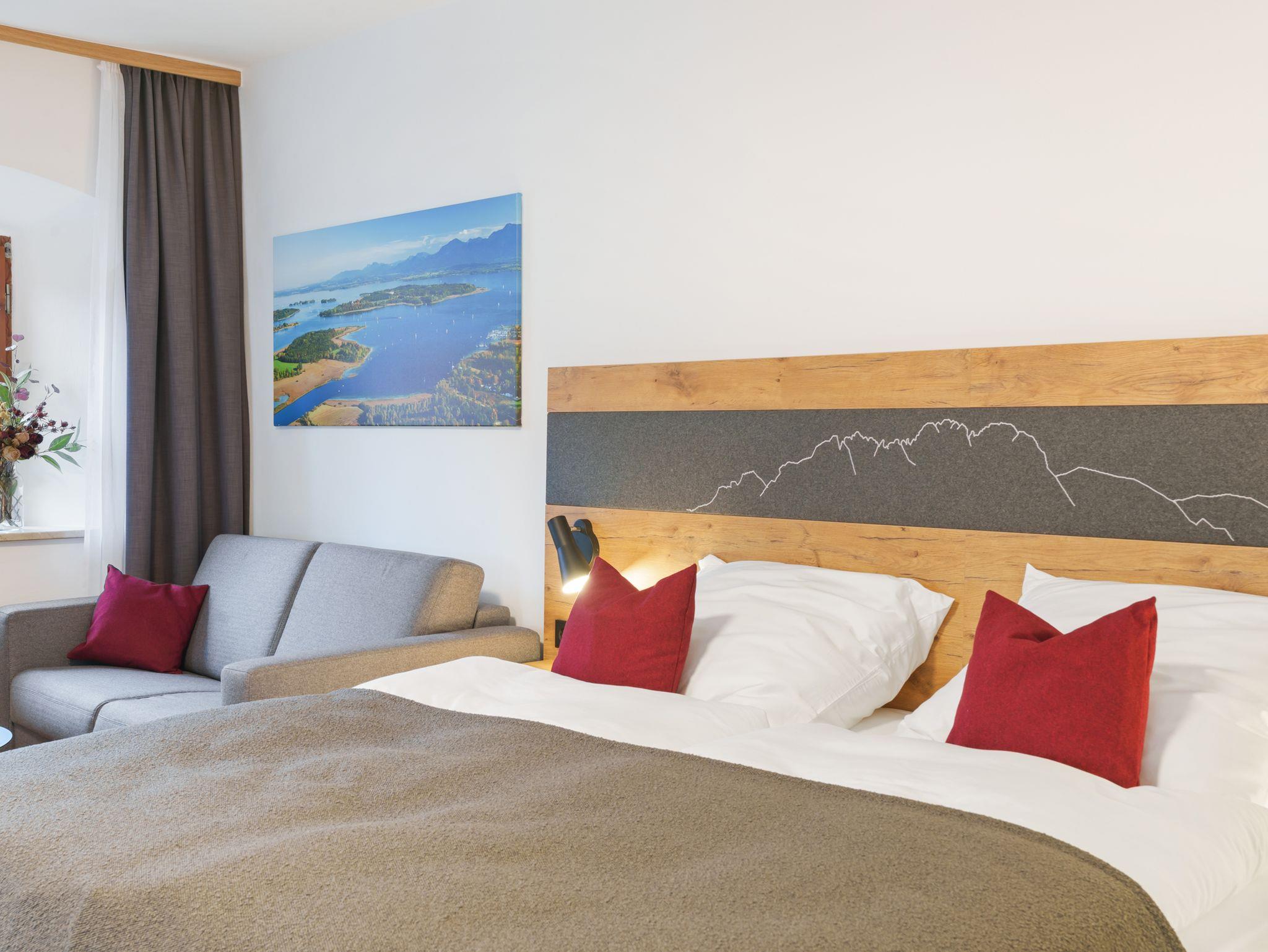 Ihr Wohlfühlzimmer am Kirchberg. Genießen Sie erholsame Urlaubstage in unserem frisch renovierten Zimmer für bis zu 3 Personen oder 2 Erwachsene und 2 kleine Kinder im 1. Obergeschoss. Das komfortable Boxspringbett (180 x 200 cm) sorgt für traumhaften Schlaf, während die ausklappbare Schlafcouch mit hochwertiger Matratze (130 x 195 cm) eine gemütliche Zusatzschlafmöglichkeit für eine erwachsene Person oder zwei kleine Kinder bietet.