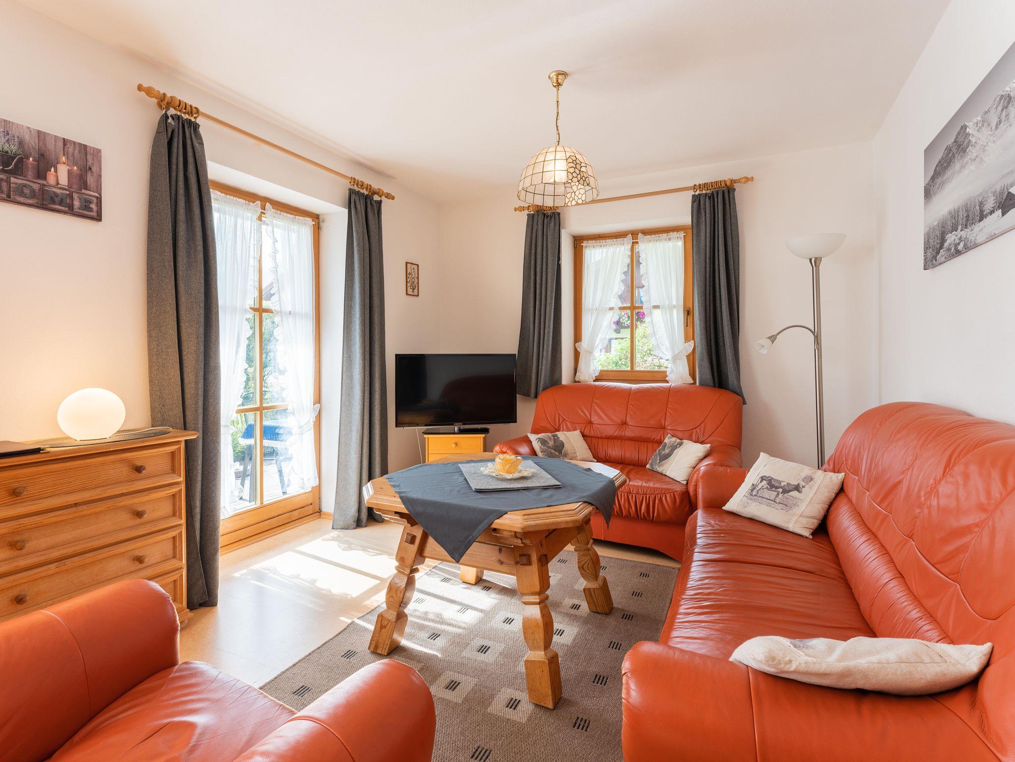 Helle, geräumige Nichtraucher Ferienwohnung 75 qm für 2 - 4 Personen mit Süd-Terrasse und herrlichem Blick auf die Berge. Zwei separate Schlafzimmer: ein Schlafzimmer mit Doppelbett, ein kleineres Schlafzimmer mit Französischem Bett 1,40 x 2 m. Großes Wohnzimmer mit gemütlicher Couch, Flat-Kabel-TV und kostenloses WLAN. Separate Küche mit Eckbank und Esstisch, Geschirrspülmaschine, Herd/Backofen und Kühlschrank/Tiefkühlfach. Zwei Badezimmer mit Dusche/WC. Bettwäsche und Handtücher vorhanden. Diese Wohnung ist durch die Lage im Erdgeschoss behindertenfreundlich und kann mit Gehbehinderung oder Kinder-Rollstuhl gebucht werden. Es müssen aber im Eingangsbereich mind. 6 Stufen bewältigt werden. Das Badezimmer ist nicht Rollstuhlgerecht eingerichtet. Hunde und Haustiere sind nicht erlaubt.