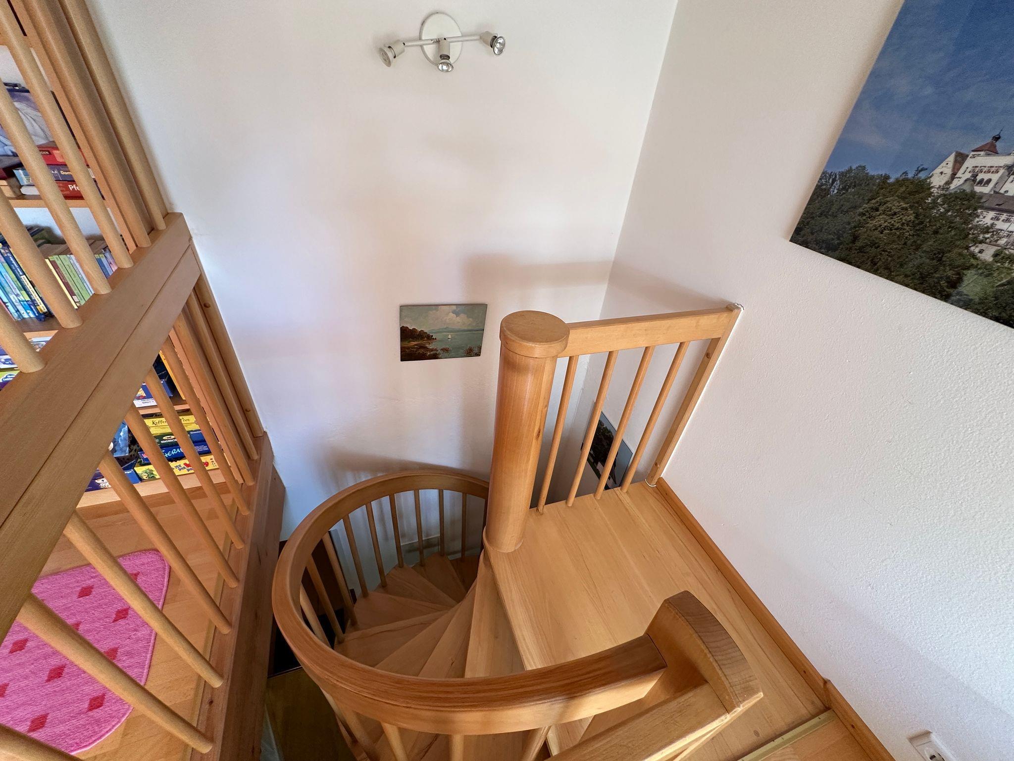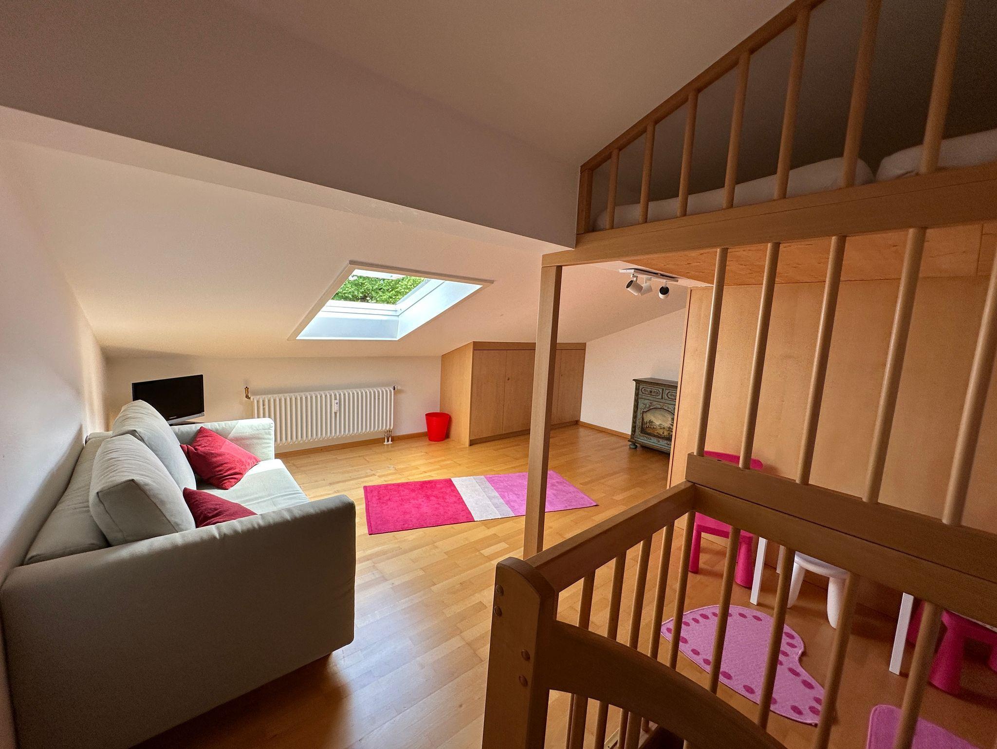 Das separate Schlafzimmer mit komfortablem Doppelbett garantiert erholsame Nächte. Eine Wendeltreppe führt auf die offene Galerie mit einer Schlafcouch, die sich sowohl für einen weiteren Erwachsenen als auch für zwei Kinder eignet. Für Kinder bietet der obere Bereich außerdem eine gemütliche Hochbett-Schlafkoje und eine liebevoll eingerichtete Spielecke mit vielen Büchern und Spielen – ein kleines Paradies unter dem Dach.