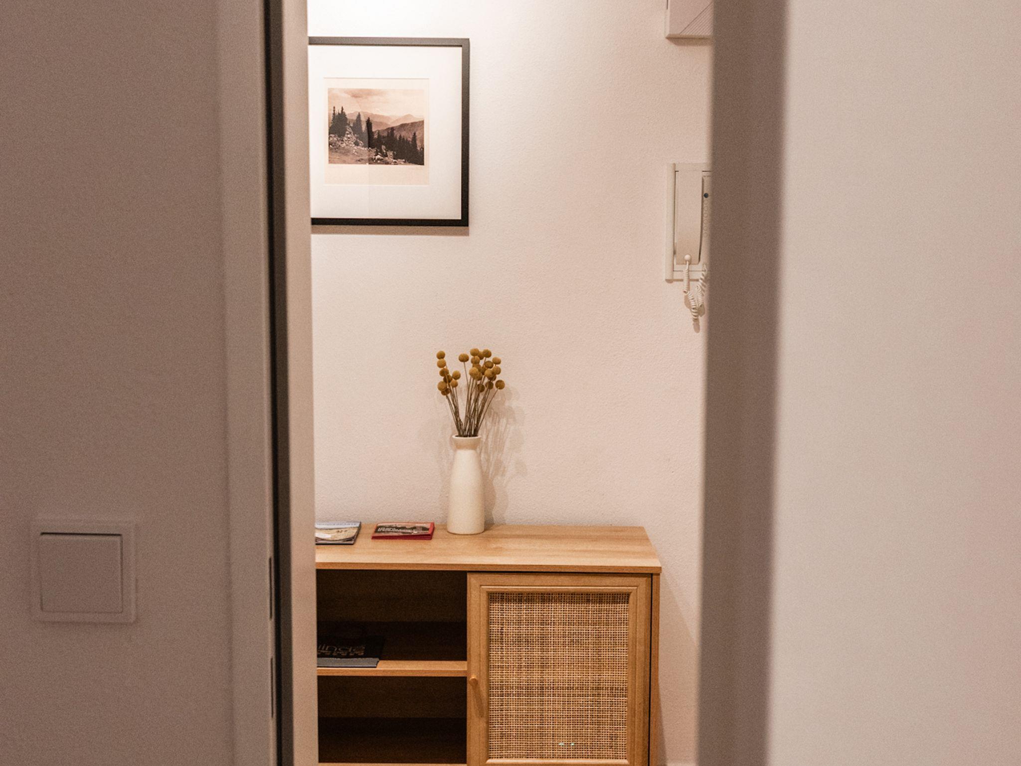 Das Badezimmer verfügt über eine ebenerdige Dusche, WC und Föhn. Eine kostenfreie Waschmaschine in der Wohnung sorgt für zusätzlichen Komfort, besonders bei längeren Aufenthalten. Die große Balkon-Terrasse ist ein echtes Highlight und lädt mit seinem freien Blick auf die Berge zum Verweilen ein, während die ruhige Lage ohne Durchgangsverkehr für ungestörte Erholung sorgt.