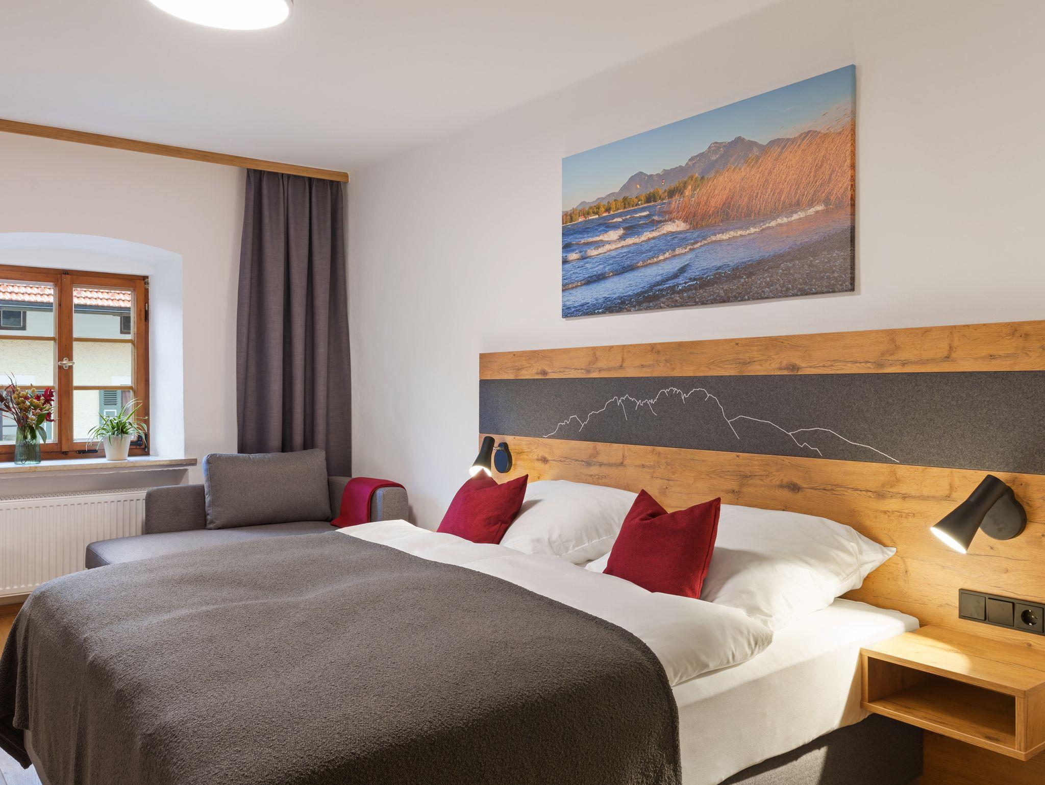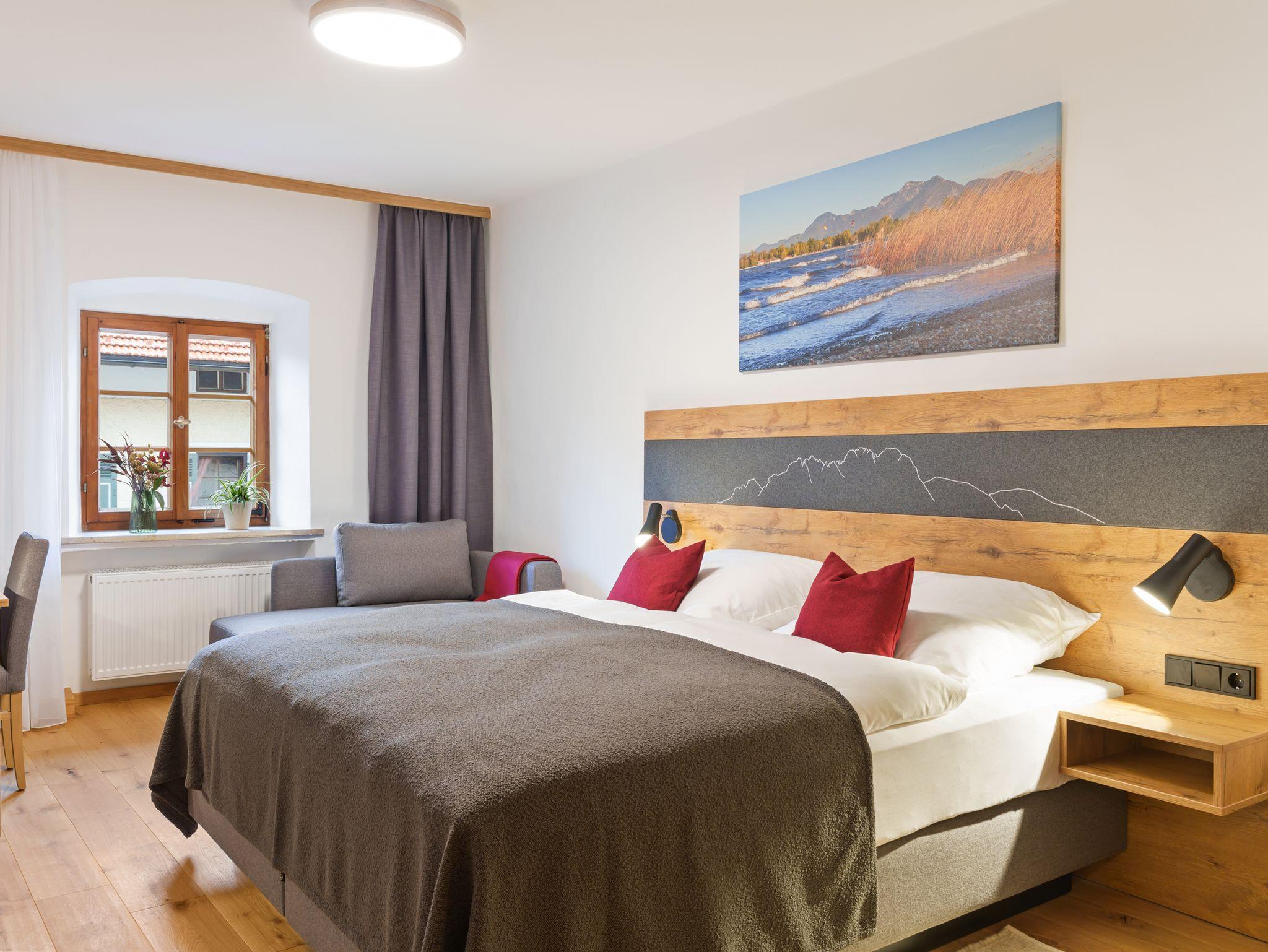 Ihr Wohlfühlzimmer am Kirchberg. Genießen Sie erholsame Urlaubstage in unserem frisch renovierten Doppelzimmer für bis zu 3 Personen im 1. Obergeschoss. Das komfortable Boxspringbett (180 x 200 cm) sorgt für traumhaften Schlaf, während die hochwertige, ausklappbare Schlafcouch (80 x 200 cm) eine gemütliche Zusatzschlafmöglichkeit für eine Person bietet. Zur Ausstattung gehören moderne Annehmlichkeiten wie Dusche, WC, Fön, Smart-Kabel-TV, Safe, W-LAN, Kofferablage sowie ein Schreibtisch, der sich auch ideal fürs Homeoffice eignet. Der warme Charakter echter Holzparkettböden schafft eine behagliche Atmosphäre. Ein Hund ist auf Anfrage im eigenen Körbchen gegen Aufpreis erlaubt, bitte halten Sie mit uns Rücksprache.
