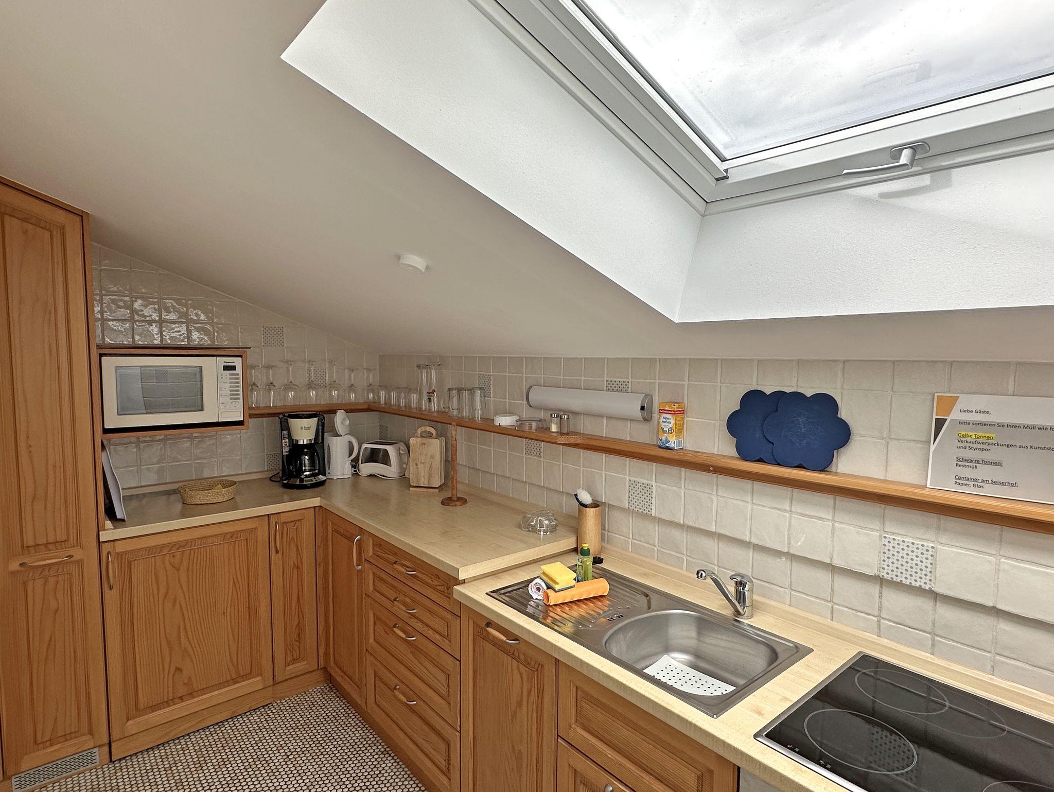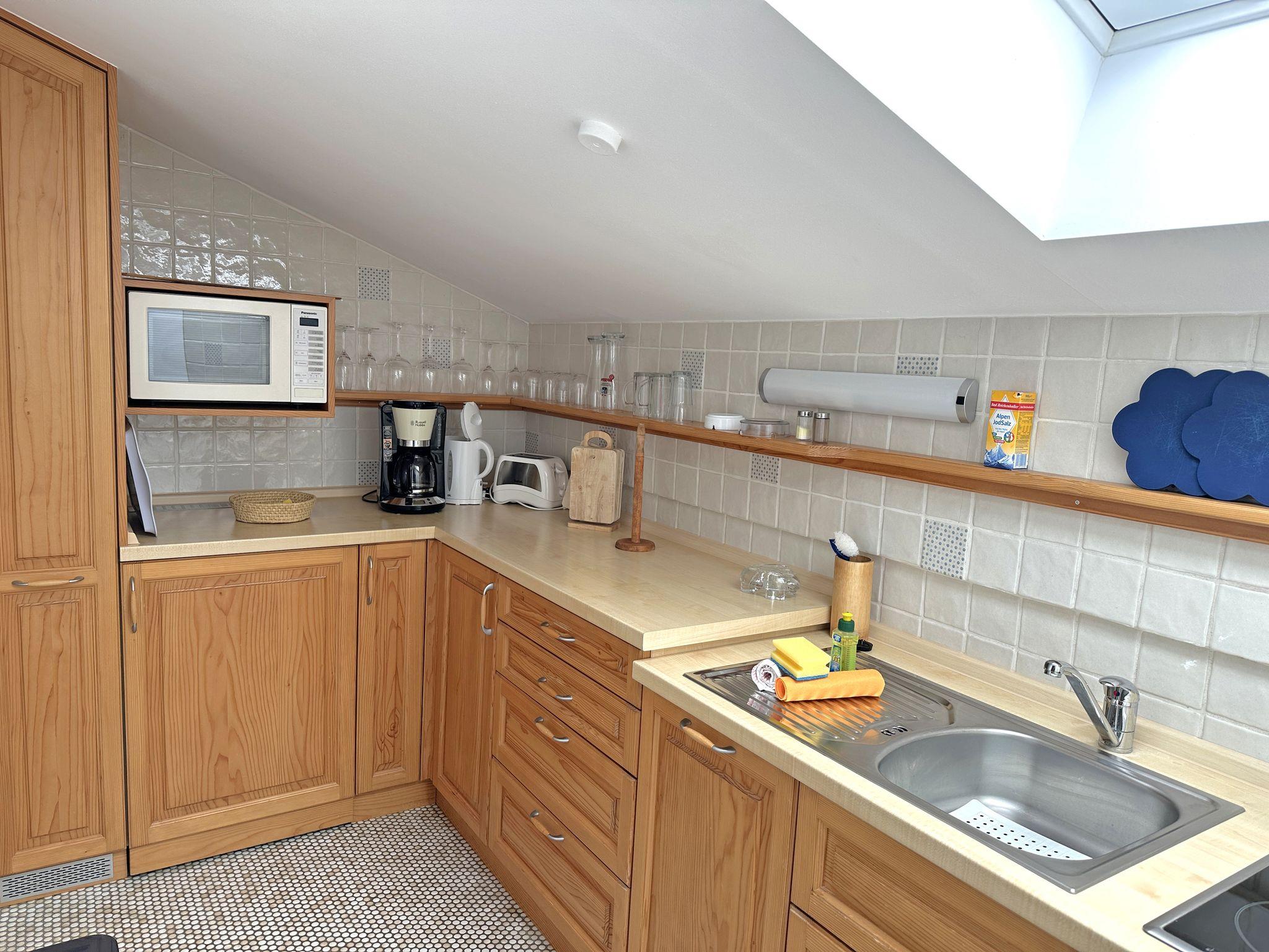 Die separate Küche ist bestens ausgestattet und lässt keine Wünsche offen: Mikrowelle, Geschirrspüler, 4-Platten-Cerankochfeld mit Backofen, Kühlschrank mit Tiefkühlfach, Wasserkocher, Toaster und Filterkaffeemaschine stehen bereit, damit Sie sich kulinarisch verwöhnen können. Das Badezimmer mit Dusch-/Badewanne, WC und Fön ist von zwei Seiten begehbar und sorgt für zusätzlichen Komfort.