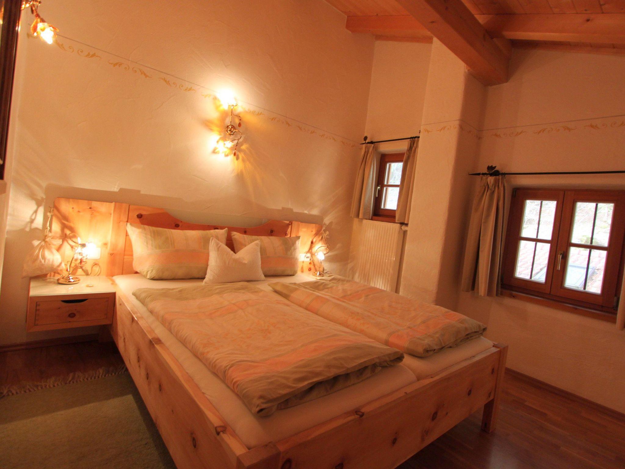 Im Obergeschoss, mit offenem Dachstuhl, Parkettboden ausgelegt, befindet sich das Schlafzimmer mit Doppelbett (180 x 200 cm), Safe im Kleiderschrank sowie ein Kinderzimmer mit zwei Einzelbetten. Der Duft unserer ZIRBENHOLZ-BETTEN, die wir in unserer Tischlerei selbst hergestellt haben, lässt Sie besonders gut schlafen.