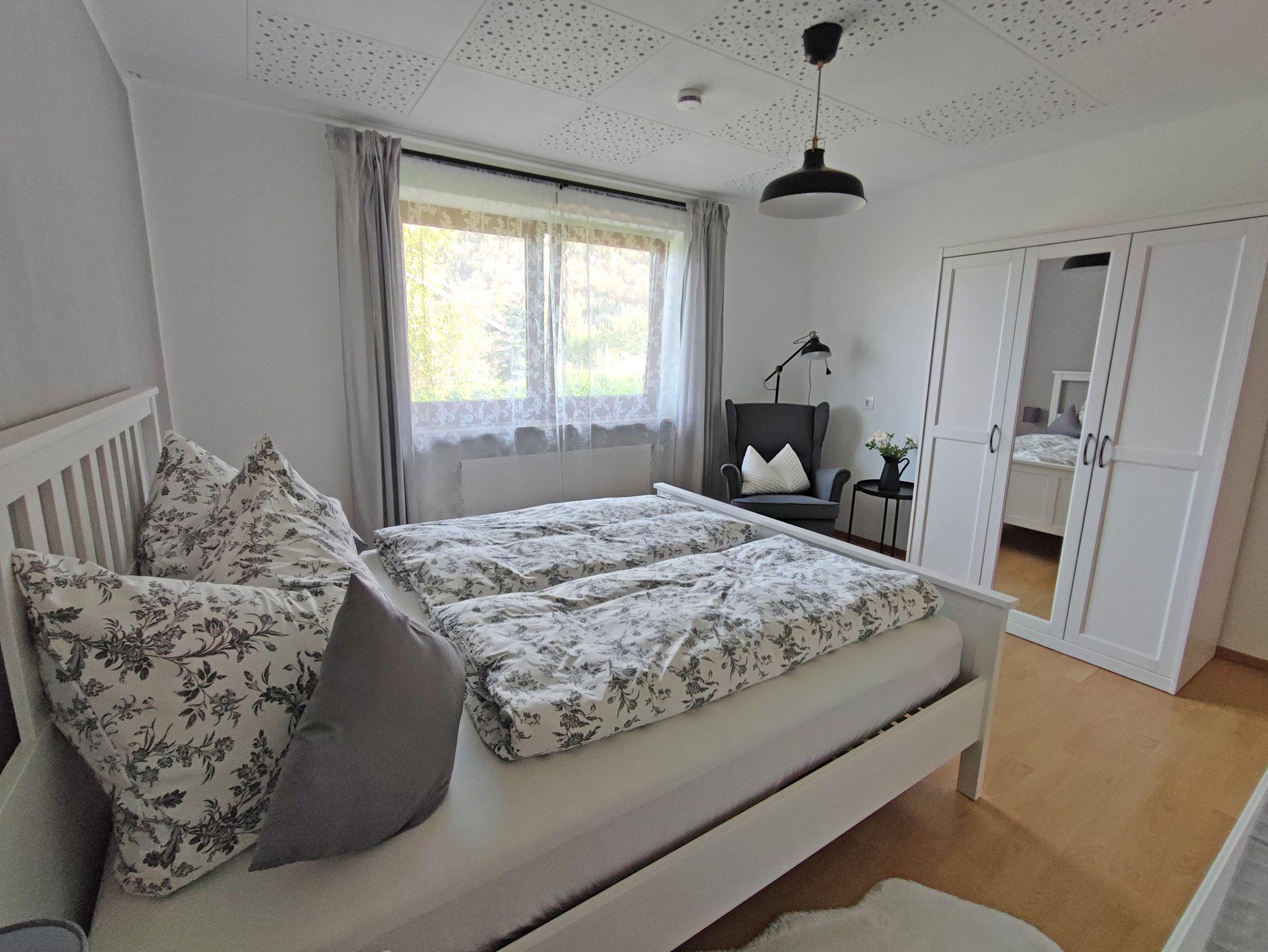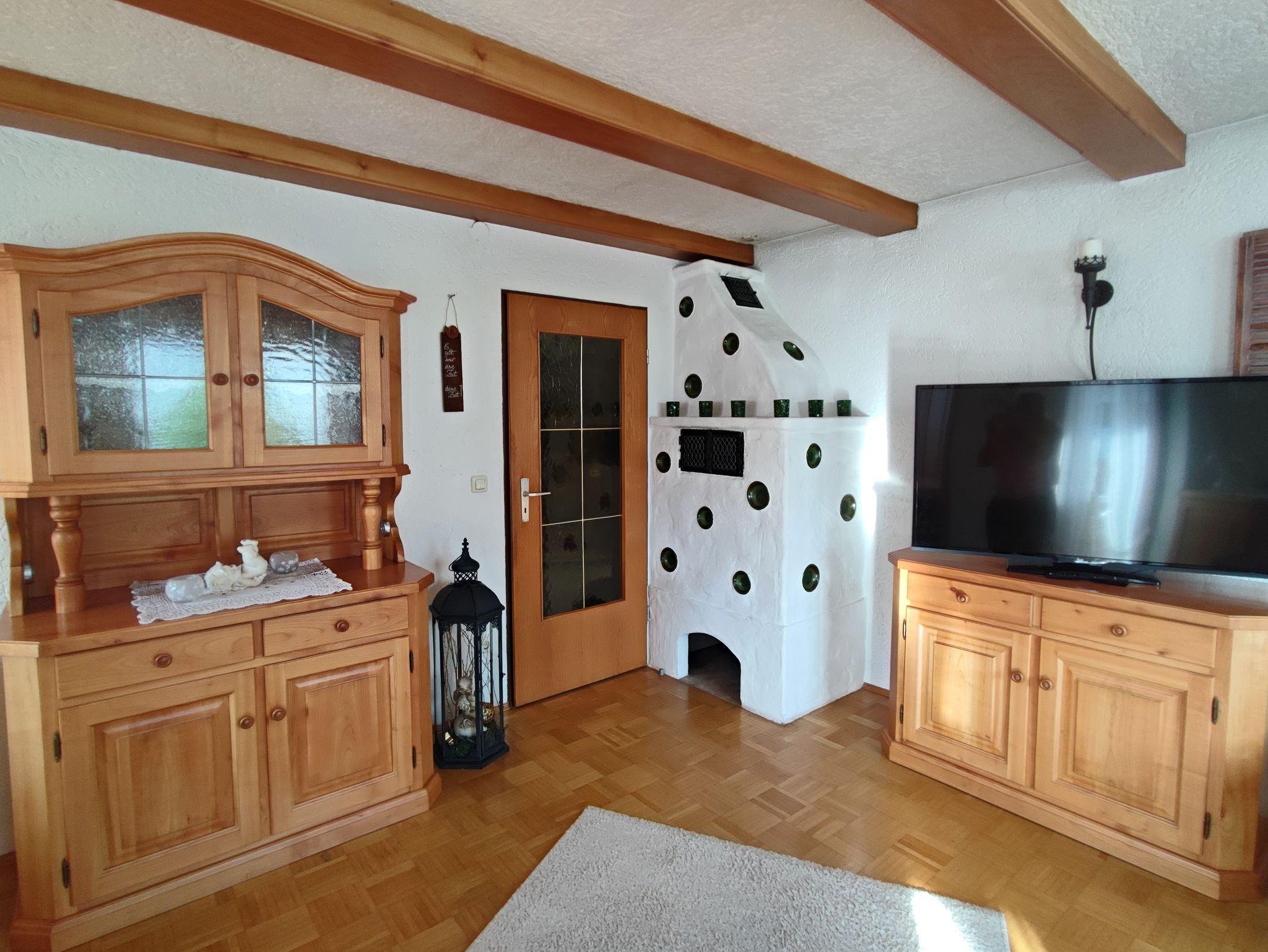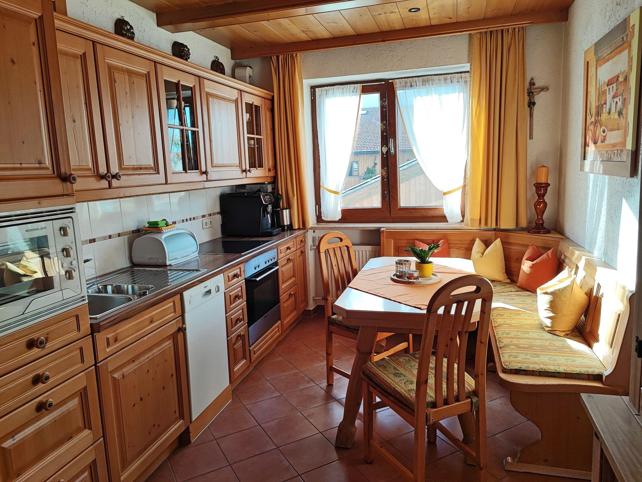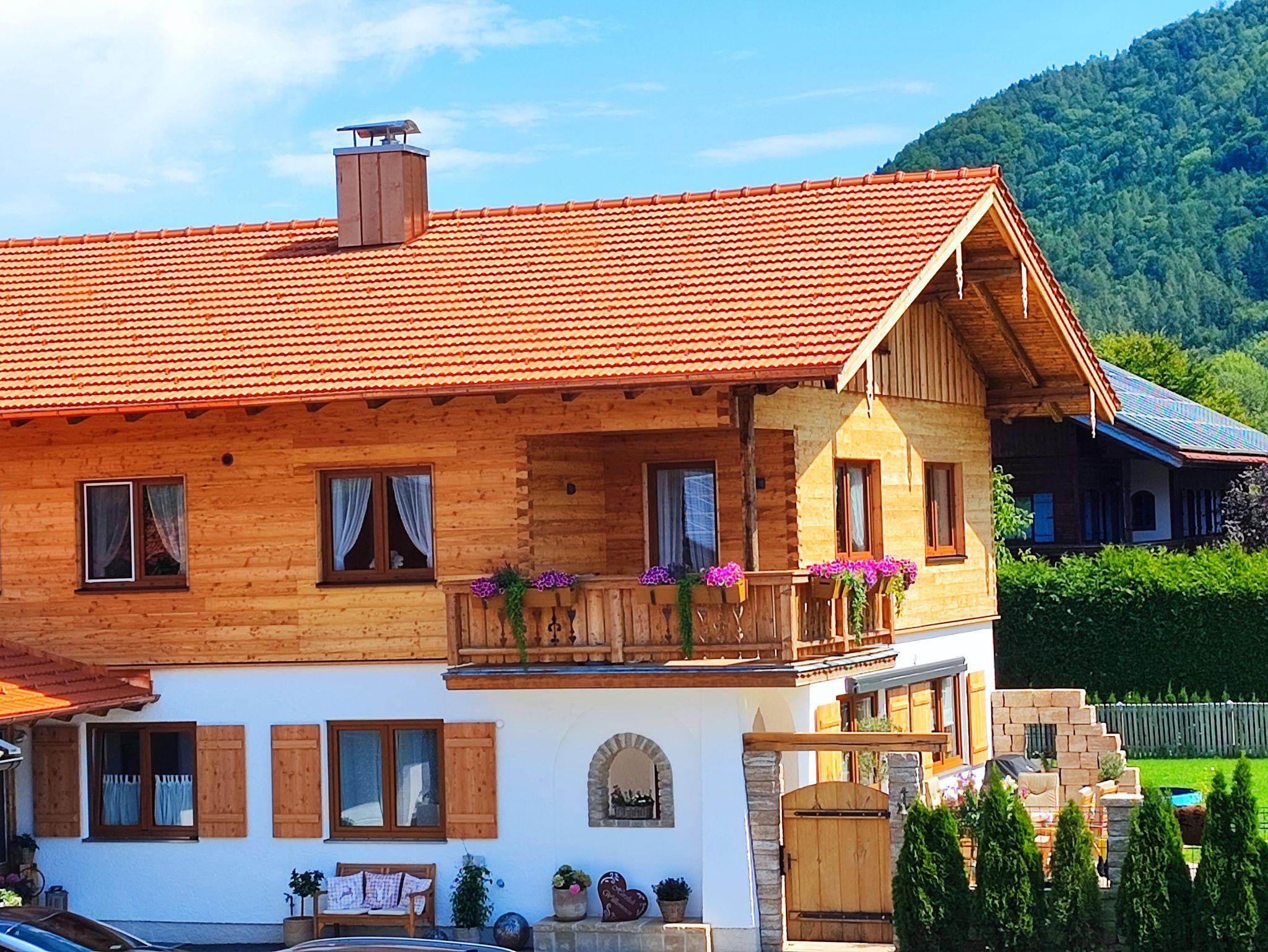 Wohnen Sie in einer großzügigen und hellen Ferienwohnung auf 102 qm/1. Stock im alpenländischen Stil mit zwei Schlafzimmern und Süd-Balkon mit Panoramablick auf die Berge. Die vollausgestattete Wohnung bietet Ihnen alle Vorzüge für einen angenehmen Aufenthalt. Der gemütliche Wohnraum ist mit viel Holz eingerichtet um eine Wohlfühl-Atmosphäre zu schaffen, mit einem schönen runden Sitz-Erker, ein streamingfähiger Flat-Kabel-TV und großem Sofa. Zwei separate Schlafzimmer, ein Schlafzimmer mit Doppelbett 2 x 2 m und ein Schlafzimmer mit Doppelbett 1,60 x 2 m. Voll ausgestattete Küche mit Ceranfeld-Herd/Backofen, Spülmaschine, Kaffee-Vollautomat, Mikrowelle, Kühlschrank/Tiefkühlfach, Toaster und Wasserkocher. Großes helles Badezimmer mit Dusche, Badewanne, WC, Urinal, Fön und Fenster zum Lüften. Waschmaschine, Wäschetrockner, Bügeleisen, Wäscheständer und Recycling Station im kleinen Hauswirtschaftsraum.