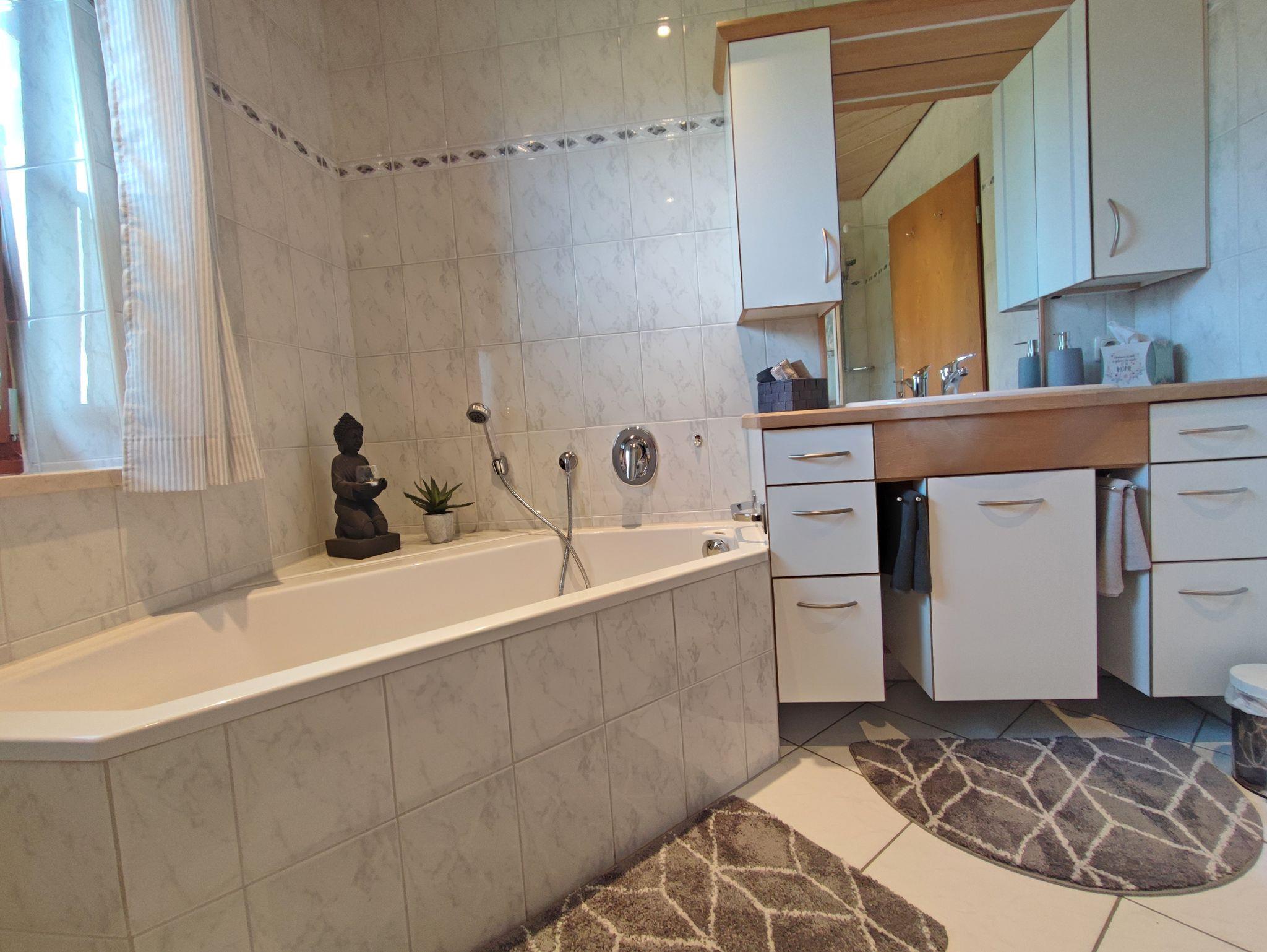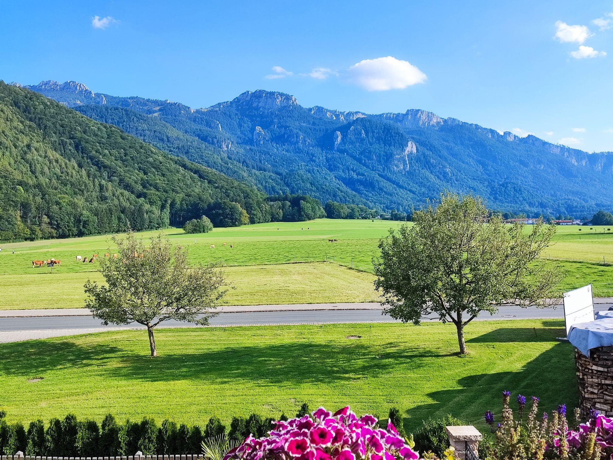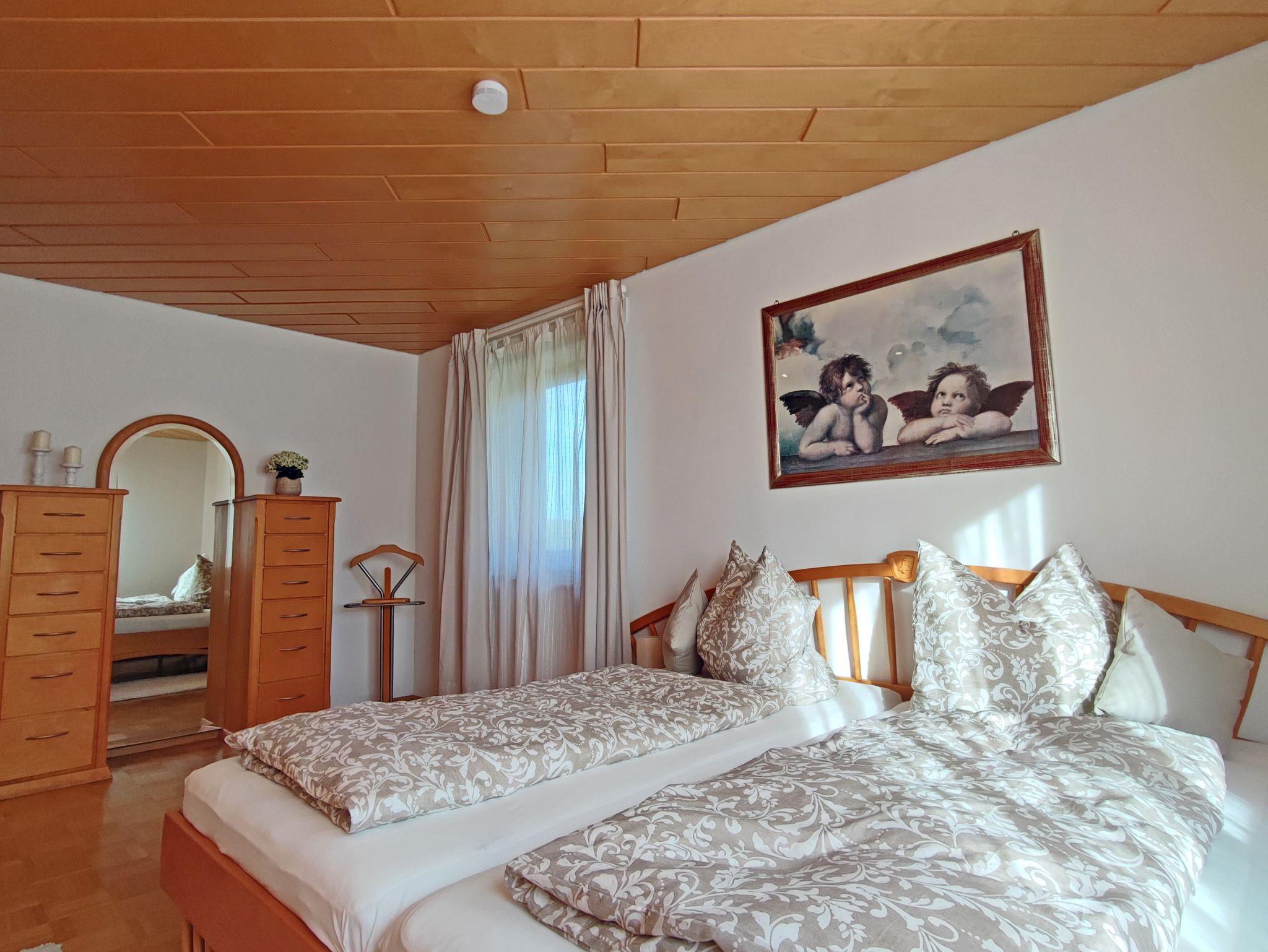Wohnen Sie in einer großzügigen und hellen Ferienwohnung auf 102 qm/1. Stock im alpenländischen Stil mit zwei Schlafzimmern und Süd-Balkon mit Panoramablick auf die Berge. Die vollausgestattete Wohnung bietet Ihnen alle Vorzüge für einen angenehmen Aufenthalt. Der gemütliche Wohnraum ist mit viel Holz eingerichtet um eine Wohlfühl-Atmosphäre zu schaffen, mit einem schönen runden Sitz-Erker, ein streamingfähiger Flat-Kabel-TV und großem Sofa. Zwei separate Schlafzimmer, ein Schlafzimmer mit Doppelbett 2 x 2 m und ein Schlafzimmer mit Doppelbett 1,60 x 2 m. Voll ausgestattete Küche mit Ceranfeld-Herd/Backofen, Spülmaschine, Kaffee-Vollautomat, Mikrowelle, Kühlschrank/Tiefkühlfach, Toaster und Wasserkocher. Großes helles Badezimmer mit Dusche, Badewanne, WC, Urinal, Fön und Fenster zum Lüften. Waschmaschine, Wäschetrockner, Bügeleisen, Wäscheständer und Recycling Station im kleinen Hauswirtschaftsraum.