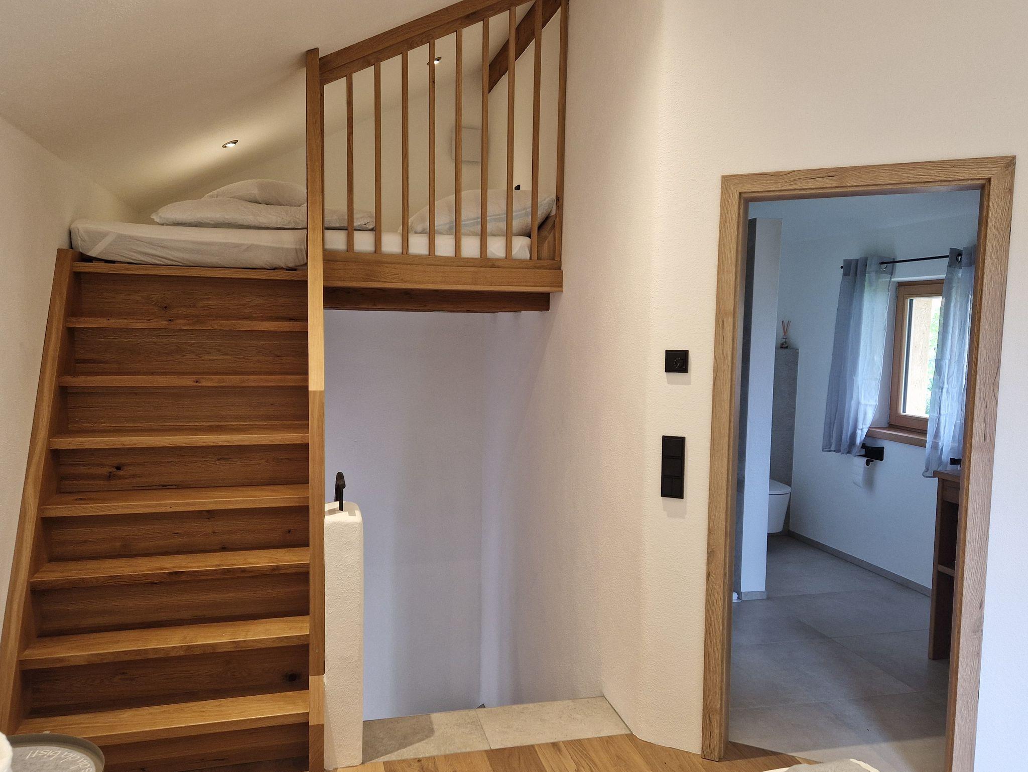 Unser gemütliches Chalet erstreckt sich über zwei Etagen und bietet Platz bis zu vier Personen – ideal für Familien, Paare oder Freunde. Im Erdgeschoss erwartet Sie eine offene, moderne Küche mit Geschirrspüler, Kühlschrank und Backofen, eine einladende Essecke sowie ein gemütlicher Wohnbereich. Von hier aus gelangen Sie direkt auf die Terrasse mit einem eigenen kleinen Garten, wo Sie einen traumhaften Blick auf Höhenberg, die charmante Kirche und die umliegenden Berge genießen können.