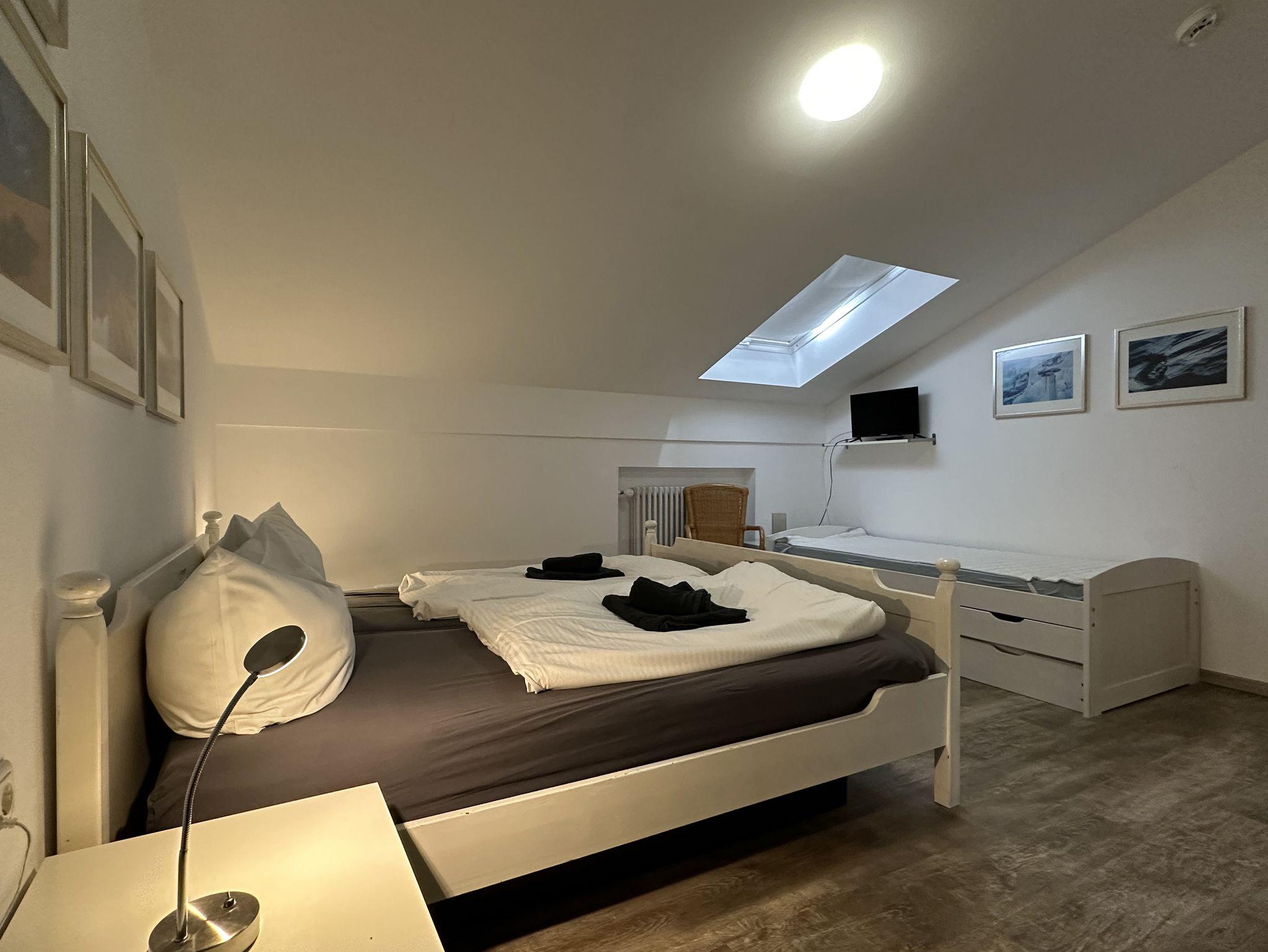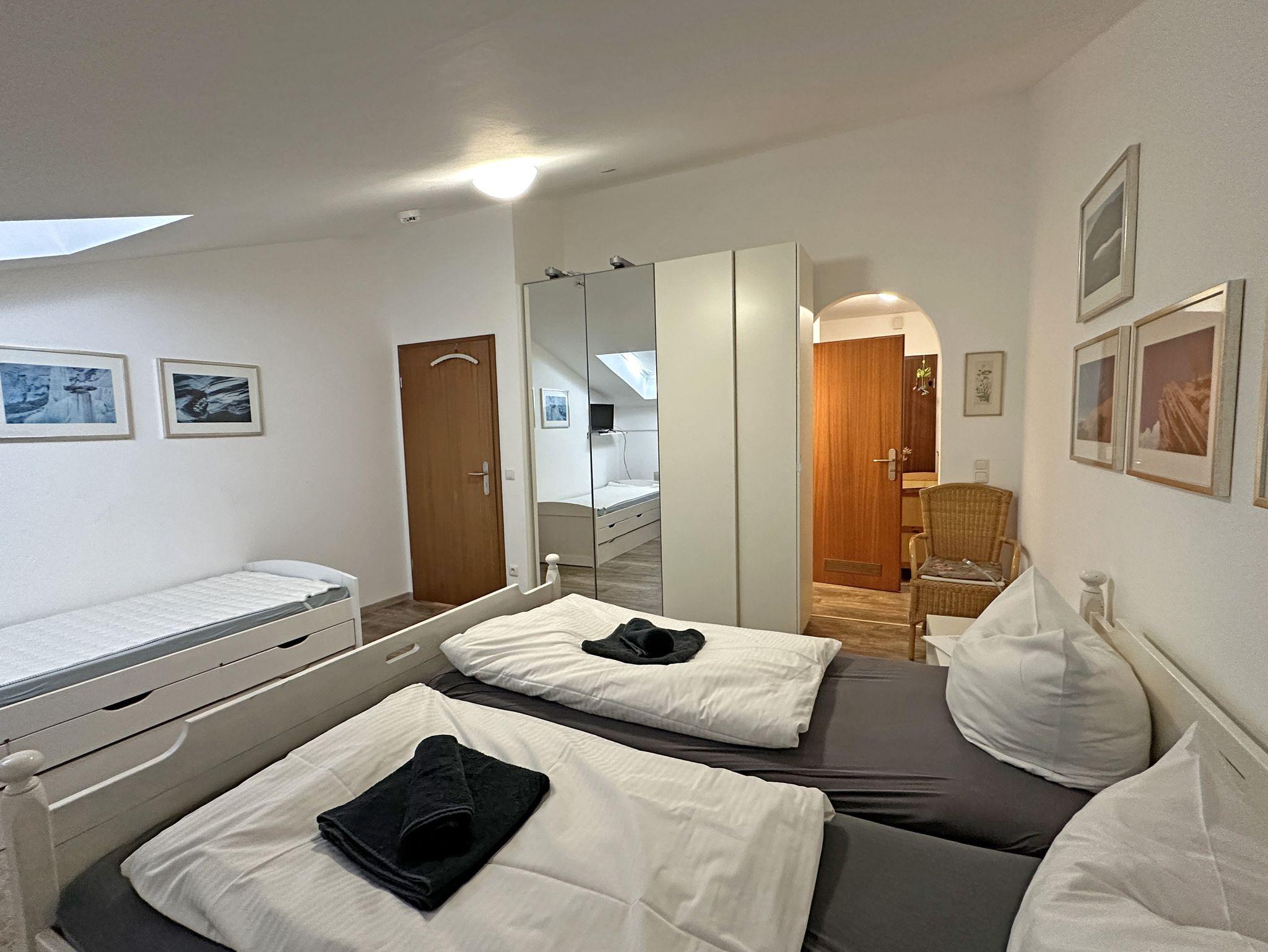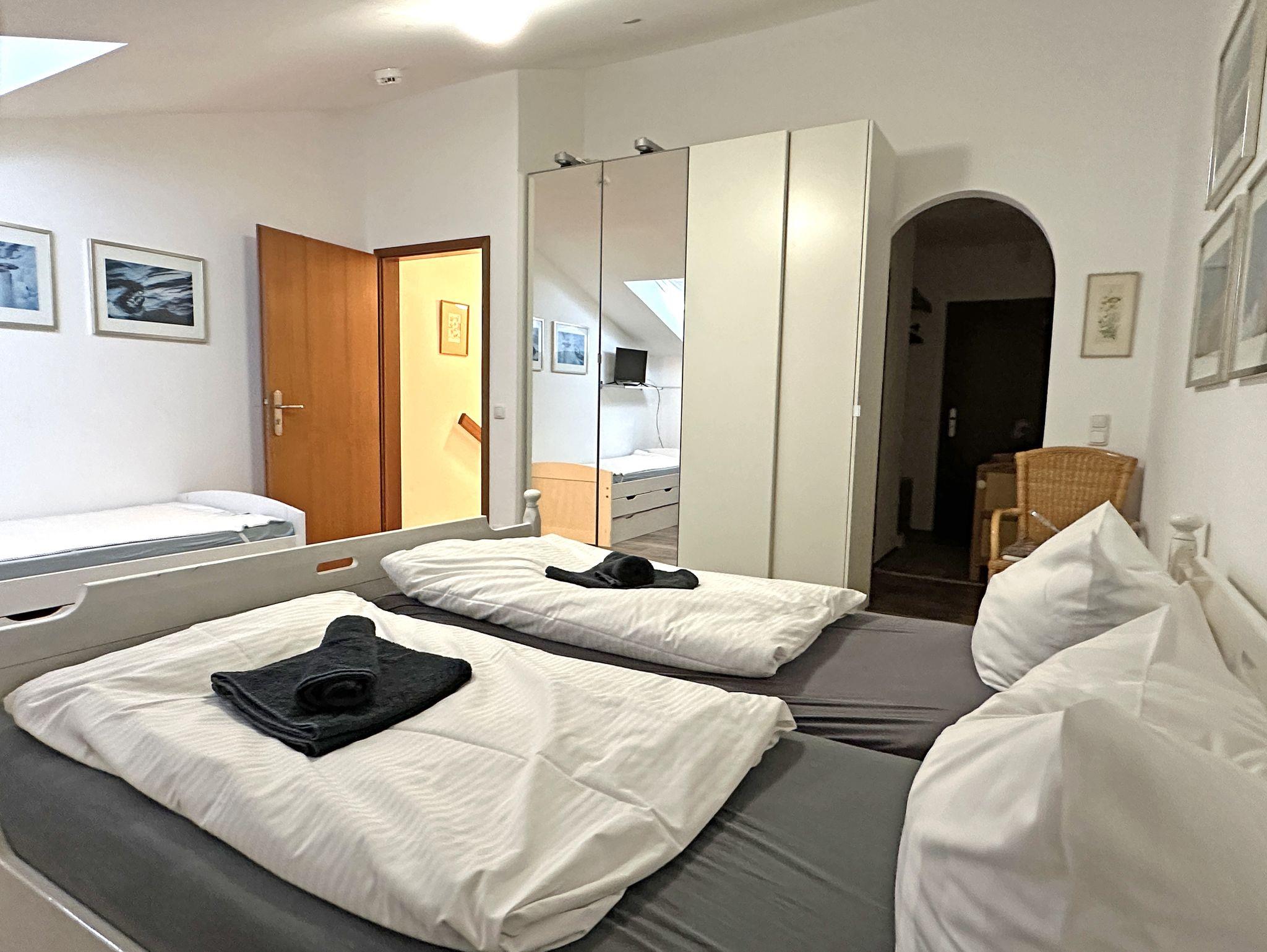 Unsere helle Nichtraucher-Maisonette-Ferienwohnung mit 56 qm liegt im 1. Obergeschoss und verfügt über einen sonnigen Balkon, der zum Entspannen einlädt. Die moderne Einrichtung mit weißen Möbeln verleiht der Wohnung ein elegantes und zugleich gemütliches Flair, sodass Sie sich sofort wie zu Hause fühlen. Im Wohnbereich erwartet Sie eine komfortable Essecke, eine ausziehbare Schlafcouch (1,40 m breit) für eine zusätzliche Person sowie Flat-SAT-TV, Telefon und kostenloses WLAN. Die Küchenzeile mit Mikrowelle, 4-Platten-Kochfeld, Kaffeefiltermaschine, Wasserkocher bietet alles, was Sie für die Zubereitung kleiner Mahlzeiten benötigen. Zwei gleich ausgestattete Badezimmer mit Dusche und WC sorgen für zusätzlichen Komfort – ideal für Familien oder Freunde. Über eine Treppe erreichen Sie die zweite Ebene mit einem großzügigen Schlafzimmer, das mit einem Doppelbett, einem Einzelbett sowie einem Babybett/Kindergitterbett für Kinder bis 2 Jahre ausgestattet ist. Auch hier steht Ihnen ein Flat-SAT-TV zur Verfügung. Bettwäsche und Handtücher sind selbstverständlich vorhanden, sodass Sie unbeschwert anreisen können. Haustiere sind willkommen – auch Hunde dürfen gegen Aufpreis mitgebracht werden. Diese Wohnung bietet die perfekte Kombination aus moderner Ausstattung und gemütlicher Atmosphäre und ist damit ein idealer Rückzugsort für einen entspannten Urlaub.