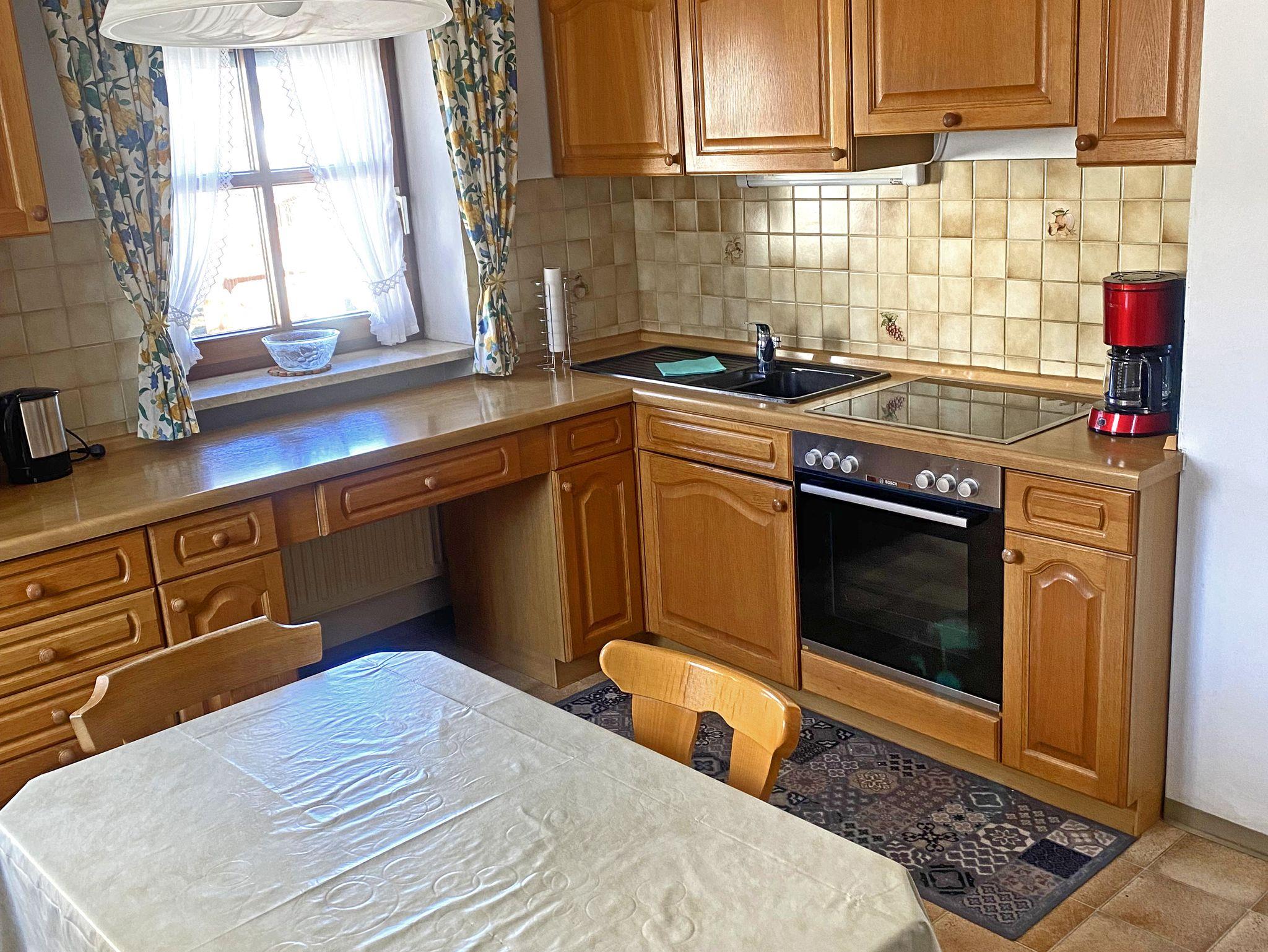 Die Wohnung erreicht man über einen separaten Eingang seitlich am Bauernhaus und hat leider keinen Balkon, dafür am Haus eine große Liegewiese mit Obstgarten und Gartenhäuschen zum Grillen.