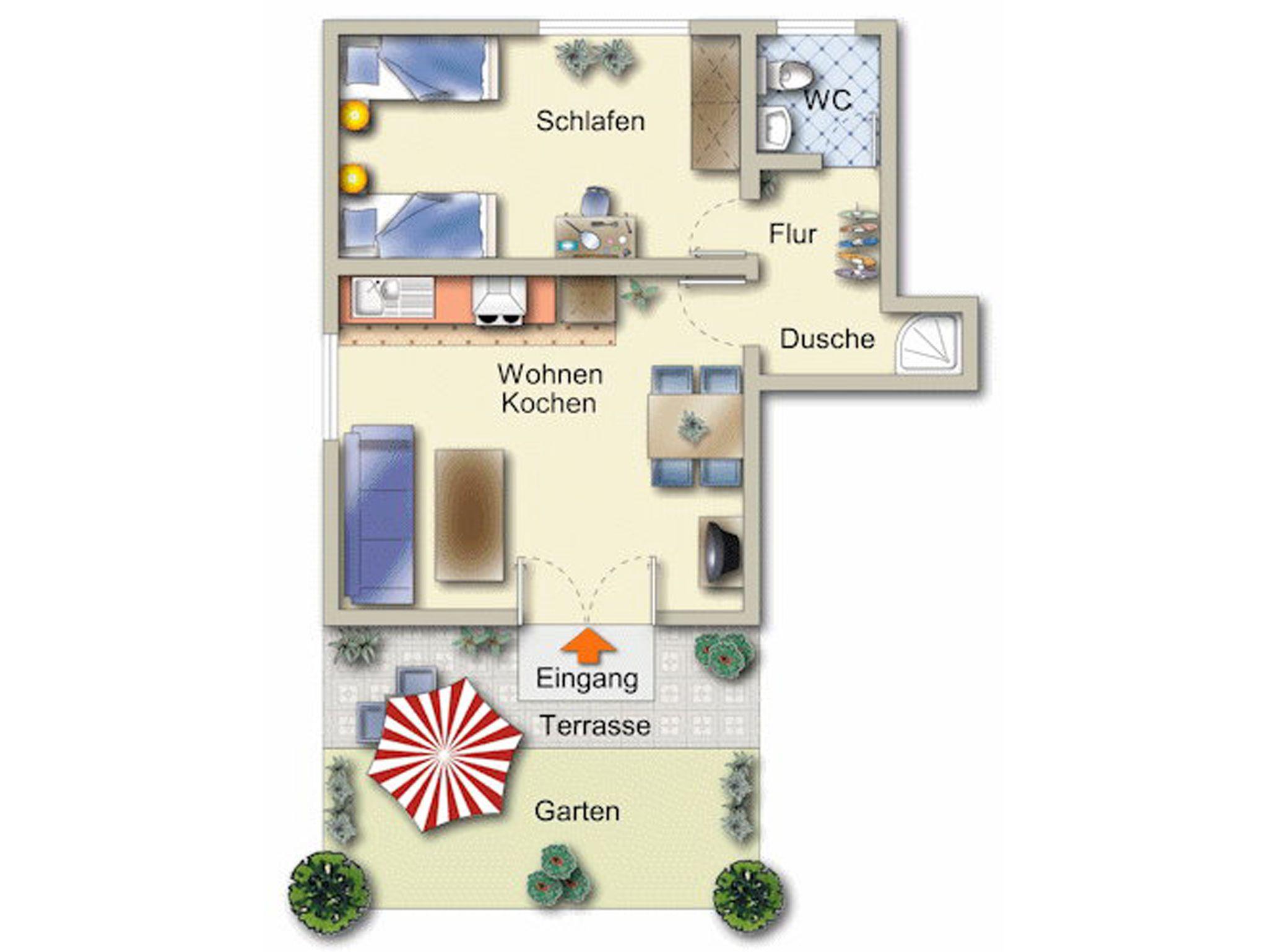 Nichtraucher-Ferienwohnung, bedingt Behindertengerecht, ebenerdiger Eingang über die Terrasse möglich. Wohnküche mit ausziehbarem Schlafsofa, Essecke, SAT-TV und W-LAN. Extra Schlafzimmer mit Doppelbetten (auch getrennt stellbar), extra WC und kleine Diele. Schöne Terrasse mit Liegewiese und Sitzgruppe im Garten mit Grillmöglichkeit.