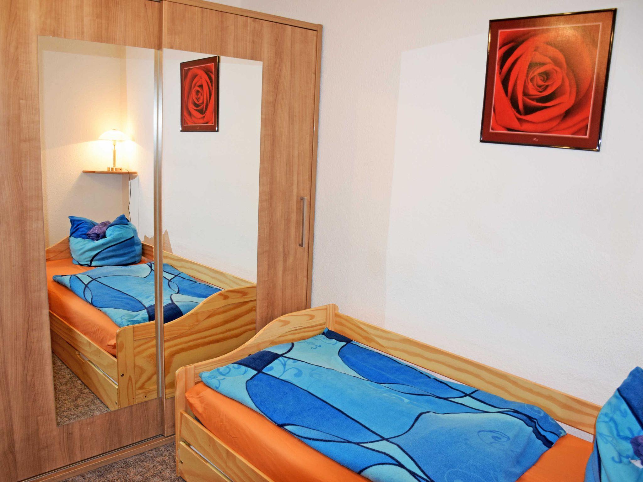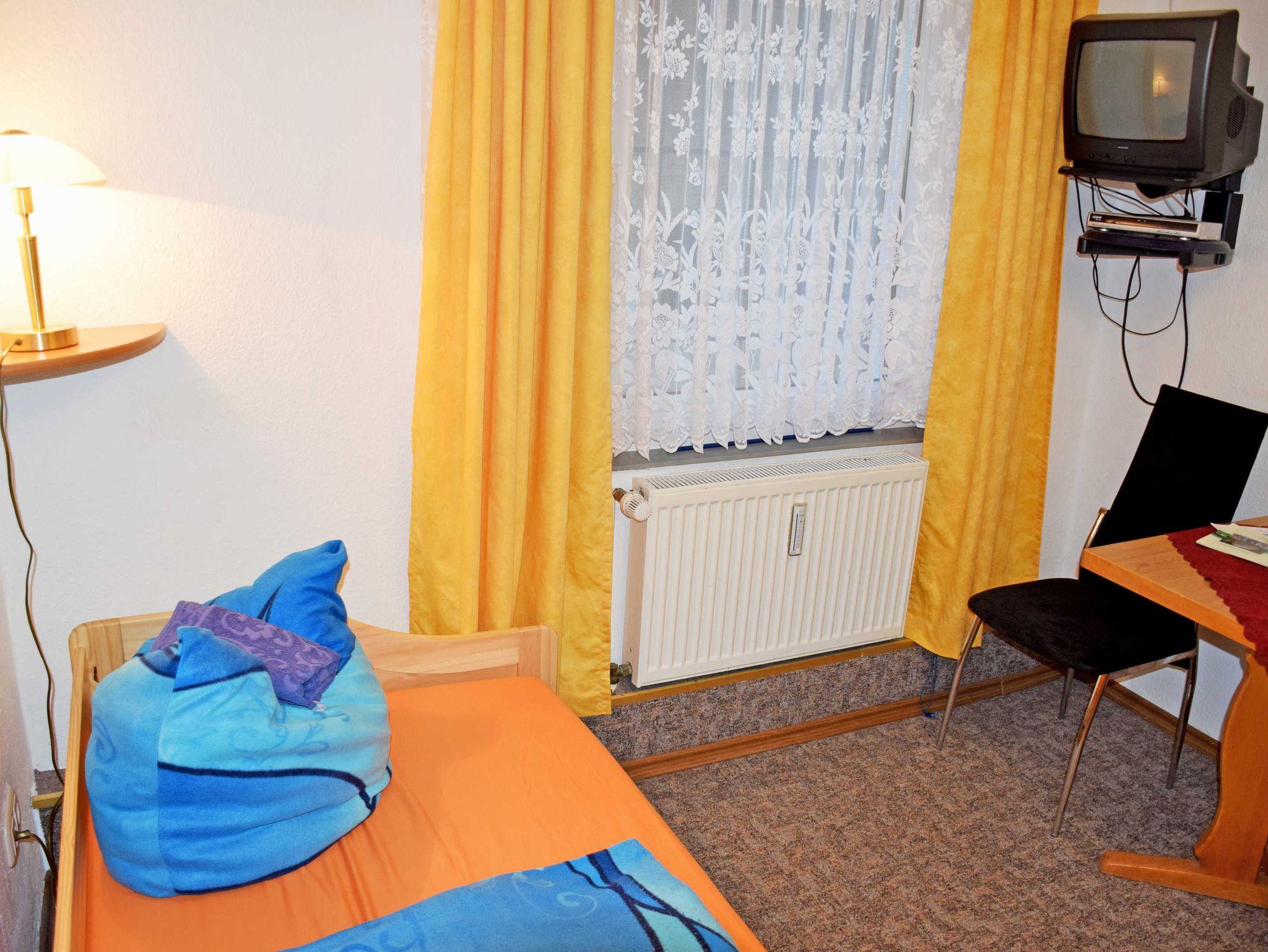 Das Ferienzimmer links verfügt über ein bequemes Einzelbett, (bei dem unten ein weiteres Einzelbett ausgezogen werden kann) mit Nachttisch und Leselampe, einen Kleiderschrank, Tisch und Stühle sowie einen Flachbild-TV.