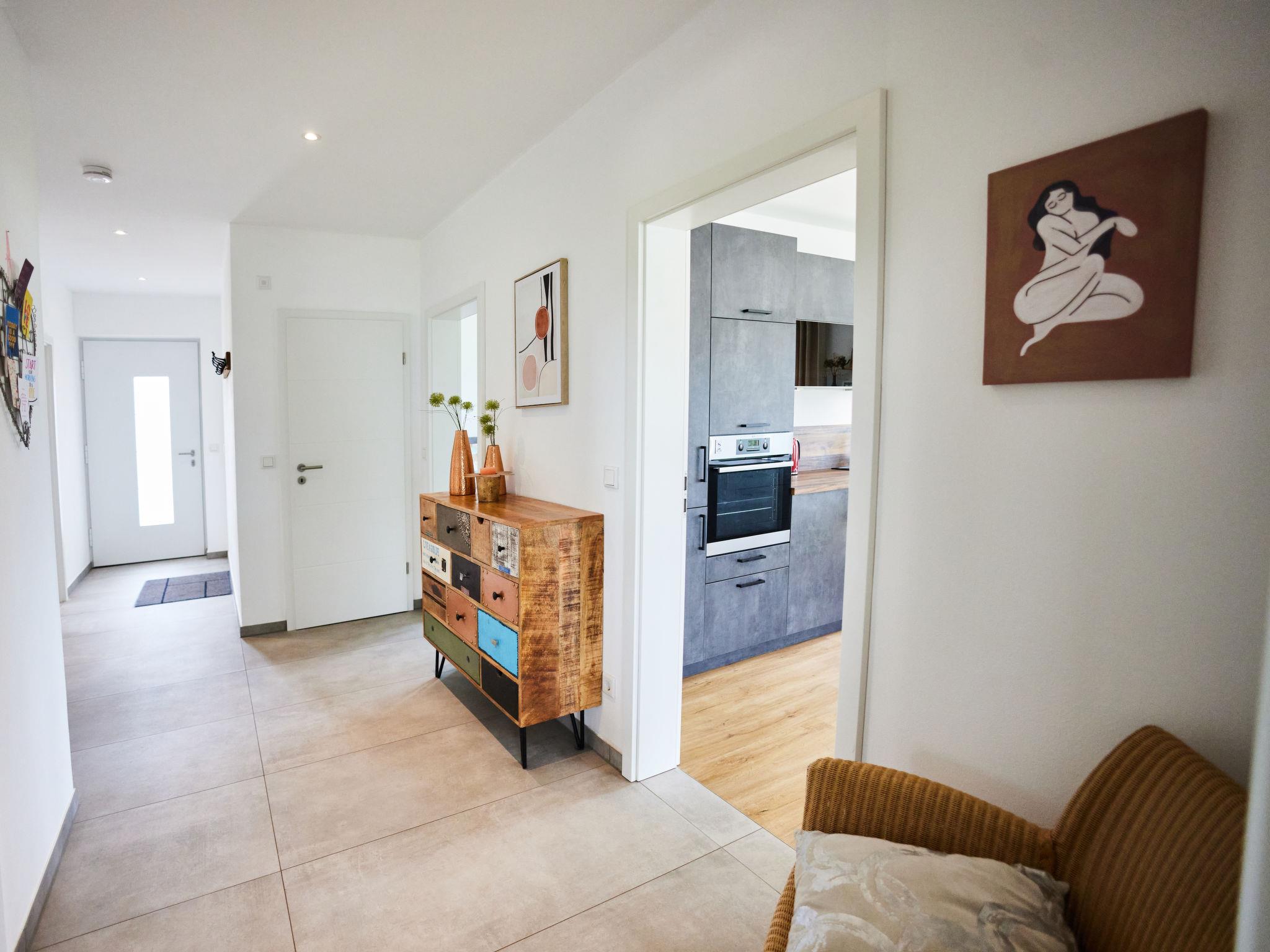 "am Sonnenhang", 3-Zimmer-Wohnung 95 m2, im Erdgeschoss. Komfortabel und modern eingerichtet: Wohn-/Esszimmer mit Esstisch und Sat-TV (Flachbildschirm), Radio und Stereoanlage. Ausgang zur Terrasse. 1 Zimmer mit 1 Doppelbett (180 cm, Länge 200 cm), Sat-TV (Flachbildschirm). Ausgang zur Terrasse. 1 Zimmer mit 1 Doppelbett (180 cm, Länge 200 cm), Sat-TV (Flachbildschirm). Offene Küche (Backofen, Geschirrspüler, 4 Glaskeramikplatten, Toaster, Wasserkocher, Mikrowelle, Tiefkühler, elektrische Kaffeemaschine). Dusche, sep. WC. Warmluftheizung, Fussbodenheizung. Terrasse 12 m2, kleiner Garten. Terrassenmöbel, Liegestühle (2), Abstellkammer. Zur Verfügung: Waschmaschine, Kinderhochstuhl, Babybett. Internet (WLAN, gratis). Parkplatz (überdacht, 1 Auto) beim Haus. Bitte beachten: Nichtraucher-Unterkunft. Maximal 2 Haustiere/Hunde erlaubt. Rauchmelder.