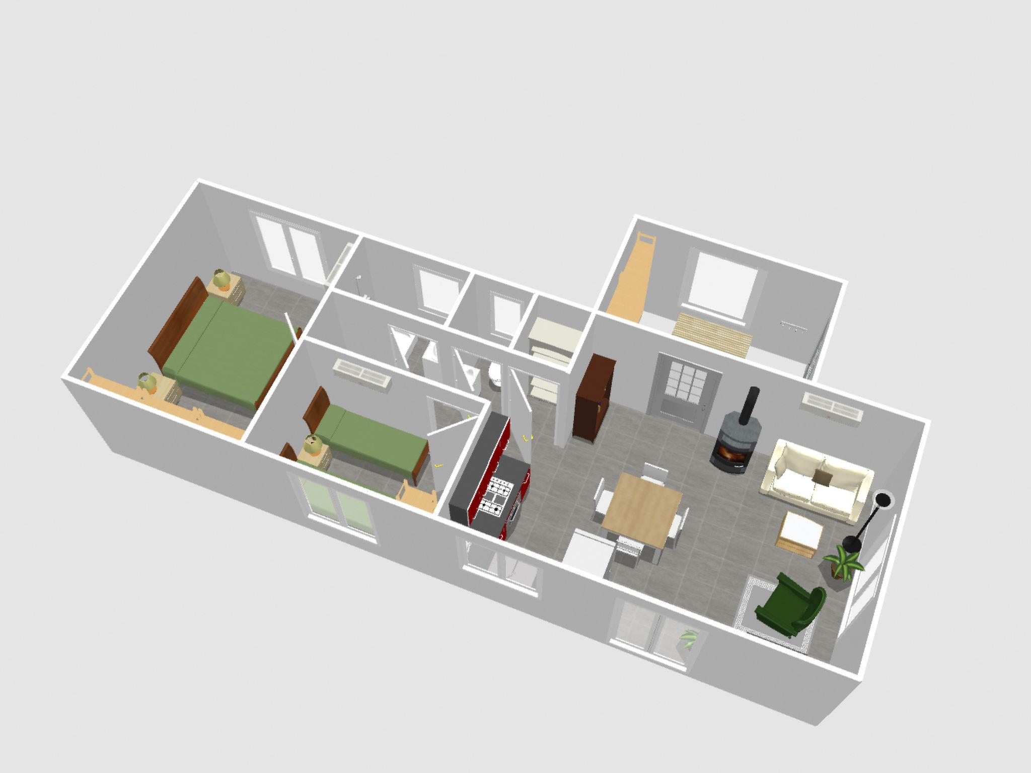 Im Haus ist 100% Linoleum-Naturboden verlegt, es gibt einen Pelletofen und eine Klimaanlage, die auch heizen kann. Im offenen Wohnbereich mit HD-TV findest du eine vollausgestattete Küche mit Essplatz für 4 Personen, ein bequemes Schlafsofa sowie einen Schaukelstuhl für extra relaxte Momente. Es gibt ein großes Schlafzimmer mit einem 1.60 m Doppelbett und ein kleineres Schlafzimmer mit zwei 0.70 m Einzelbetten, die auch als 1.40 m Doppeltbett genutzt werden können. Das Badezimmer mit großer Dusche, ist vom WC getrennt und es gibt einen zusätzlichen Abstellraum.