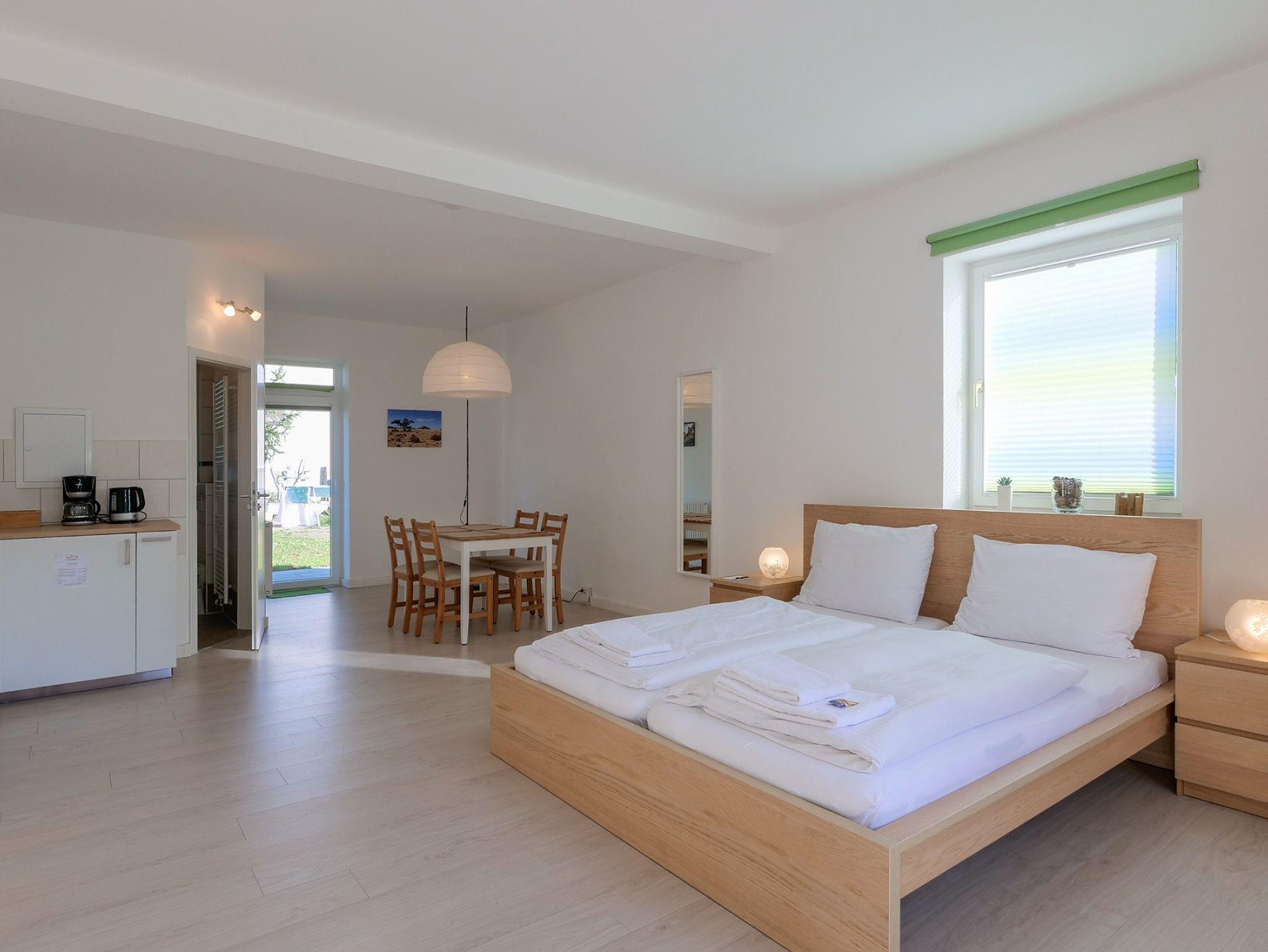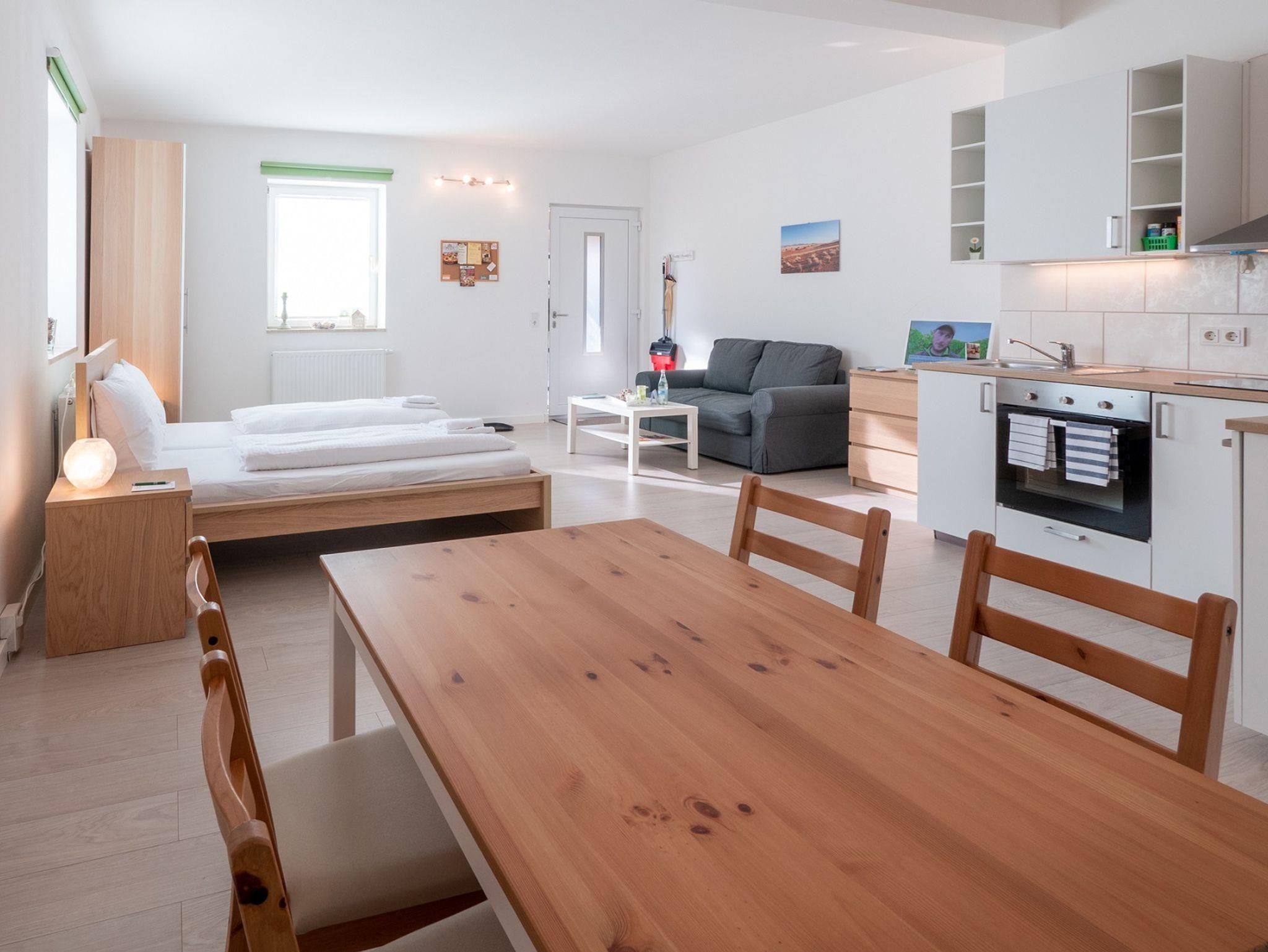 Wohnbereich und Schlafbereich mit Doppelbett und Schlafsofa (Aufbettung für 1-2 Personen möglich) sind hier kombiniert. Außerdem gibt es eine voll ausgestattete Küchenzeile mit Herd, Backofen, Kühlschrank, Geschirr, Kaffeemaschine, Wasserkocher und Toaster und nebenan eine gemütliche Essecke. Zur Zimmerausstattung gehören auch eine Sitzmöglichkeit, Fernseher und kostenloses Wlan. Das Badezimmer ist modern und mit Dusche, WC und Handtüchern ausgestattet. Das Apartment befindet sich im Erdgeschoss und verfügt über eine Terrasse mit Tisch und Stühlen und Zugang zur großzügigen Gartenanlage.