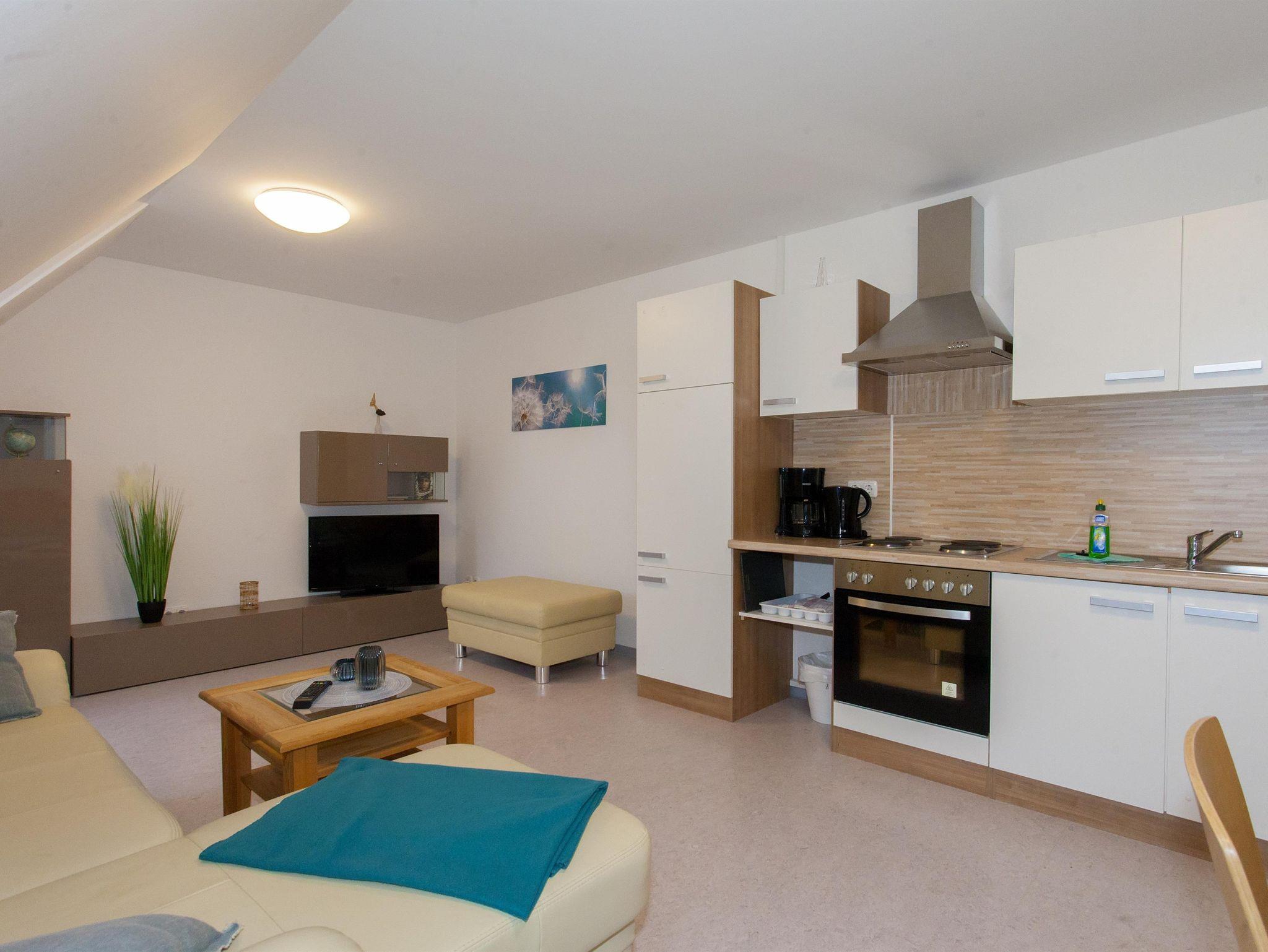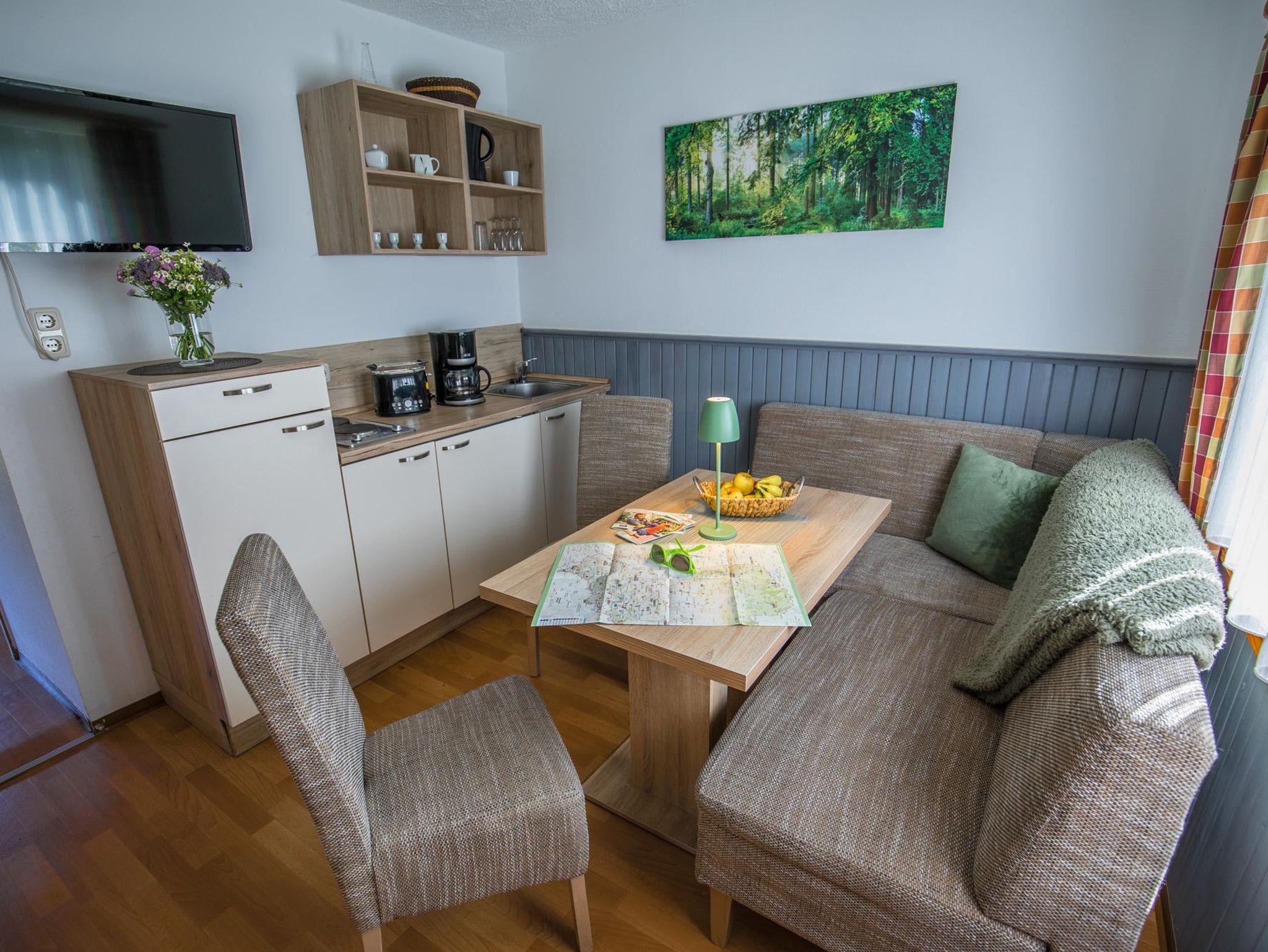 Wohnküche mit TV, Toaster, Kaffeemaschine und Kochgelegenheit