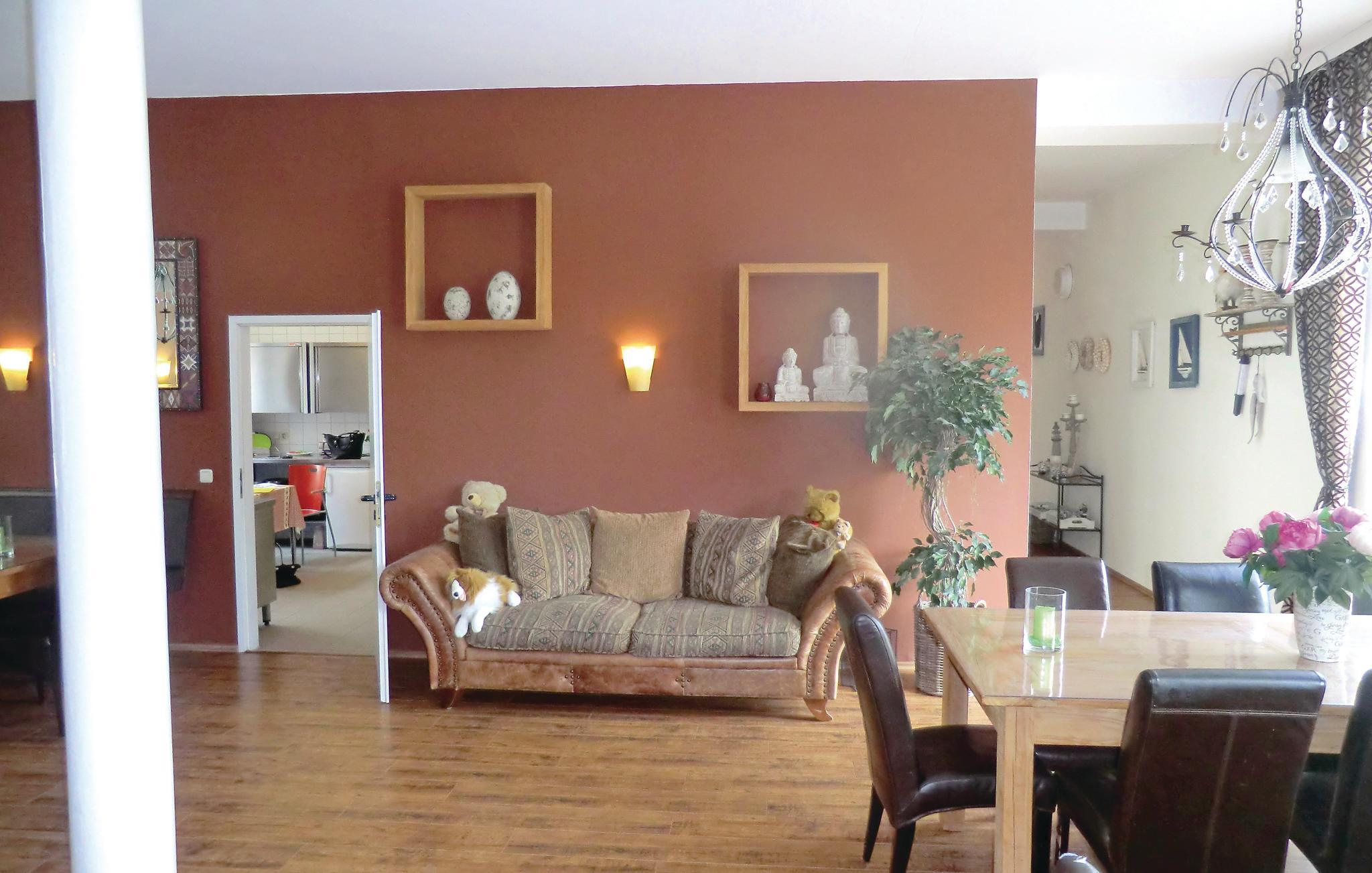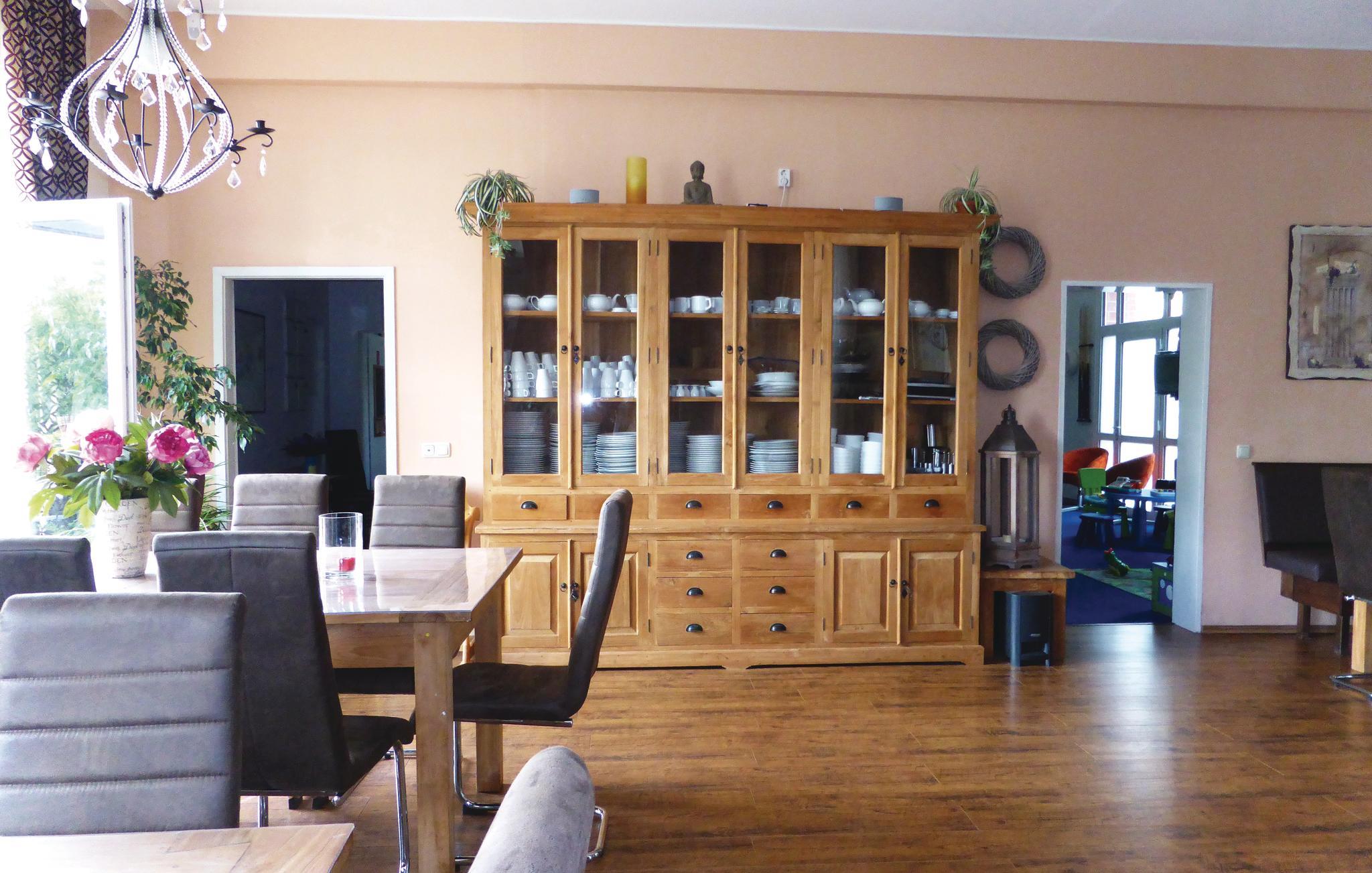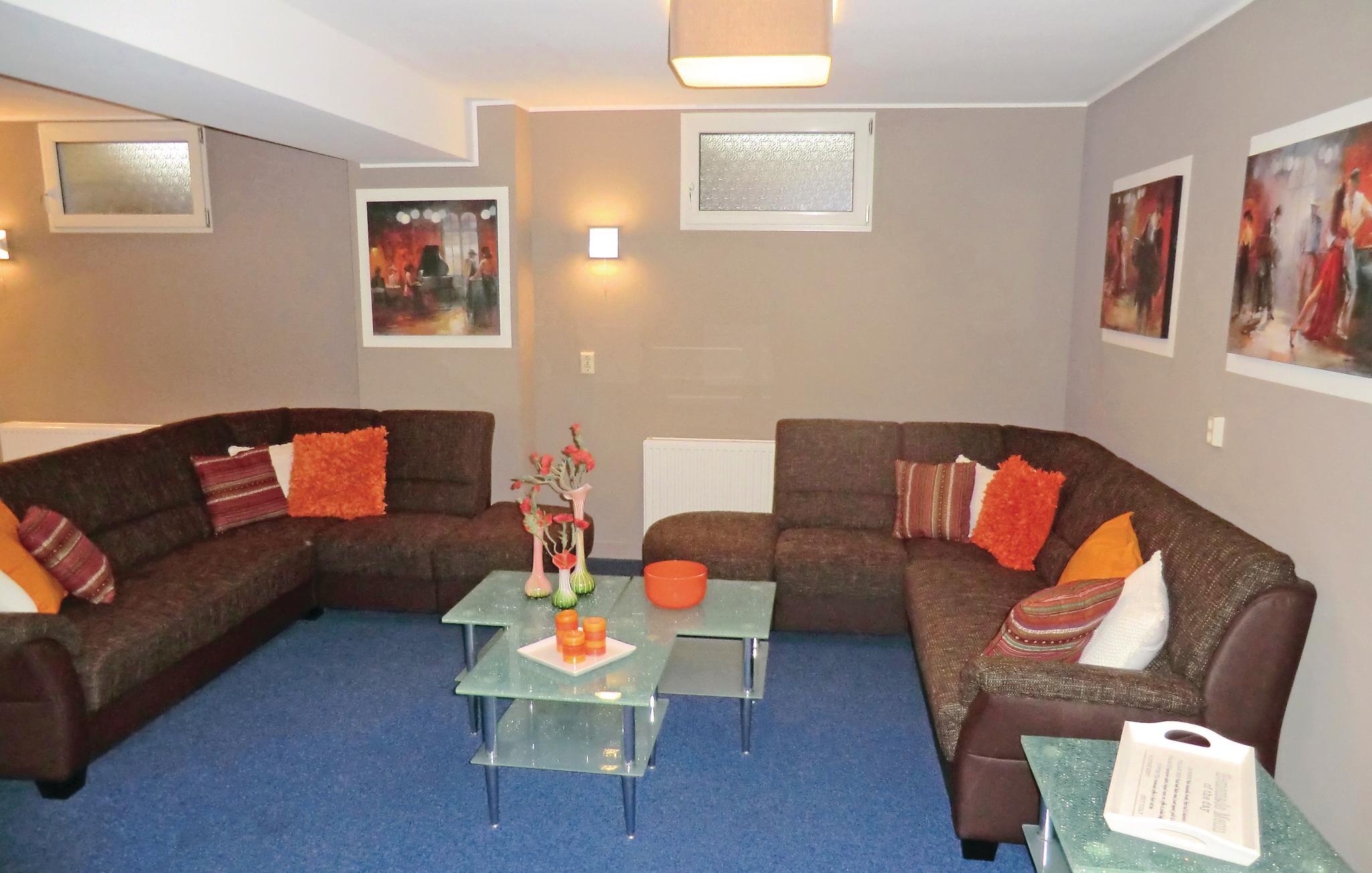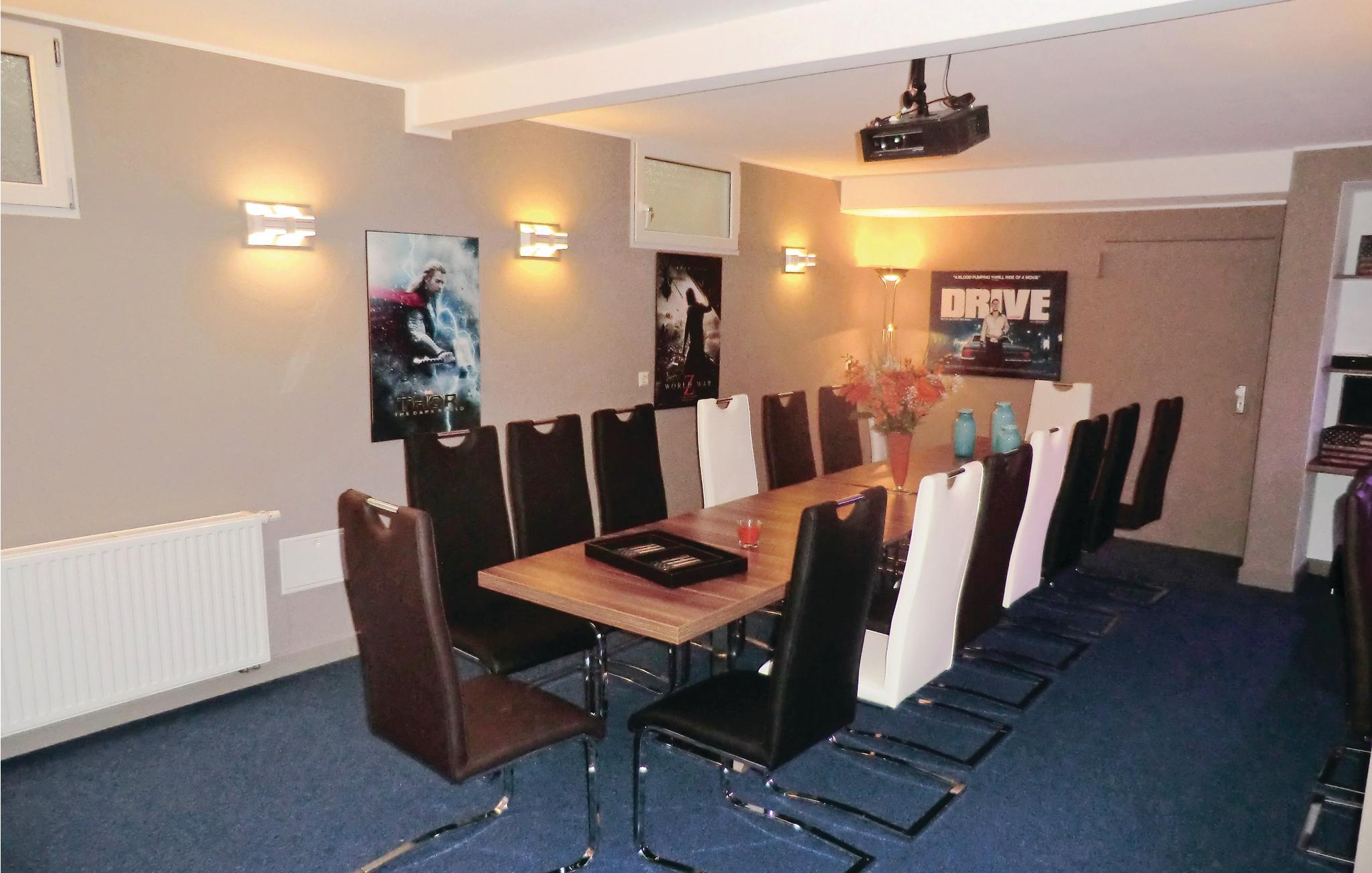 Eine Etage weiter unten bzw. im Souterrain erwarten Sie ein Seminarraum mit Leinwand und Technik, eine Sauna, eine weitere Küche und eine gemütliche Sitzecke. Hier befindet sich ebenso ein Ausgang in den Garten. Das Ferienhaus verfügt über einen elektrischen Kamin. Genießen Sie Ihre Familienfeier, die Gruppenreise oder den Ausflug mit der Sportgruppe in diesem modern und gemütlich ausgestatteten Ferienhaus.