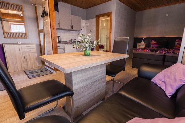Das Apartment bietet auf ca. 25m² ein kombiniertes Schlaf-/Wohnzimmer (2x Einzelbett, Wohnbereich mit Couch , Esstisch für 2 Personen , TV, sowie Küchenzeile mit Herd, Wasserkocher, Kühlschrank und ein Bad mit Dusche/WC, Haartrockner, den Rahmen für einen erholsamen Aufenthalt.