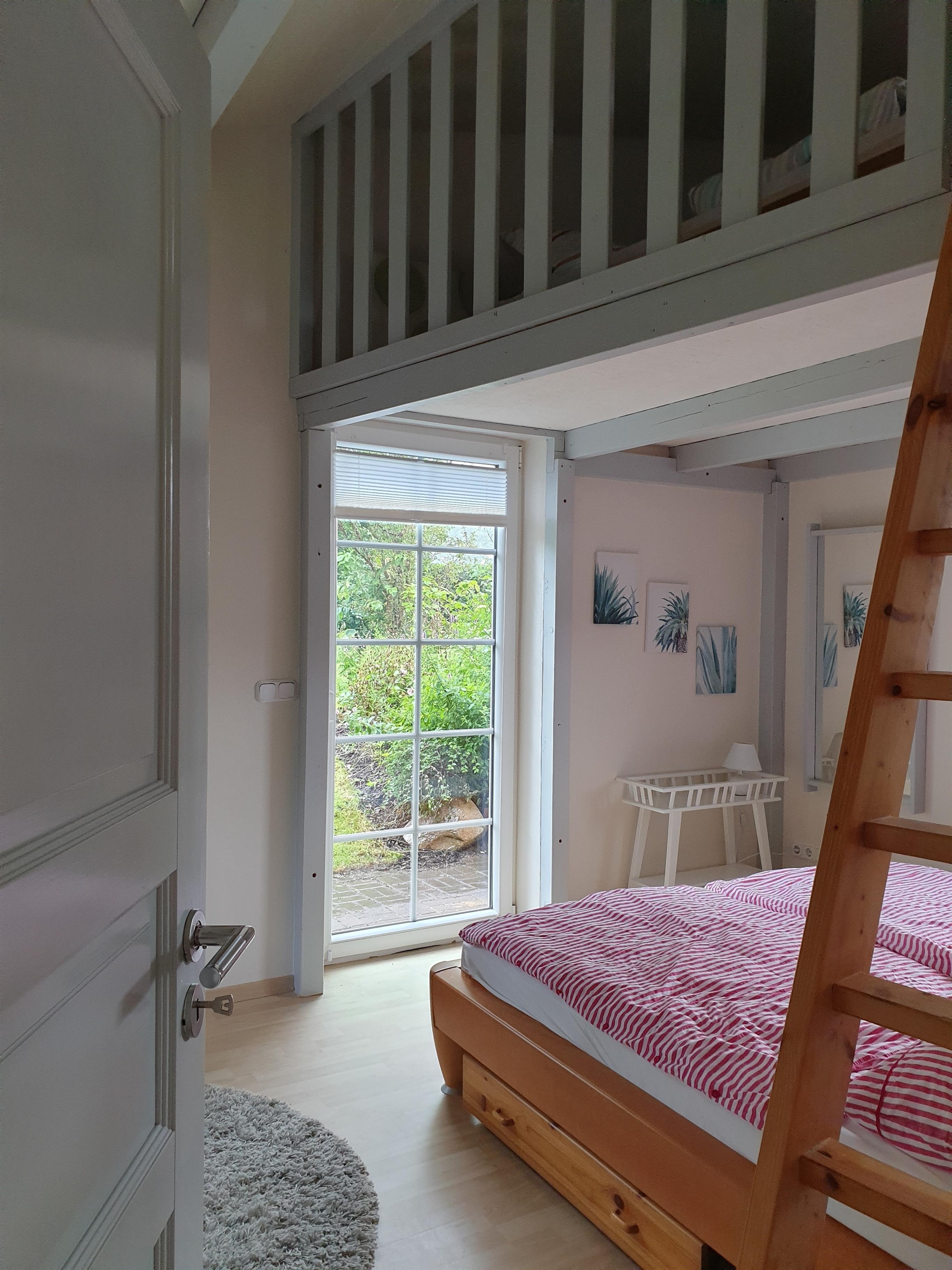 Diese Wohnung ist nur für maximal 2 Erwachsene und 2 Kinder geeignet. Im Schlafzimmer steht ein bequemes Doppelbett zur Verfügung, darüber befindet sich eine Empore mit einem weiteren Schlafplatz für 2 Kinder, erreichbar nur über eine Leiter.