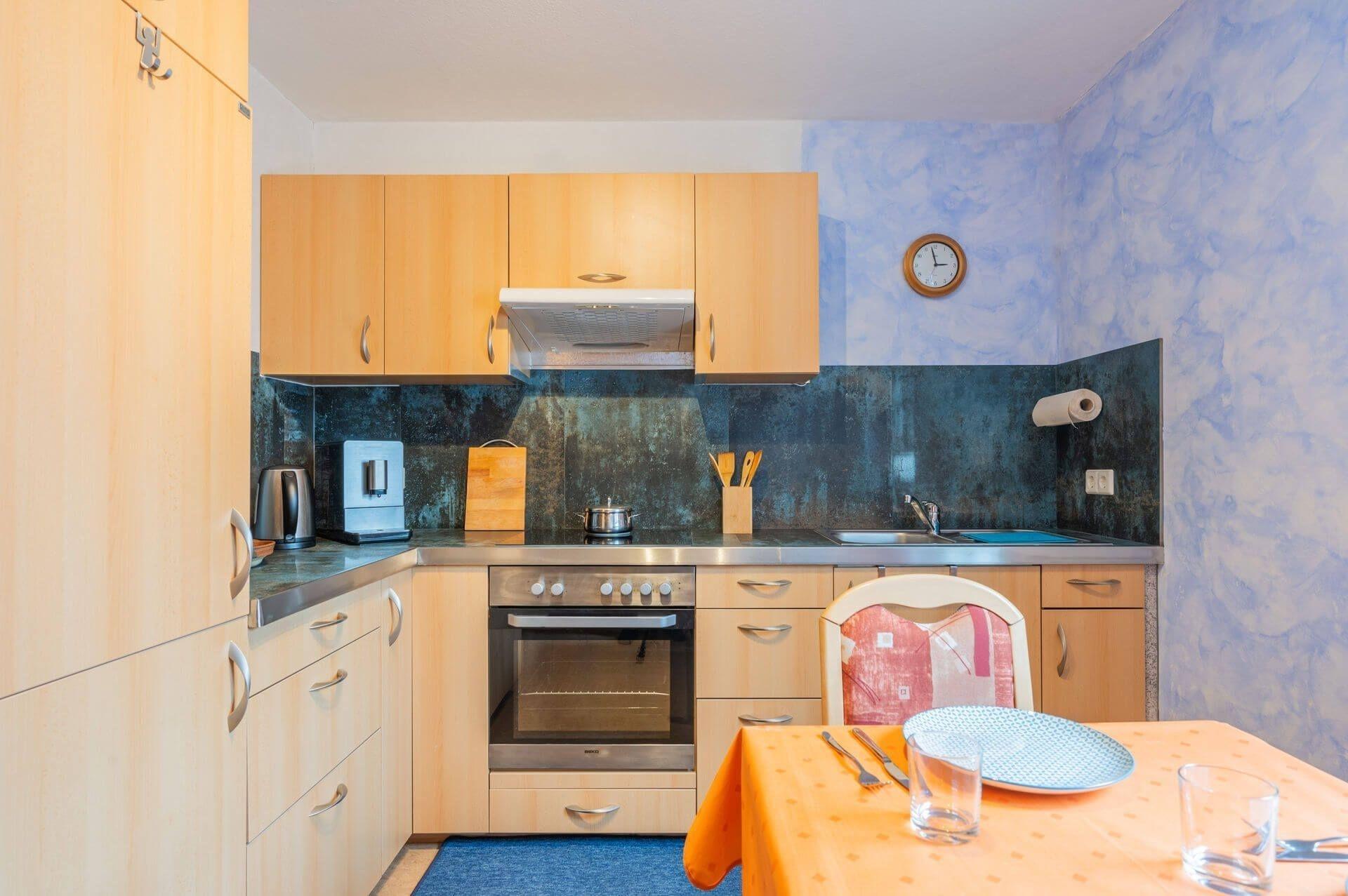 Die Küche bietet alles Notwendige an Geschirr, Besteck, Töpfen etc. sowie eine Kaffeeautomaten.
