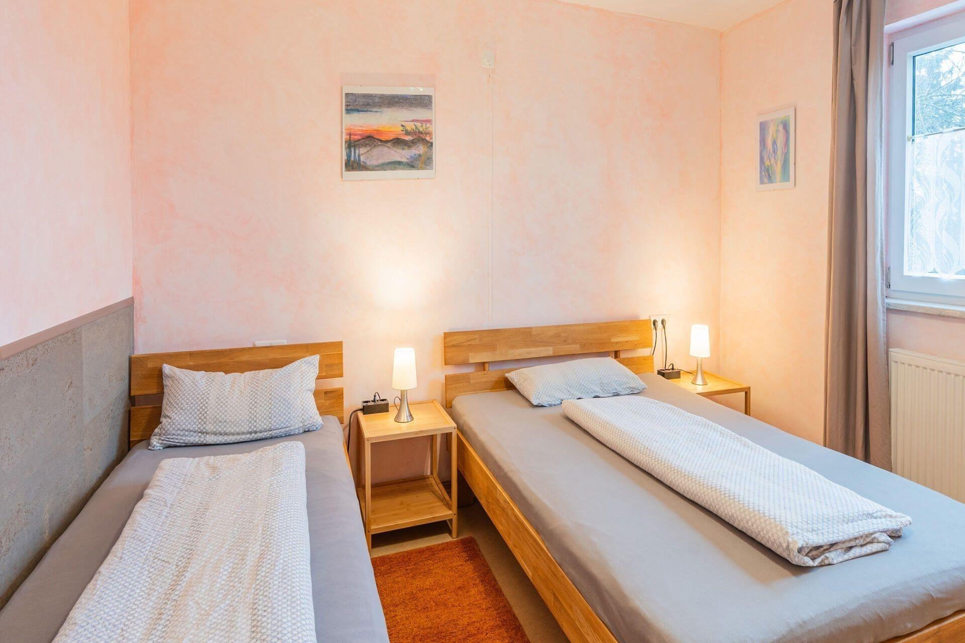 Mit 2 Einzelbetten, einem schmales Doppelbett (140 cm) und einem Schlafsofa können bis zu 5 Personen in der Wohnung übernachten