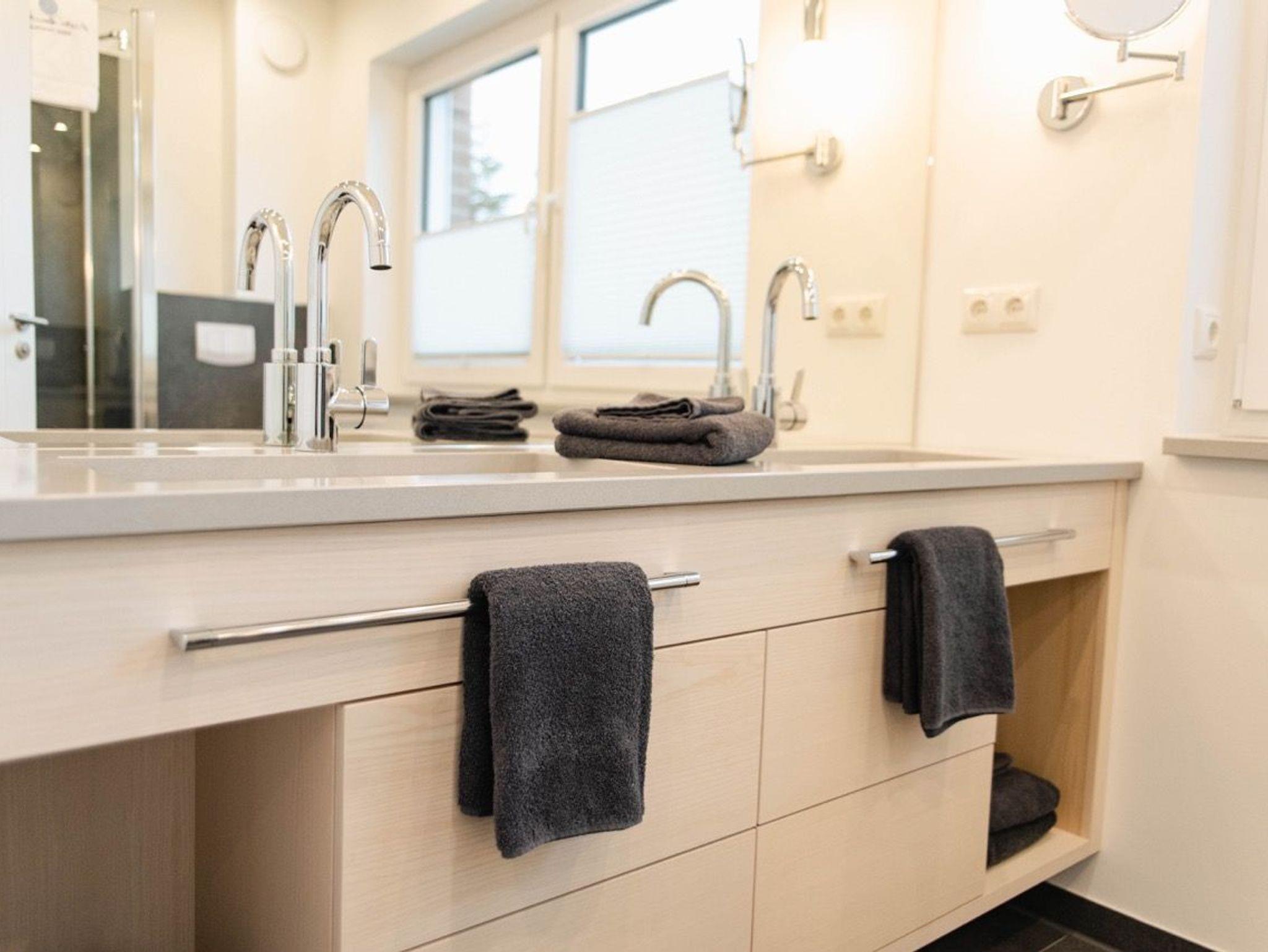 Im Obergeschoss befindet sich ein Schlafzimmer mit Doppelbett sowie ein Kinderzimmer mit zwei Einzelbetten und das Badezimmer mit ebenerdiger Dusche und zwei Waschbecken.