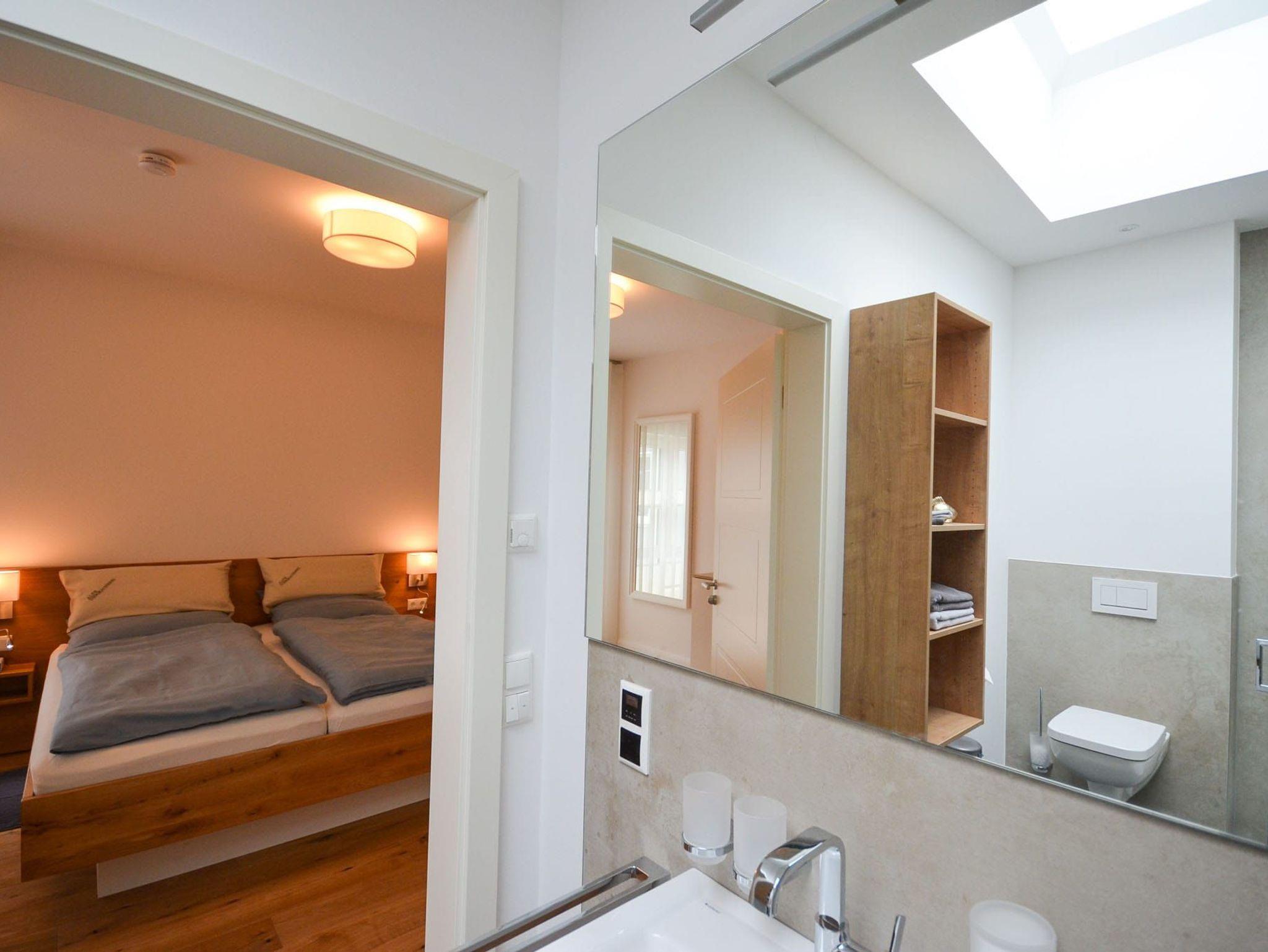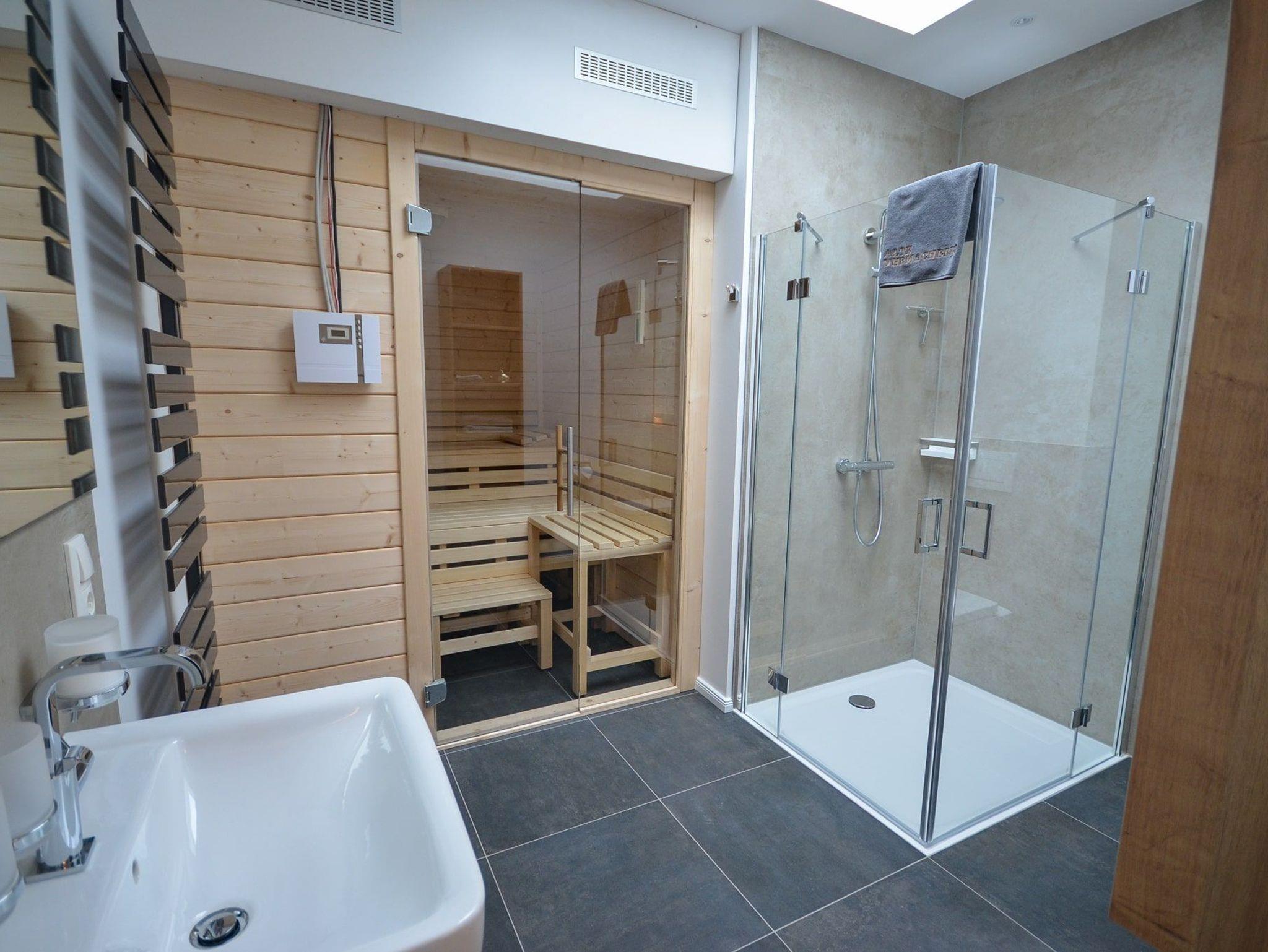 Das Tageslichtbad grenzt en Suite an das Schlafzimmer. Es hat ein großes, elektrisch bedienbares Oberlicht, eine ebenerdige, verglaste Dusche (120 x 100 cm) mit Regendusche und Handbrause, einen Waschtisch, einen Handtuchheizkörper und ein WC, ausreichend Ablageflächen sowie ein Einbauradio. Aber das ist noch nicht alles, wir bieten Ihnen mit diesem Apartment mit einer Holzsauna Ihre eigene kleine Wellnessoase.