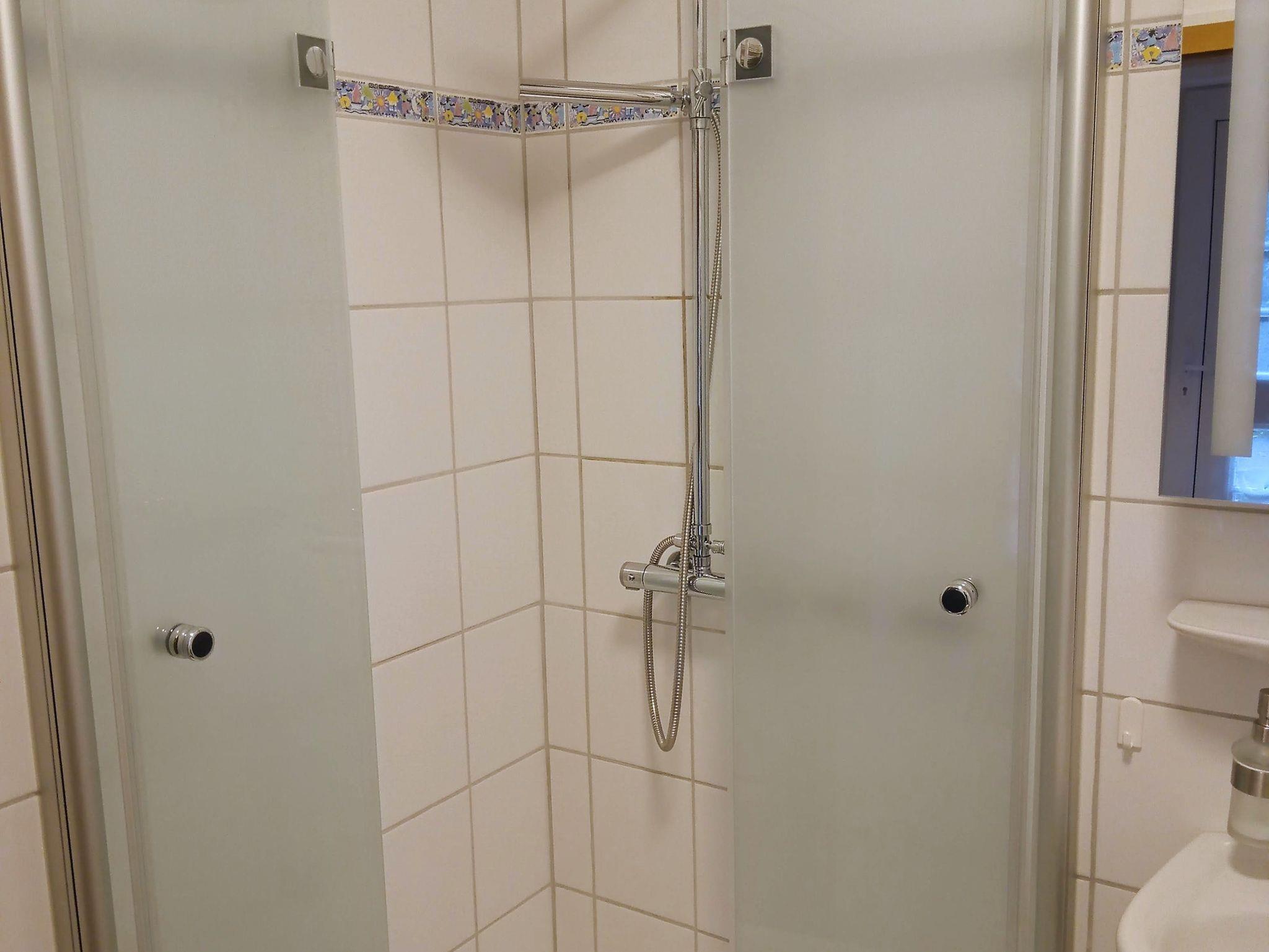 - ein Tageslicht Badezimmer mit Dusche, Waschbecken und WC