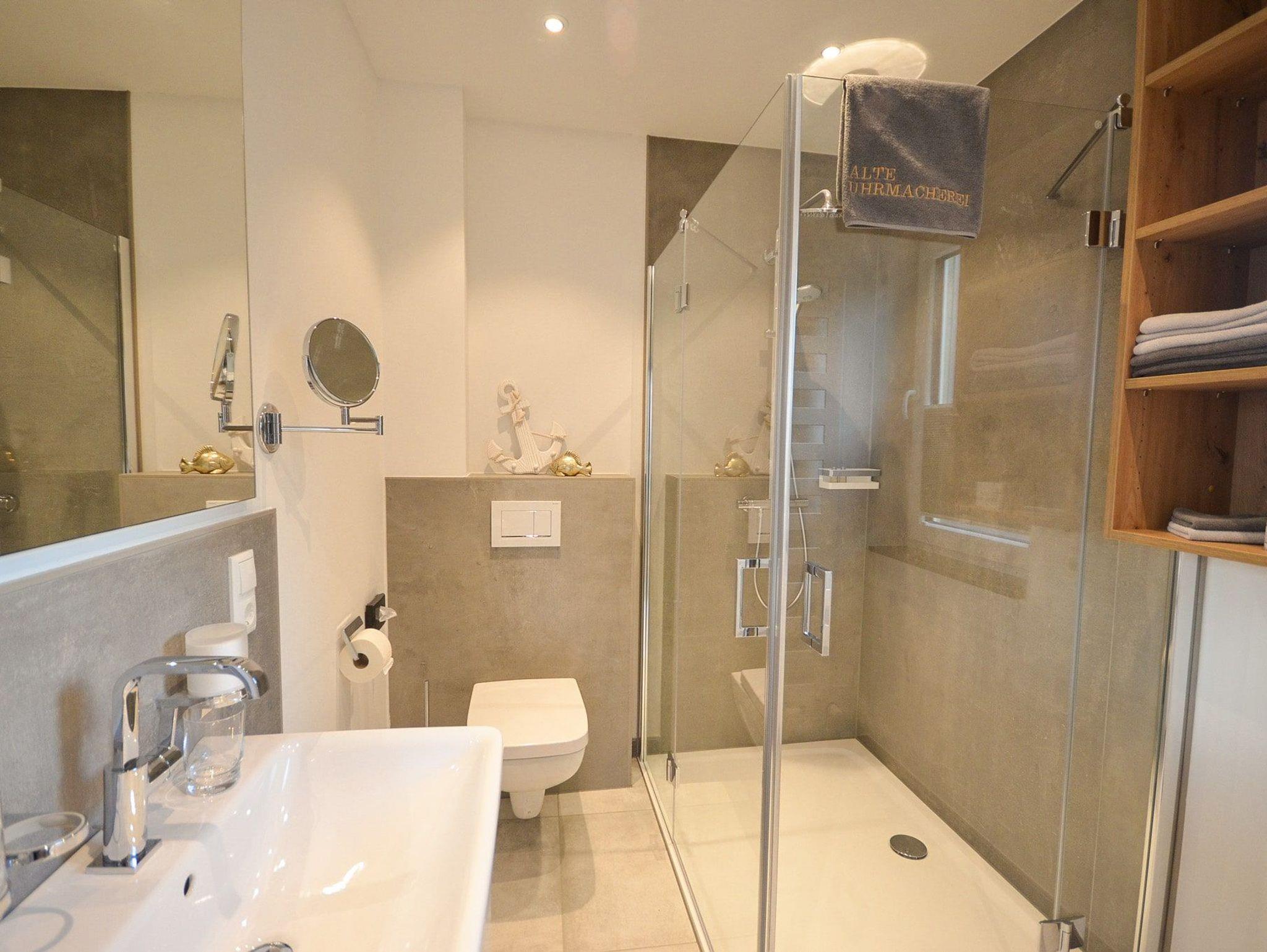 Das Tageslichtbad hat eine bodentiefe, verglaste Dusche mit Regenduschkopf und Handbrause, einen Waschtisch, einen Handtuchheizkörper und ein WC, sowie ausreichende Ablageflächen und ein Einbauradio.