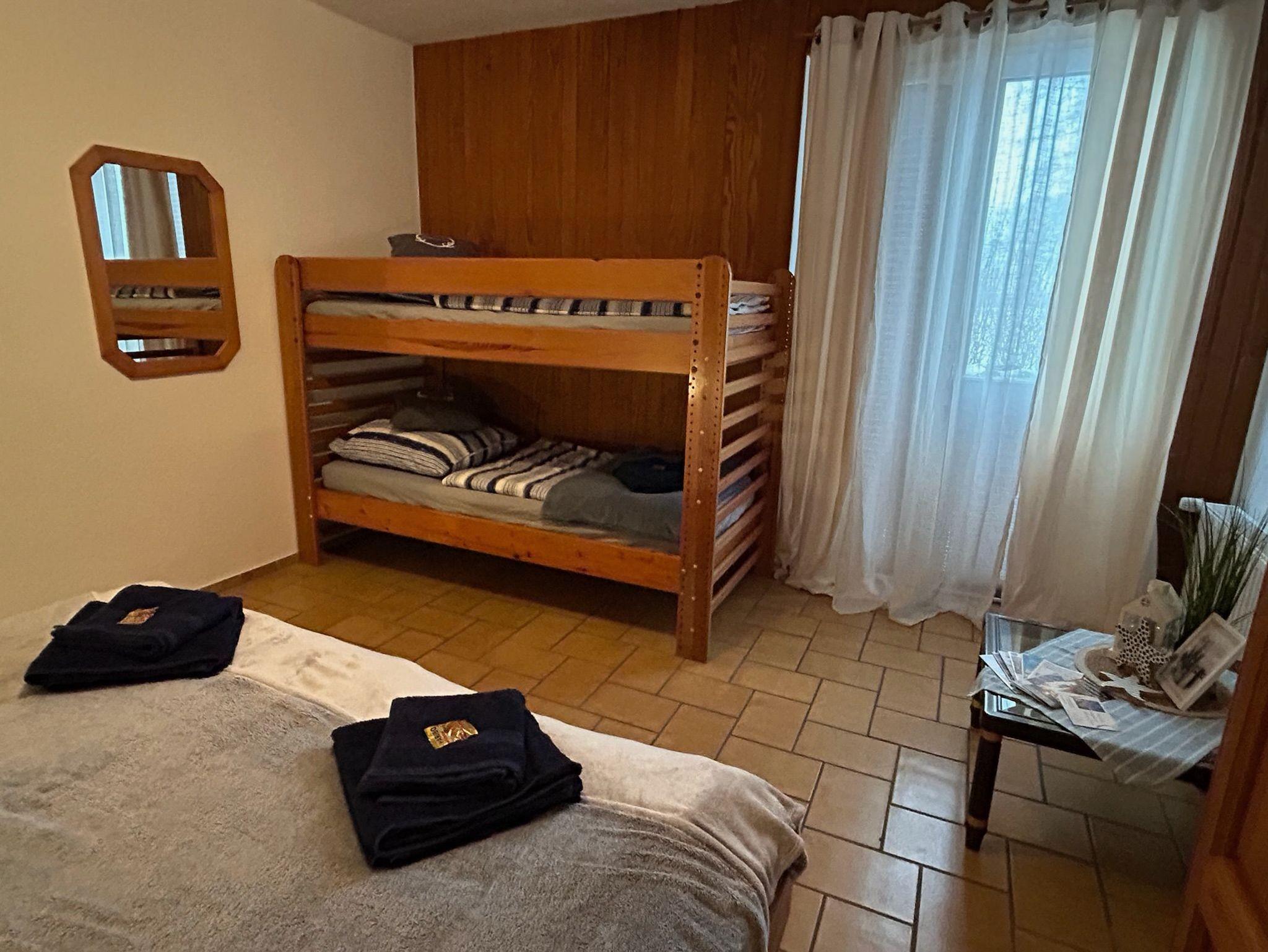 Helle, gemütliche Ferienwohnung für 2 - 4 Personen (1 Schlafraum mit Doppel- und Etagenbett), modernem Bad und einem freundlichen Wohn-Essbereich. Die gut ausgestattete Küche bietet zwei Kochplatten, einen kleinen Backofen, eine Senseo-Kaffeemaschine und einen Kühlschrank mit Gefrierfach. Eine eigene Terrasse lädt zum Entspannen ein - ideal für Paare, Familien und alle, die eine komfortable Unterkunft mit Wohlfühlatmosphäre suchen.
