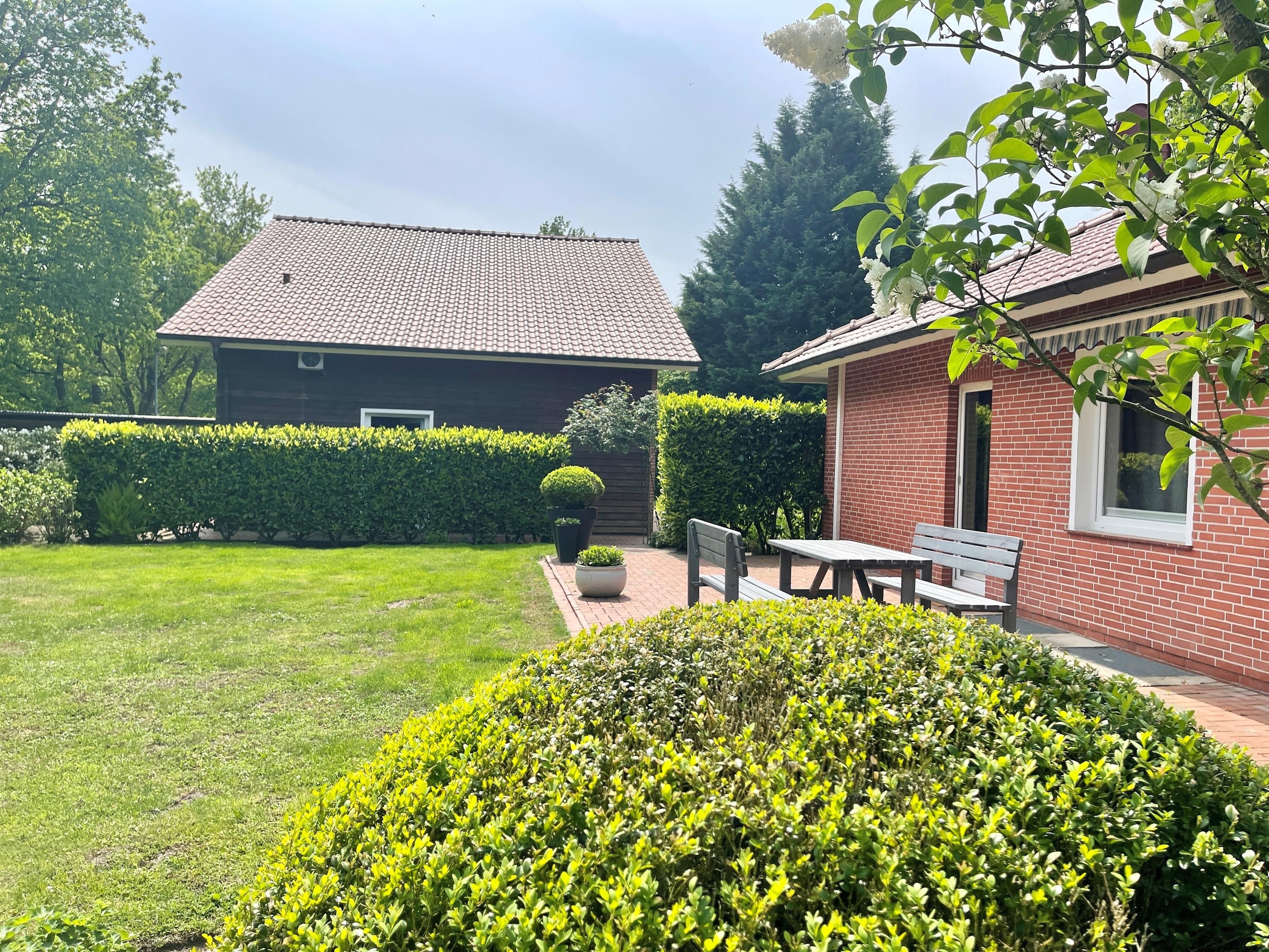 Der direkt an das Wohnzimmer angrenzende Garten mit Rosenbogen, schönen Hecken und gemütlichen Sitzgelegenheiten ermöglicht wunderbare Erholung direkt an der frischen Waldluft.