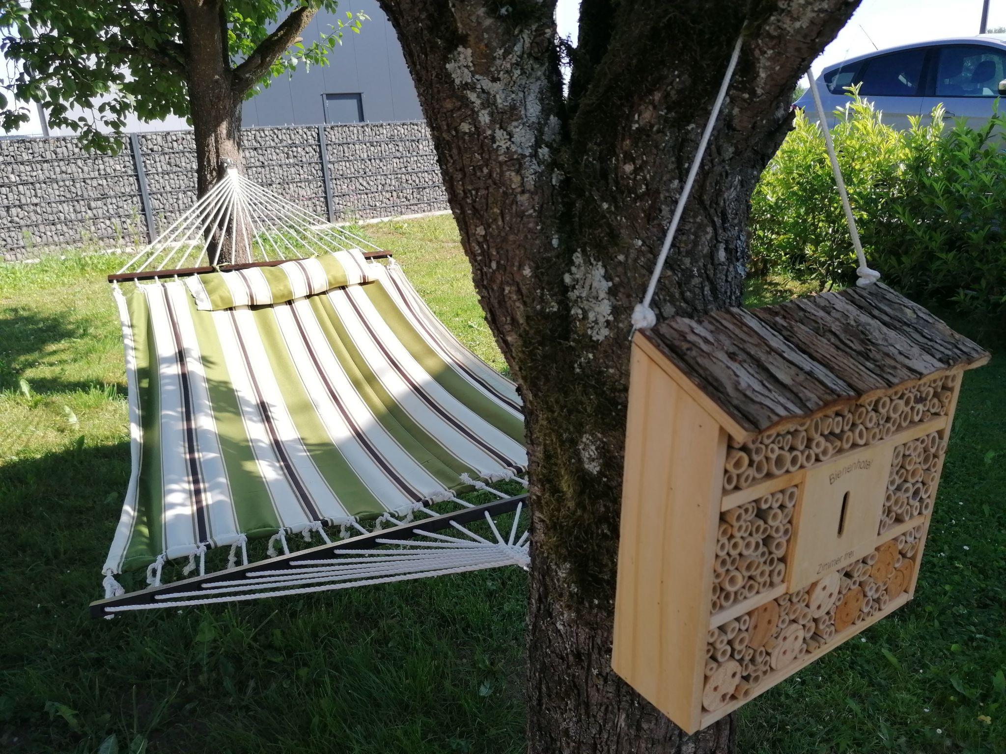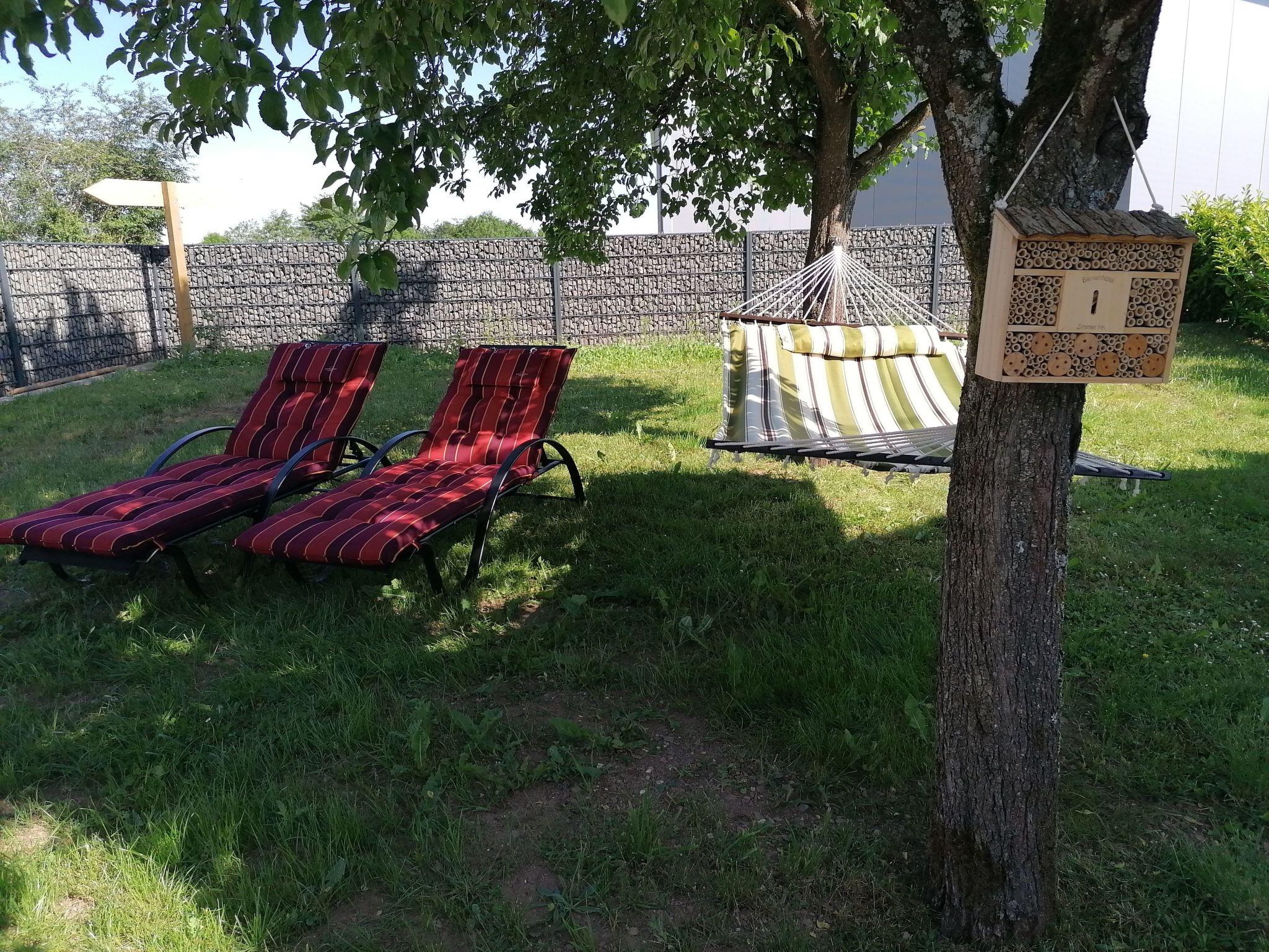 Der Außenbereich ist ein Paradies für Kinder und auch für Erwachsene die die Natur und Ruhe lieben. Im Garten ist ein Sandkasten ,Schaukel, Trampolin, Kletterturm und zwei Rutschen vorhanden. Das ganze Grundstück ist eingezäunt. Wir haben nochmals eine separate Terrasse mit Grünfläche für unsere Gäste mit Gartenmöbeln, einen Holzkohlegrill und einer tollen Hängematte. Dort sind unsere Gäste ganz für sich. Ein Parkplatz ist direkt an der Wohnung. Es können bis zu drei Autos dort parken.