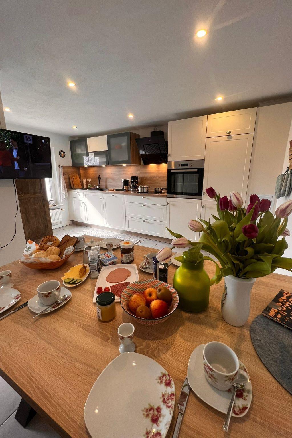 Unsere Wohnung hat eine moderne Ausstattung. Die Küche ist mit allem ausgestattet, was man braucht, wie zum Beispiel Filterkaffeemaschine, Wasserkocher, Spülmaschine, Toaster, Backofen und anderes. Wir haben in der Küche einen Fernseher hängen bzw. im Essbereich. An die kleinen wird natürlich auch gedacht. Da haben wir Spiele, Malsachen oder anderes Spielmaterial. Kostenloses Wlan ist natürlich auch vorhanden inklusive Internetfernsehen in der Küche, wie auch im Wohnzimmer. Eine Waschmaschine befindet sich auch in der Unterkunft. Wir haben einen Hochstuhl bereit stehen für die ganz kleinen und auch ein Reisekinderbett. Für die kalten Wintertage haben wir einen schönen Hochwertigen digitalen Pelletofen im Wohnzimmer Hunde sind bei uns herzlich willkommen. Katzen sind bei uns nicht gestattet.