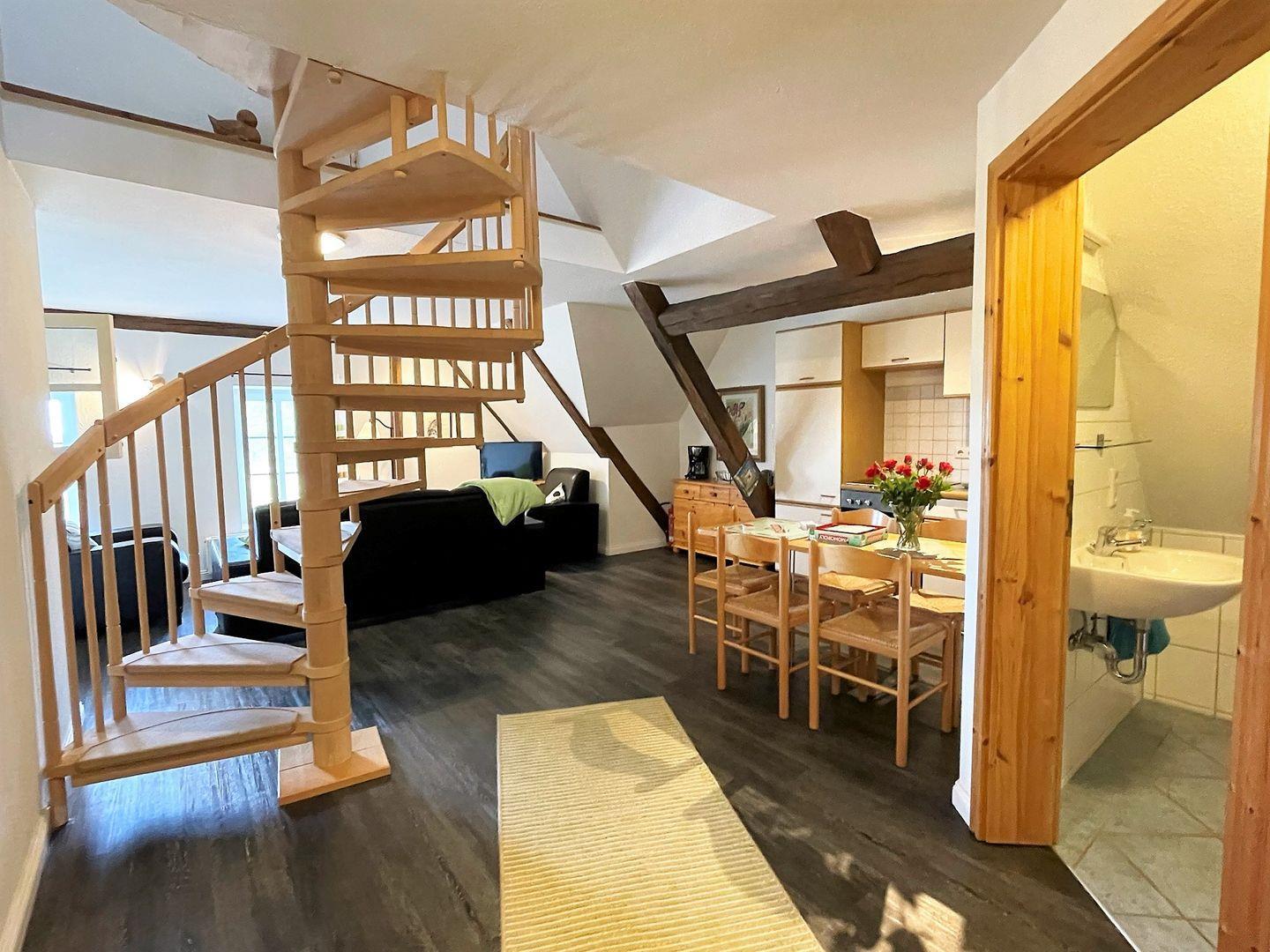 Die Wohnung verfügt über zwei gemütliche Schlafzimmer, das eine davon über eine Wendeltreppe erreichbar liegt gemütlich im Spitzboden, ideal für eine erholsame Nachtruhe. Ein modernes Badezimmer mit Dusche ermöglicht es Ihnen, sich nach einem erlebnisreichen Tag zu entspannen. Der offene Wohnbereich mit einer voll ausgestatteten Küche, die über Herd, Backofen, Spülmaschine und eine komfortable Sitzecke verfügt, ist der perfekte Ort, um gemeinsam zu essen, zu plaudern und die Zeit zu genießen. WLAN ist selbstverständlich vorhanden und sorgt dafür, dass Sie auch während Ihres Aufenthalts in Verbindung bleiben können.