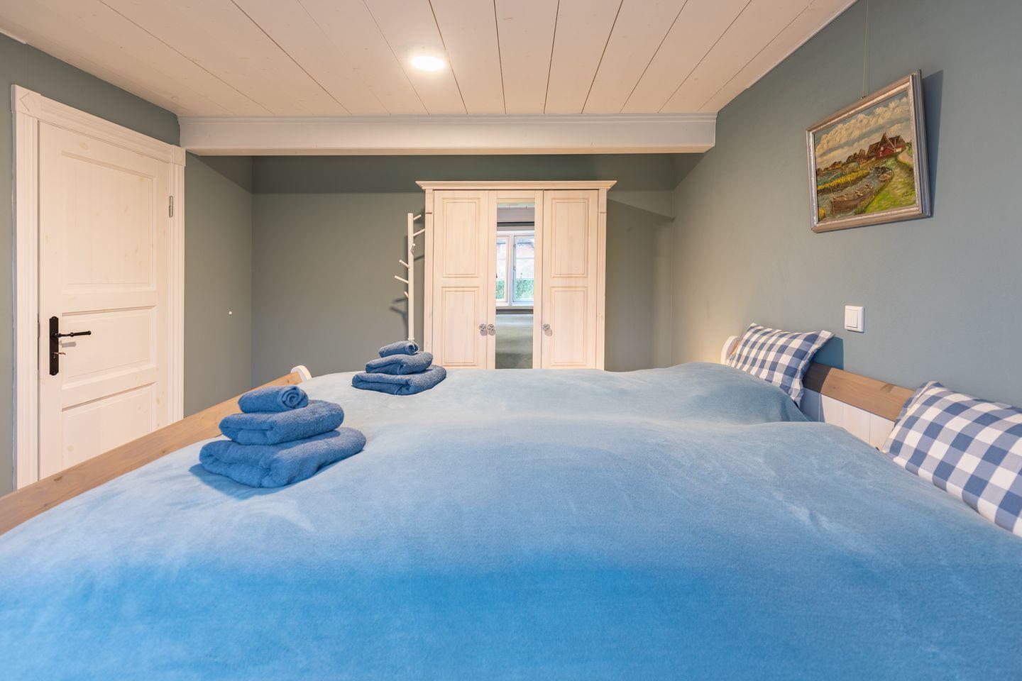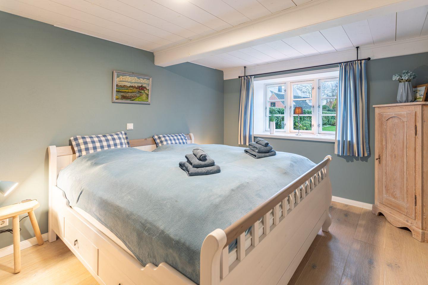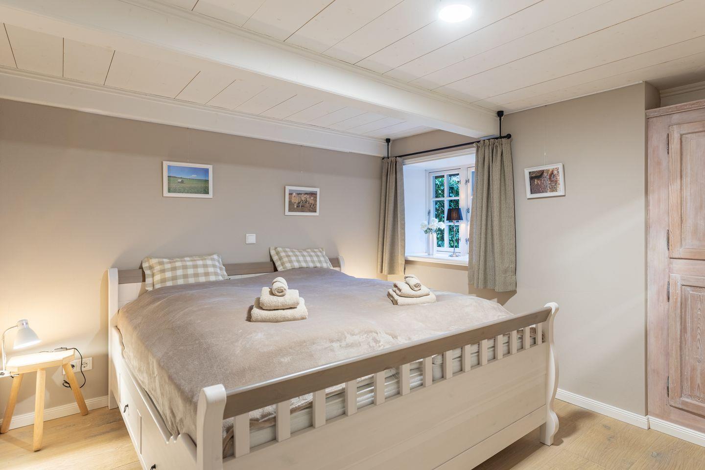 Das Ferienhaus verfügt über drei gemütliche Schlafzimmer, die eine klare und wohnliche Gestaltung zeigen. Zwei der Zimmer sind mit großen Doppelbetten (180 x 200) ausgestattet. Die ruhigen Wandfarben, das sichtbare Gebälk und die Massivholzmöbel schaffen eine behagliche Atmosphäre. Das dritte Schlafzimmer bietet zwei Einzelbetten (90 x 190). Der Raum wirkt durch die helle Gestaltung freundlich und eignet sich gut für Kinder oder mitreisende Freunde. Ein altes Kinderpult ergänzt die Ausstattung. Alle Schlafzimmer bieten ausreichend Stauraum und laden zu erholsamen Nächten ein.
