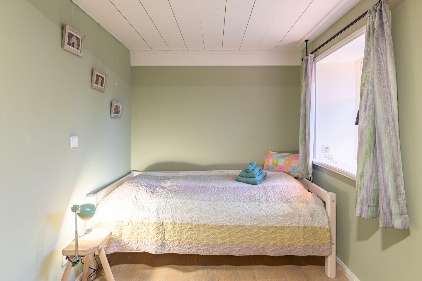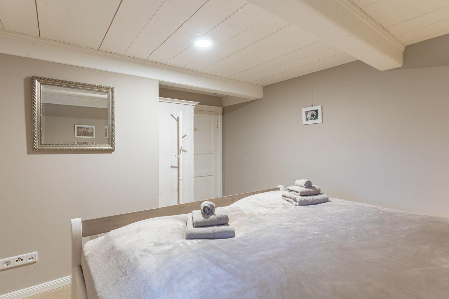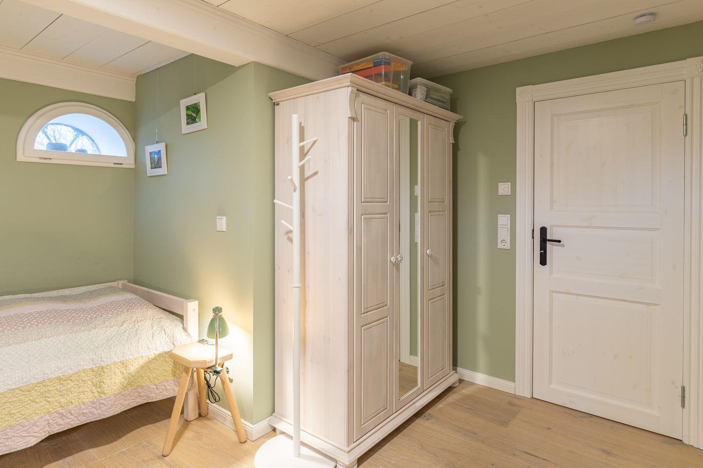 Das Ferienhaus verfügt über drei gemütliche Schlafzimmer, die eine klare und wohnliche Gestaltung zeigen. Zwei der Zimmer sind mit großen Doppelbetten (180 x 200) ausgestattet. Die ruhigen Wandfarben, das sichtbare Gebälk und die Massivholzmöbel schaffen eine behagliche Atmosphäre. Das dritte Schlafzimmer bietet zwei Einzelbetten (90 x 190). Der Raum wirkt durch die helle Gestaltung freundlich und eignet sich gut für Kinder oder mitreisende Freunde. Ein altes Kinderpult ergänzt die Ausstattung. Alle Schlafzimmer bieten ausreichend Stauraum und laden zu erholsamen Nächten ein.